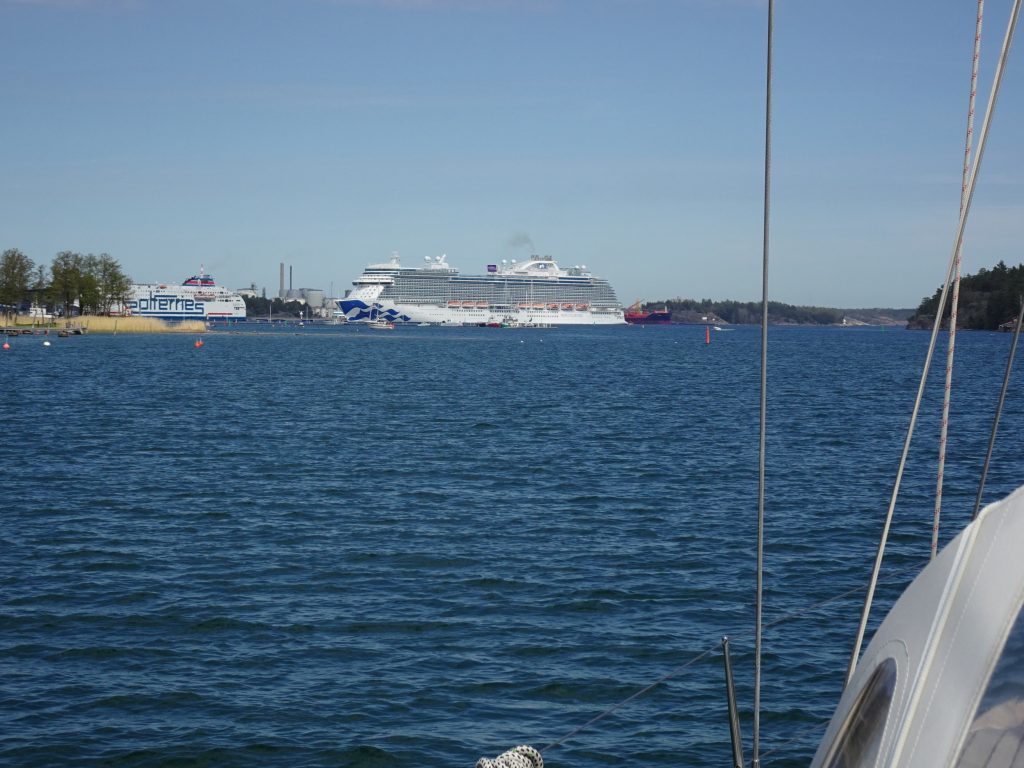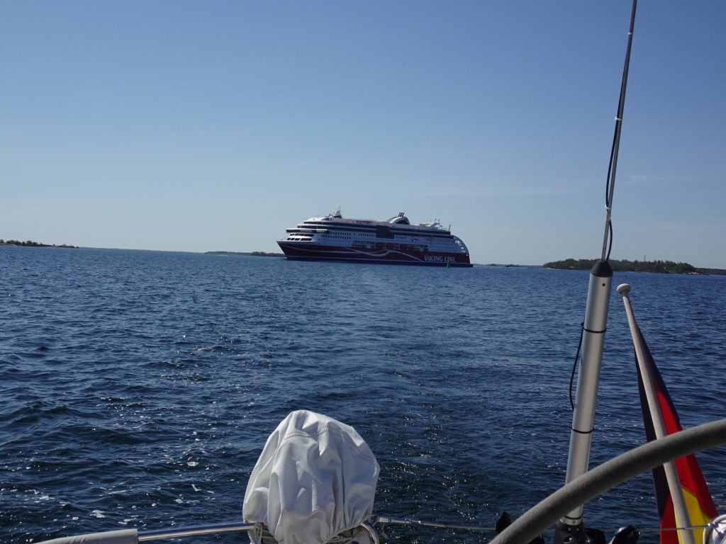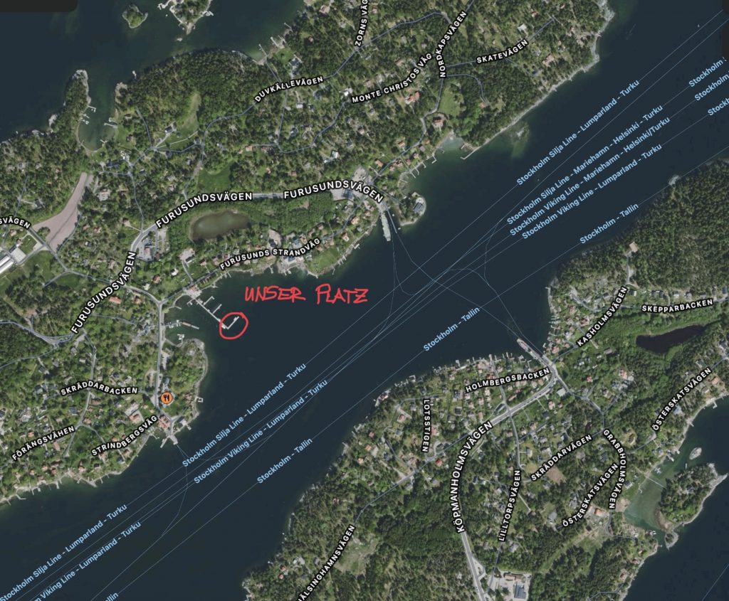 Furusund liegt direkt am Ausgang des relativ breiten, und vor allem tiefen, von den imposanten Kreuzfahrern und riesigen Fähren genutzten Fahrwassers von Stockholm gen Ålands, Helsinki, Visby/Gotland, Baltische Staaten. Auf dem Weg dahin haben wir zeitweilig 120m Wasser unter dem Kiel. Über so tiefes Wasser sind wir in der Ostsee noch selten gefahren. Die deutschen und dänischen Ostseegewässer sind meist nur 20-30m tief.