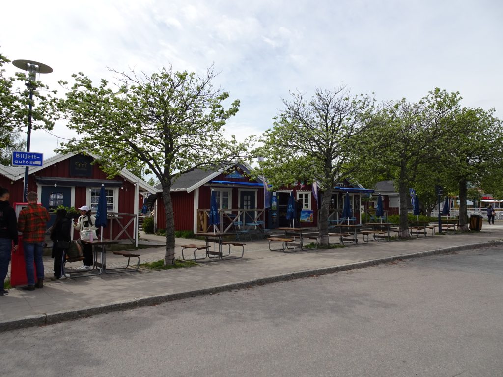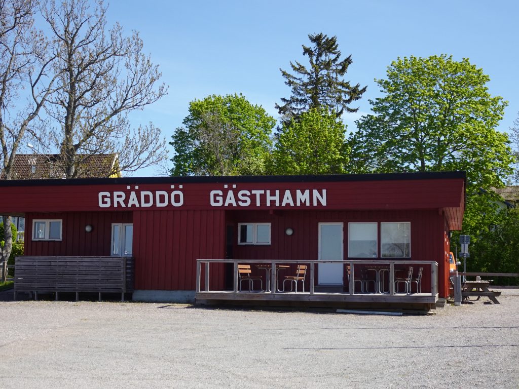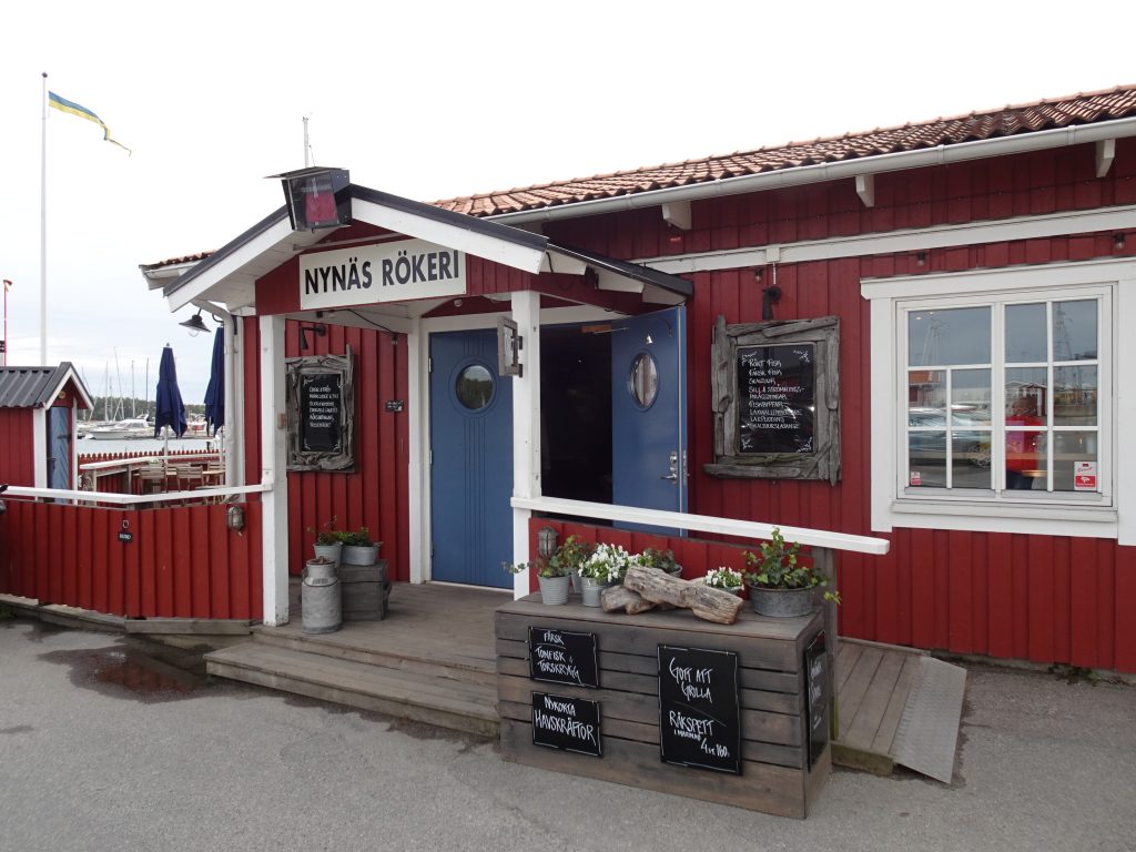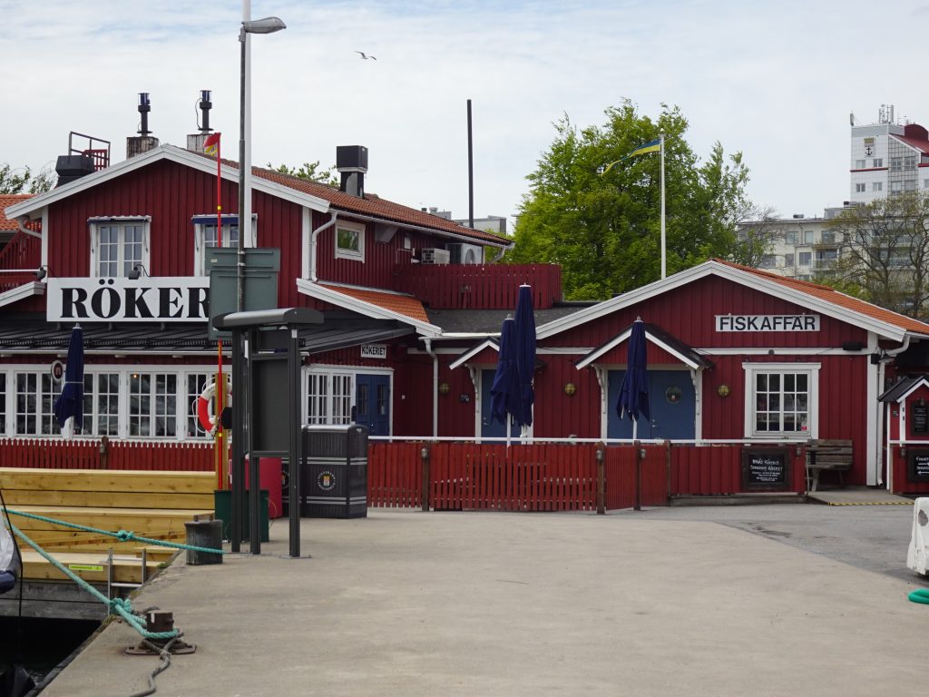 Wir haben unseren Wunsch-Liegeplatz direkt vor einer kleinen Räucherei bekommen. Hier haben wir vor sechs Jahren mit zwei Freunden schon mal festgemacht – damals allerdings bei strömendem Regen. Wurde dann aber wieder schönes Wetter. Gruß an Jörn und Werner 💁‍♀️💁‍♂️ Heute gehen und sitzen hier die Menschen an der kleinen Flaniermeile  „Havstrappan“ schon in kurzen Hosen und T-Shirt! Es ist zwar inzwischen deutlich wärmer geworden als in den letzten Tagen, aber selbst mir – und ich bin wirklich kein frösteliger Typ – ist es mit dünnerem Pulli und Sandalen (aber ohne Socken!) luftig genug. Kurze Hose kriegen wir später.