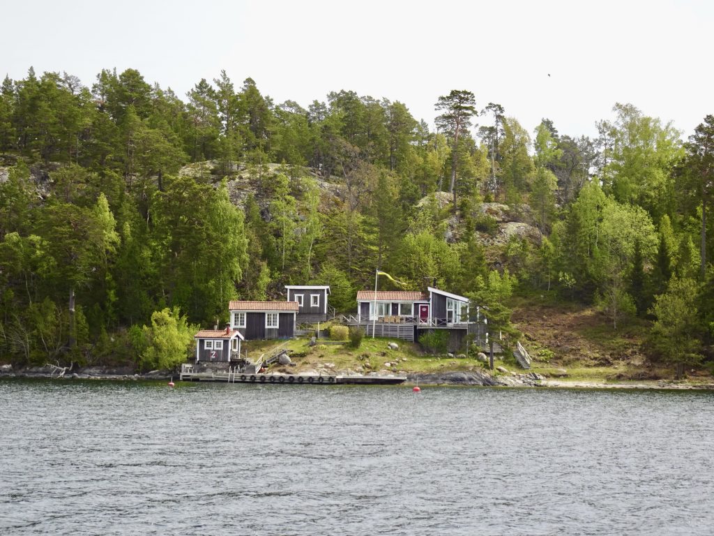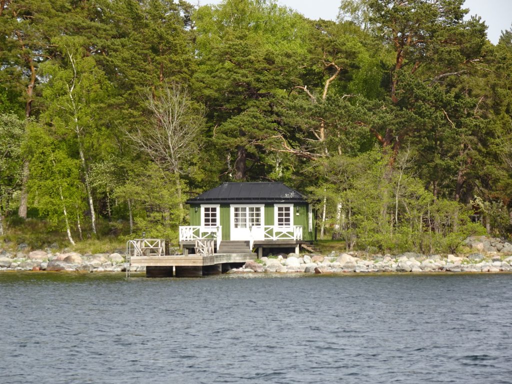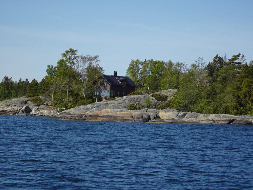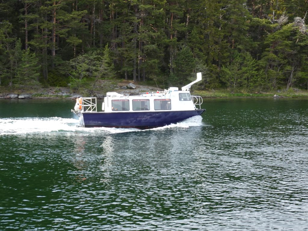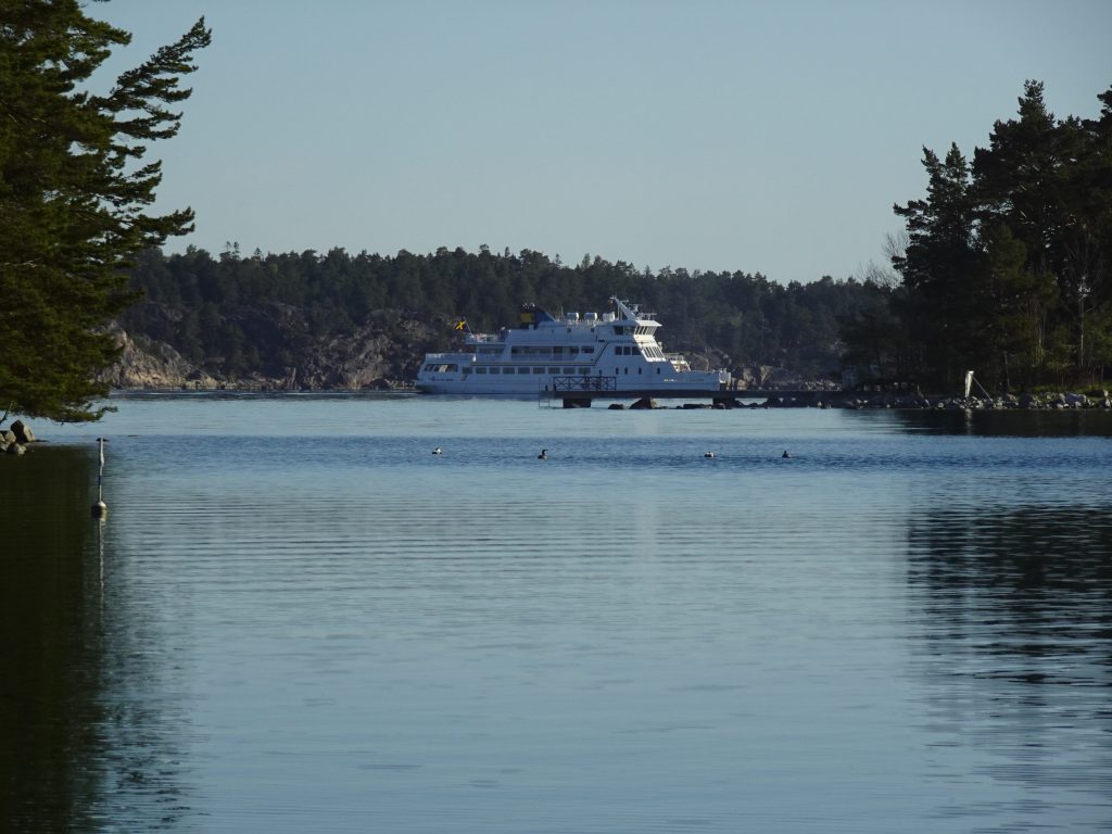 Richtung offene See geht die Landschaft von größeren, bewaldeten Inseln zunehmend in kleine, karge Felsen und Klippen über. Auf den Inseln des Archipels findet man Partyorte und mondäne Yachthäfen ebenso wie verträumte Fischerdörfer, einsame Stege und unberührte Natur. Nur 150 Inseln sind das ganze Jahr über bewohnt, aber etwa 50.000 Ferienhäuser stehen im Schärengarten. Zwischen den Insel flitzen kleine Wassertaxis und Fähren hin und her und bringen Fahrgäste auch zu entfernteren Inselchen. Sogar in der Nähe unserer Ankerbucht Norrviken /Storön legt ein kleines Boot an und holt Gäste ab.