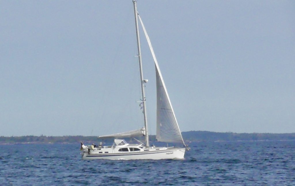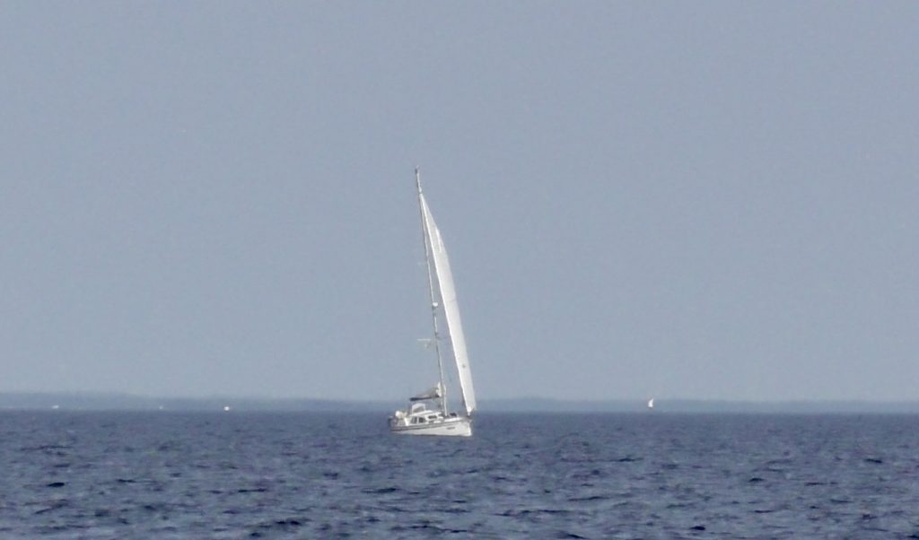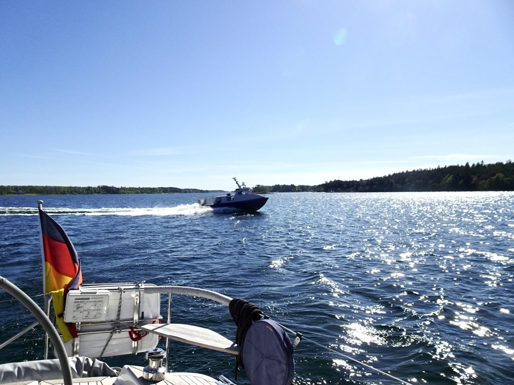 Wir wählen einen Kurs außerhalb des Schärenfahrwassers, da guter Segelwind angesagt ist. Der Wind ist auch da, allerdings auch eine blöde Restwelle vom gestrigen Starkwind, sodaß wir unseren Kurs eher nach der Welle als dem Wind richten müssen. Das beschert uns sowohl einen Umweg, als auch ein ähnliches Geschaukele, wie die Nacht über. Und richtig voran kommen wir auch nicht. Irgendwann geben wir auf und der Jockel muss ran.