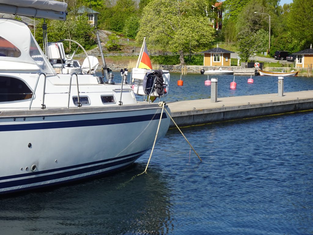 Schon beim Ansteuern des kleinen Hafens gucken wir ganz erstaunt: am Steg liegt eine Nordship und der Eigner ist sogar an Bord. Wir winken uns gleich zu und der Eigner ist uns beim Anlegen behilflich – hier liegen Mooringleinen aus, für die man gerne eine zusätzliche Hand  in Anspruch nimmt und wir kommen nach erfolgreichem Anlegemanöver nett ins Gespräch.