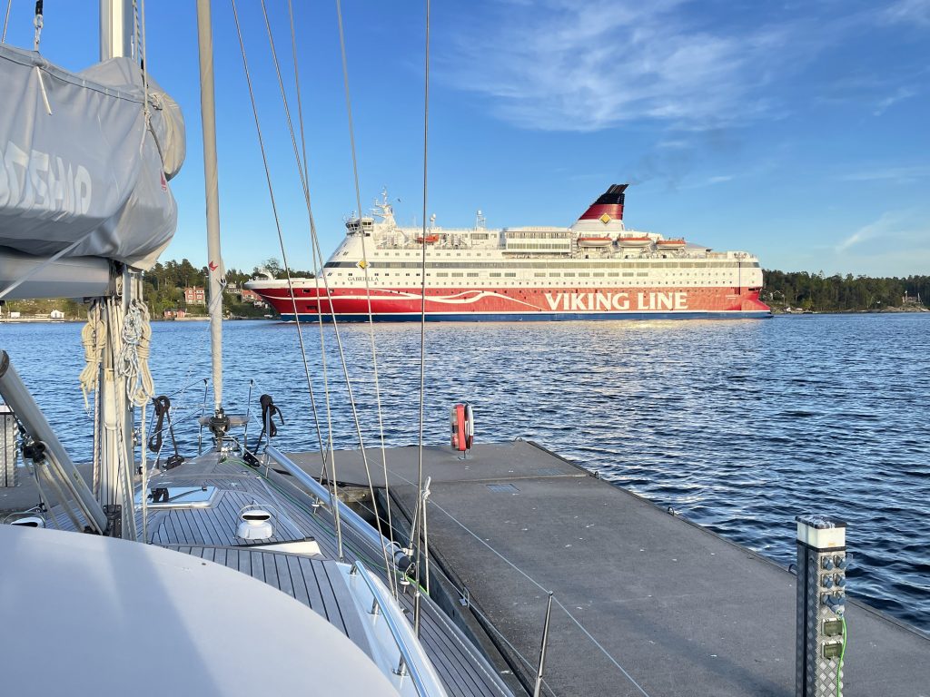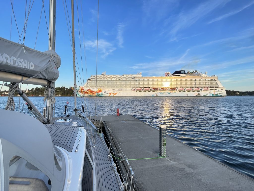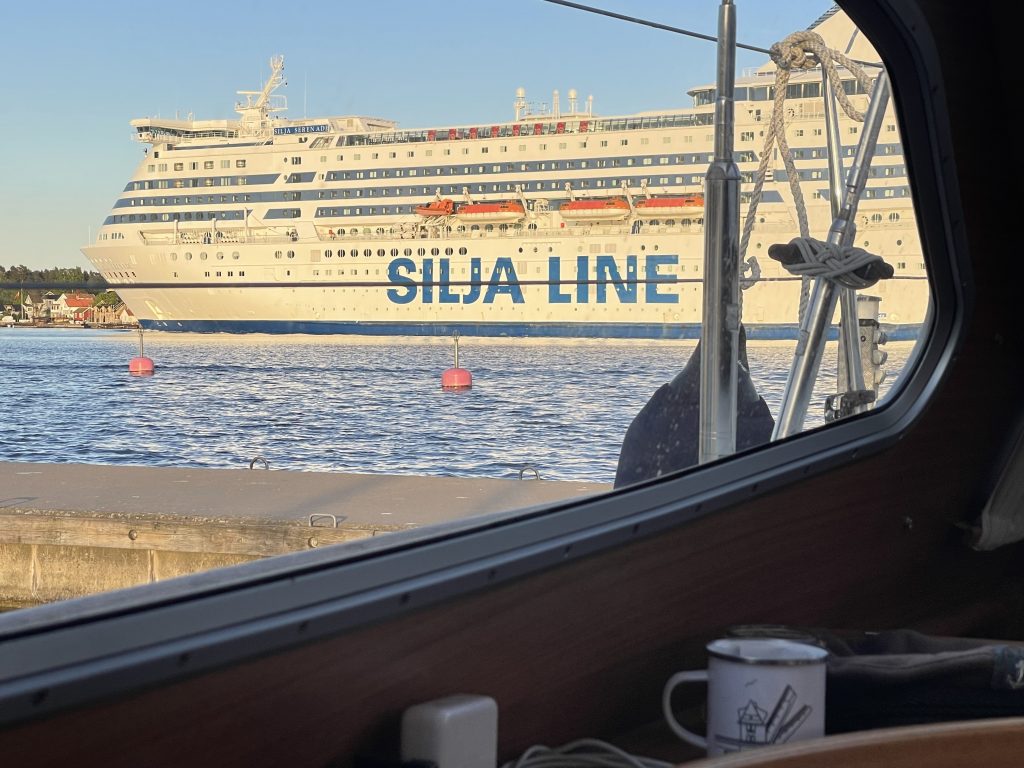 Einige Meilen vor dem Zielhafen werden wir plötzlich angefunkt. Die „CarpeDiem“ mit Anita und Dieter, mit denen wir in einem anderen Hafen schon mal nett geschnackt haben, hat uns auf MarineTraffic verfolgt und jetzt bei der Anfahrt auf Nynäshamn gesehen. Dieter warnt uns vor: „der Hafen ist rappelvoll. Ihr legt euch am Besten längsseits an den Kreuzfahrer – da ist Platz.“ Glücklicherweise nur ein Joke. Dieter steht dann auch am Steg, um unsere Leinen anzunehmen. Wie nett!