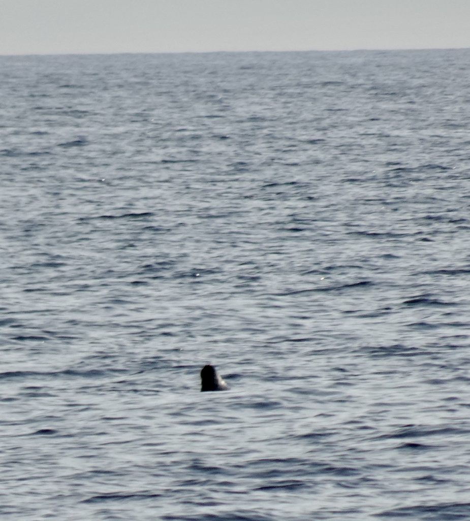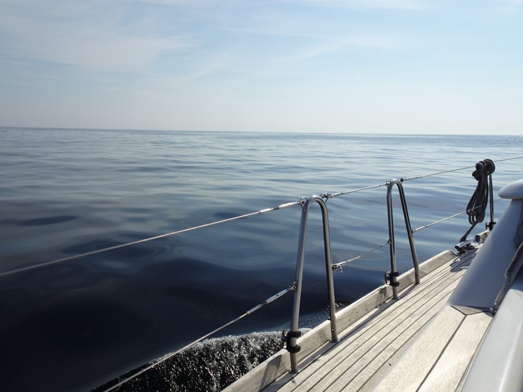 Gesegelt wird dann aber heute leider doch nicht, denn wir haben nur 4-5 Knoten Wind, das sind nur 2 Bft, und die auch noch direkt von achtern – das mag unser Schiff garnicht und kommt kaum in Fahrt. Und da wir mit unserem Jockel – bei spiegelglatter See – auch etwa 4-5 Knoten fahren, ist es mit der Abkühlung durch Fahrtwind leider nichts: 4 Knoten Wind von hinten plus 4 Knoten Fahrtwind von vorne = 0 Wind (in Worten: Null Wind) an Bord. Mist. Der Sommer ist voll angekommen – klasse 👍🌞😎 – und es ist wirklich richtig warm hier. Manchmal sieht das Wasser – ohne jeden Windhauch – richtig ölig aus. Einige Seehunde lassen sich blicken und stecken ihre in der Sonne silbrig glänzenden Köpfe neugierig aus dem Wasser.