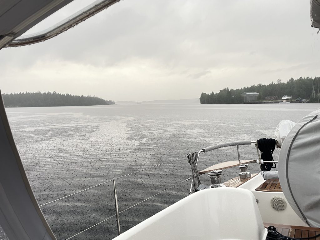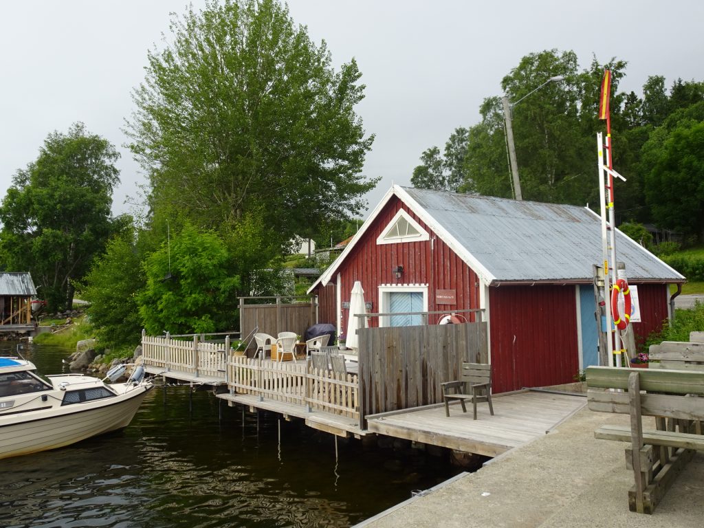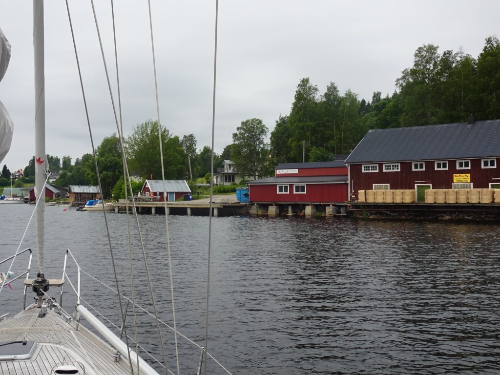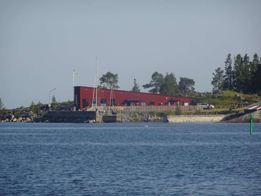 Morgens ist wieder alles friedlich. Doch da ab Mittags wieder viel Wind und Gewitter angesagt ist, legen wir zügig ab und suchen uns eine geschützte Bucht. Die dort eigentlich ausliegende SXK-Boje ist zwar nicht da, aber eine prima kleine Pier – vor einer Fischfabrik für Surströmming. 🤷 Mmmhh… ob das der richtige Platz zum anlegen ist?