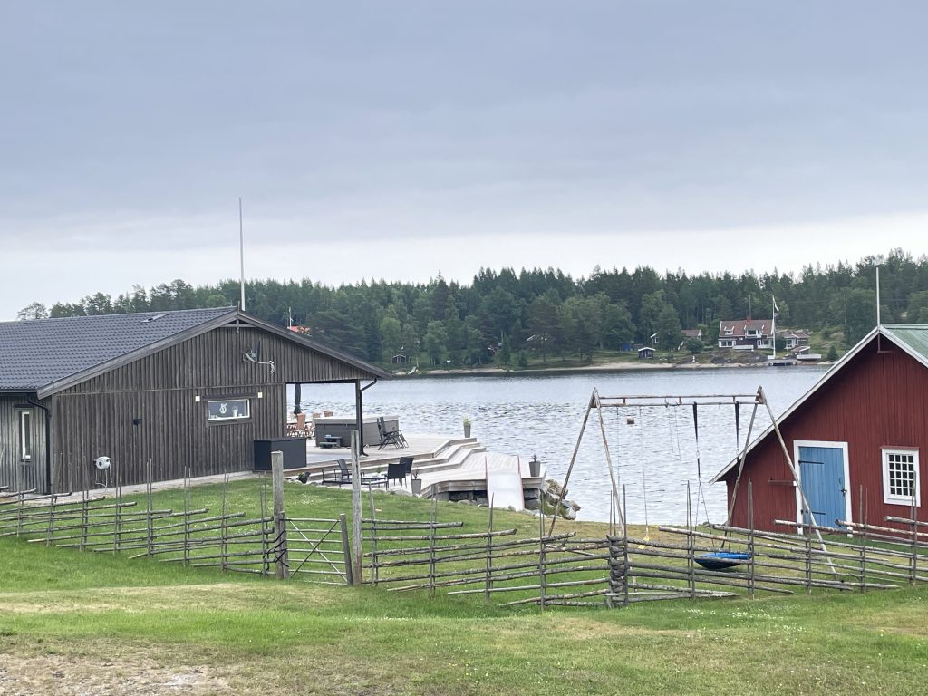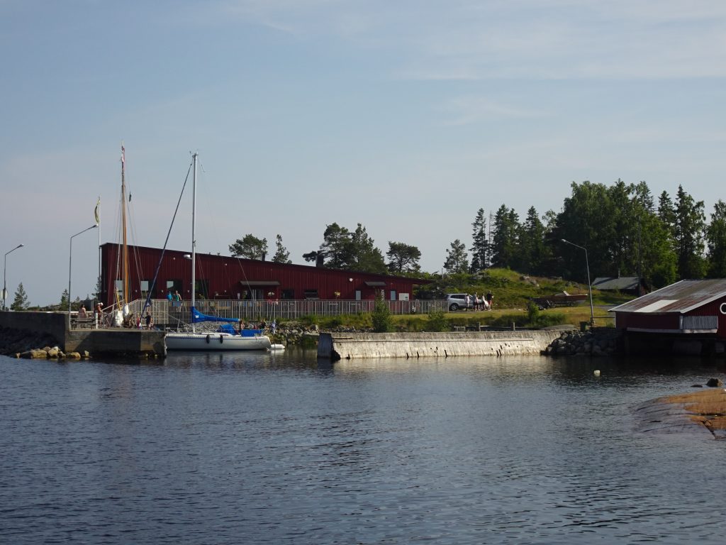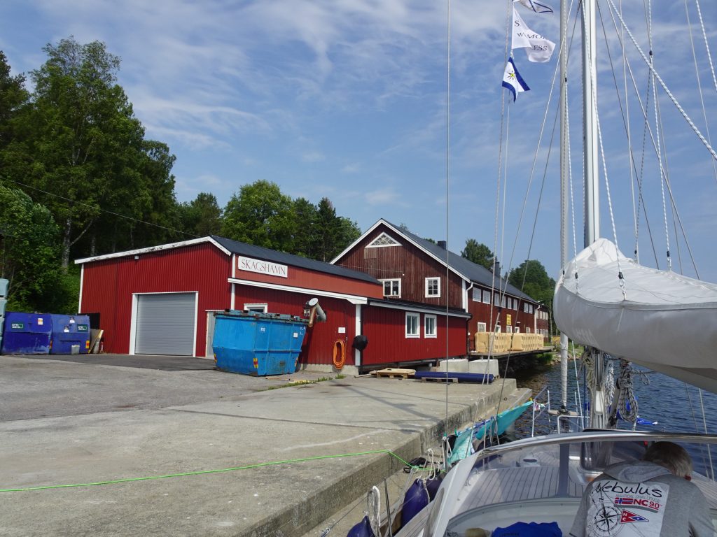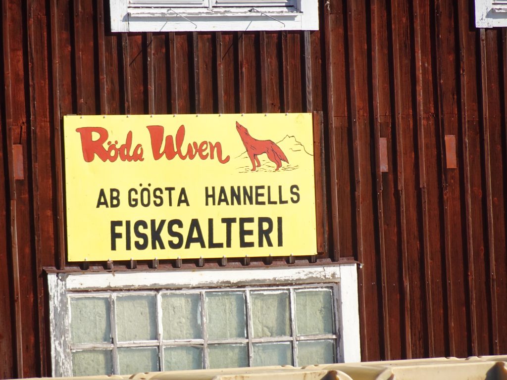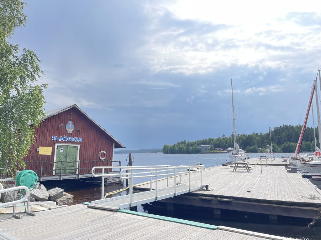 Morgens ist wieder alles friedlich. Doch da ab Mittags wieder viel Wind und Gewitter angesagt ist, legen wir zügig ab und suchen uns eine geschützte Bucht. Die dort eigentlich ausliegende SXK-Boje ist zwar nicht da, aber eine prima kleine Pier – vor einer Fischfabrik für Surströmming. 🤷 Mmmhh… ob das der richtige Platz zum anlegen ist?