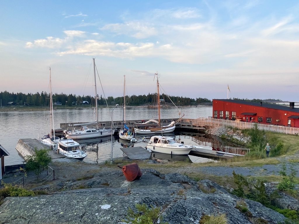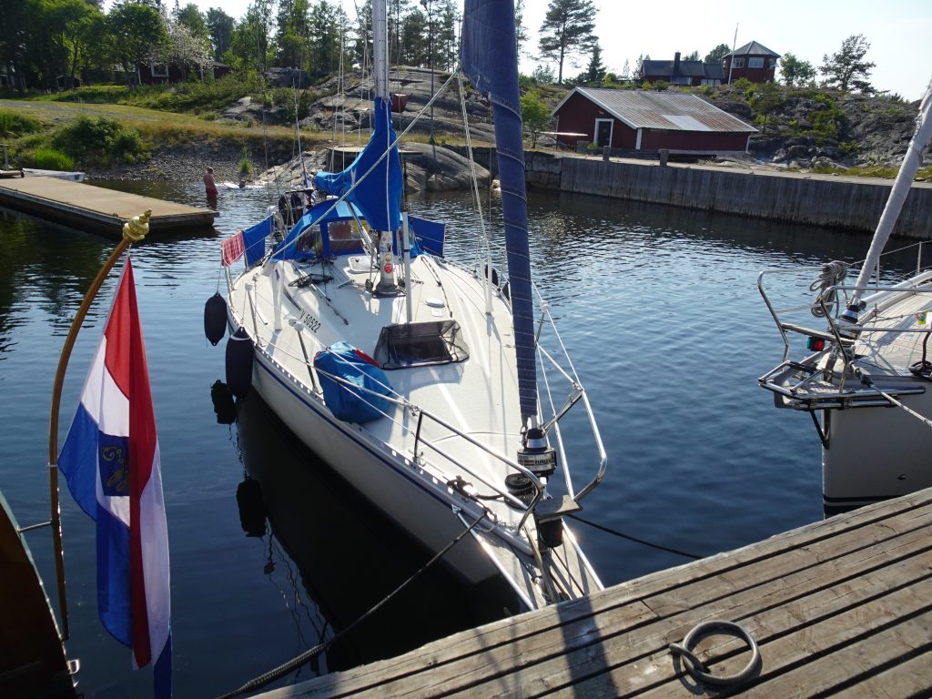 Unser Alternativ-Ziel Järnäshamn bietet zwei Optionen: einen minikleinen Hafen und eine Ankerboje des schwedischen Seglerverbandes (sxk). Doch als wir ankommen, ist diese natürlich besetzt. Und der Hafen – ein ehemaliger Fischereihafen – ist so winzig und nur im vorderen Bereich mit 3m tief genug für uns, dass wir nicht glauben, da hineinzupassen. Zumal kurz vor uns ein holländisches Plattbodenschiff einläuft und schon ein finnischer Segler längs an der Mole liegt. Damit ist die Mole aber voll und die kleine zweite Mole sieht auch nicht grade passend für uns aus. Doch jetzt kommt wieder die finnische Freundlichkeit: der Finne paddelt mit seinem Schlauchi rüber zur kleinen Mole und misst für uns die Wassertiefe: nur 1,9m, also nichts für uns. Dann ruft er zu uns rüber: „come in, I go anchor“. Wir glauben es kaum. Erst sammelt er seine im Hafen schwimmenden Kids ein (ca. 3+4), dann dreht er sein Schiff von der Mole weg – der Bug bleibt aber fest – und wirft seinen Heck-Anker ins Wasser. Damit ist für uns Platz an der Mole und wir fahren vorsichtig rein. Passt alles wie verrückt! Und schwups… schon sind die Kids wieder im Wasser. Bei viel Wind wäre das alles natürlich so nicht wirklich möglich gewesen. Kurz nach uns kommt noch ein weiterer Segler, dessen Tiefgang für die kurze Mole paßt. Nun ist die Hafeneinfahrt allerdings fast zugeparkt und es kann sich nur noch ein kleines Motorschiff mit wenig Tiefgang vorsichtig mitten in den Hafen schleichen.