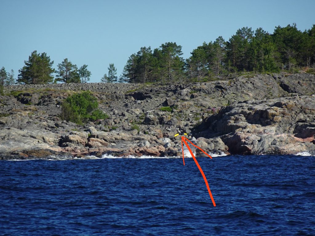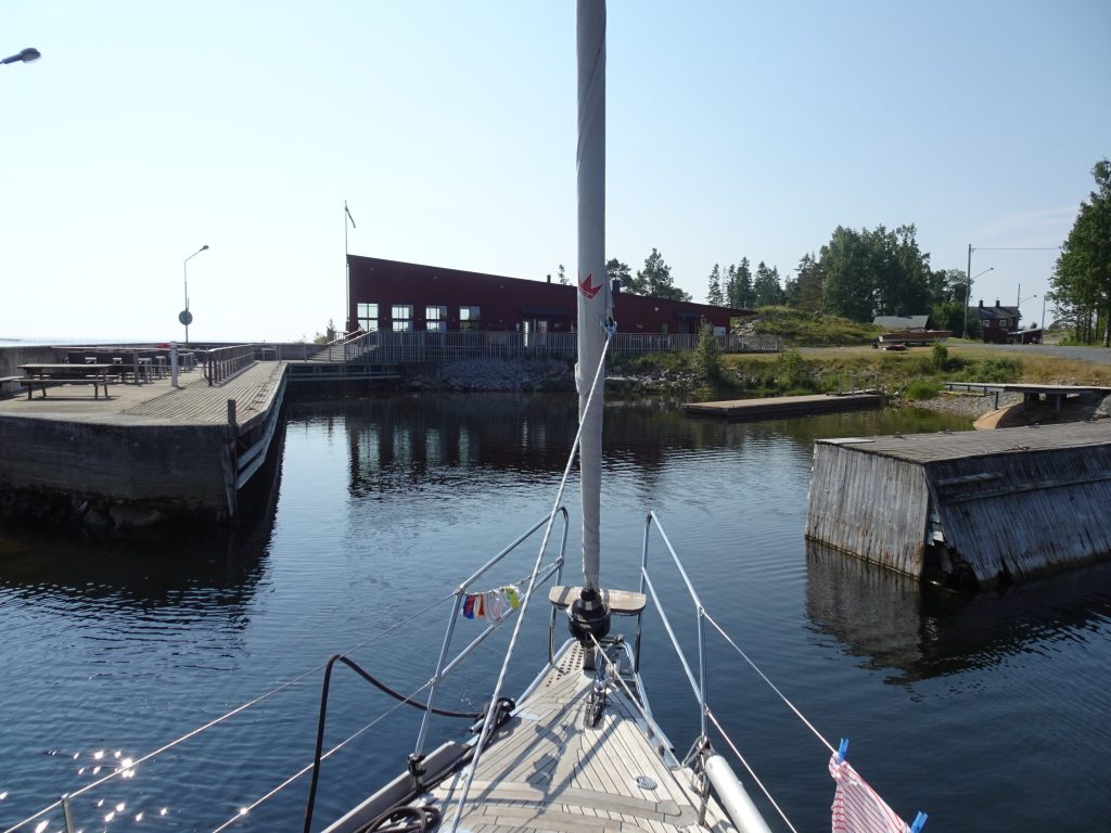 Trotz der Hitze genießen wir die Motorfahrt und freuen uns auf einen ruhigen Anlege-Steg zwischen einigen Schären. Doch bei näherer Betrachtung scheint der angepeilte Steg den winterlichen Eisgang nicht überlebt zu haben: einem höheren Pier fehlen diverse Bretter und ein kleinerer langer Steg liegt wie ein Fragezeichen auf dem Wasser… das sieht alles nicht sehr einladend aus und ist von der Landseite aus auch gesperrt. Leider habe ich vor lauter Erstaunen über den maroden Steg das fotografieren vergessen. Die Anlegestelle Norrbyskär gibt es an dieser Stelle also nicht mehr und der in einer Bucht etwas weiter nördlich gelegene neue Steg schwimmt leider auf für uns zu flachem, nur 2m tiefem, Wasser.