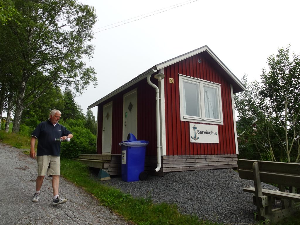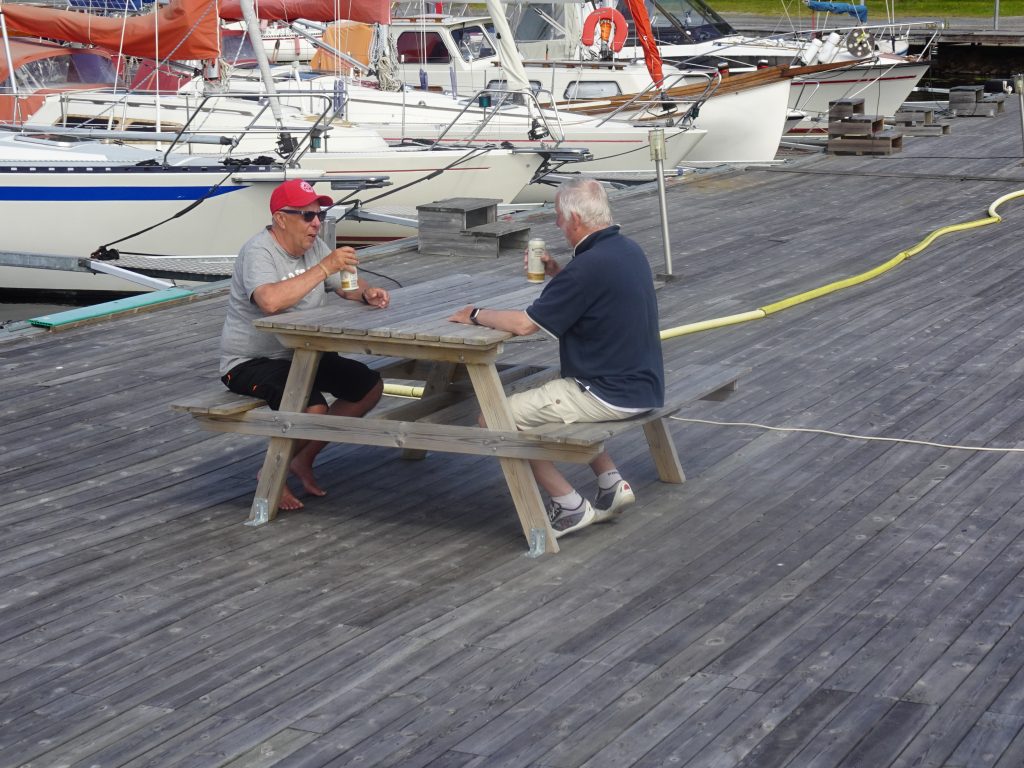 Die obigen Hering-Infos sind übrigens aus erster Hand, denn ein älterer Schwede – vielleicht wieder ein „Hilfs-Hafenmeister“? – begrüßt uns freundlich und zählt uns sogleich die Vorzüge unserer Anlegestelle auf: das beste Trinkwasser überhaupt – wird wegen der Fischverarbeitung genauestens überprüft – ein kleines Servicegebäude mit Dusche und Küche, ein netter Sitzplatz direkt am Pier und überhaupt… es ist schön hier. Der angesagte und auch eintreffende Wind treibt später am nachmittag ordentlich viele Wolken in die Bucht, die sich dann aber kurz vorm Hafen auflösen. Prima! Es wird zwar reichlich böig, aber bleibt (meist) sonnig. So gefällt uns das!
