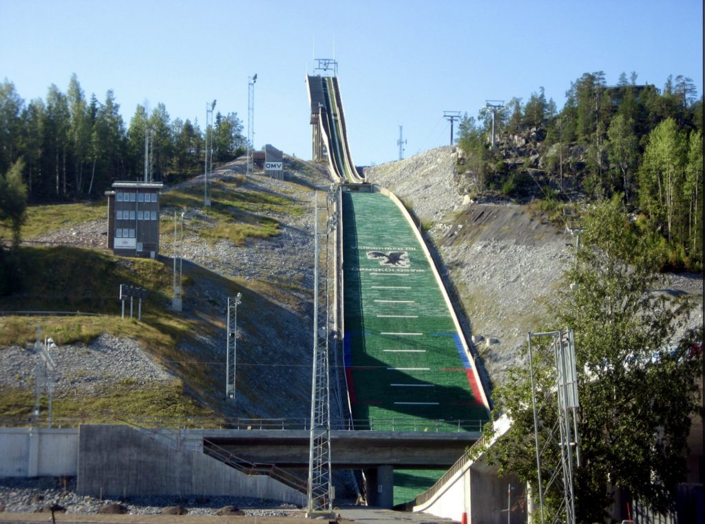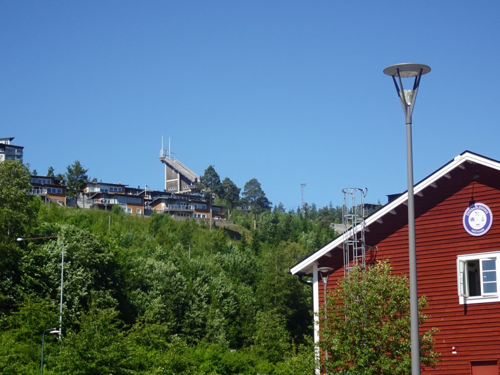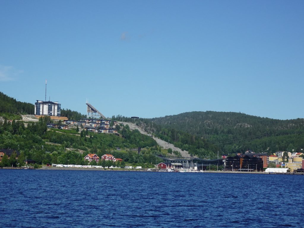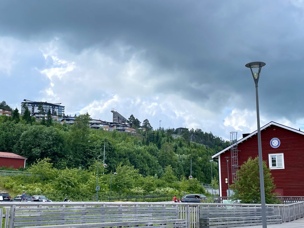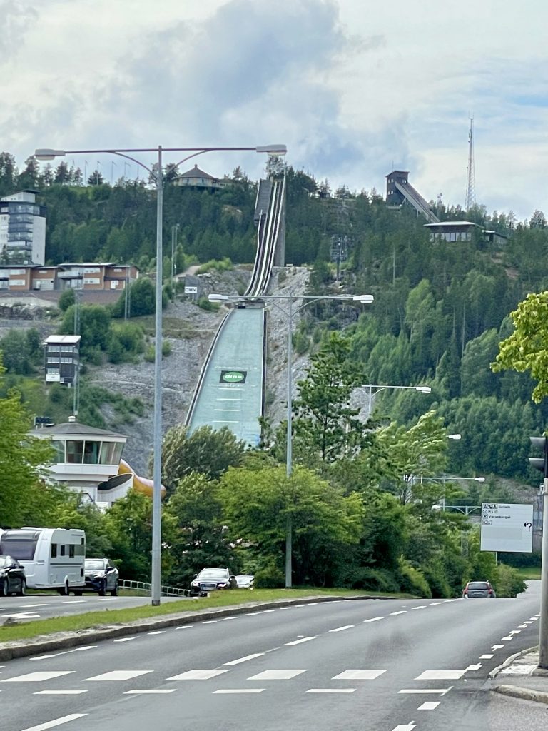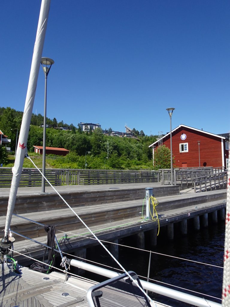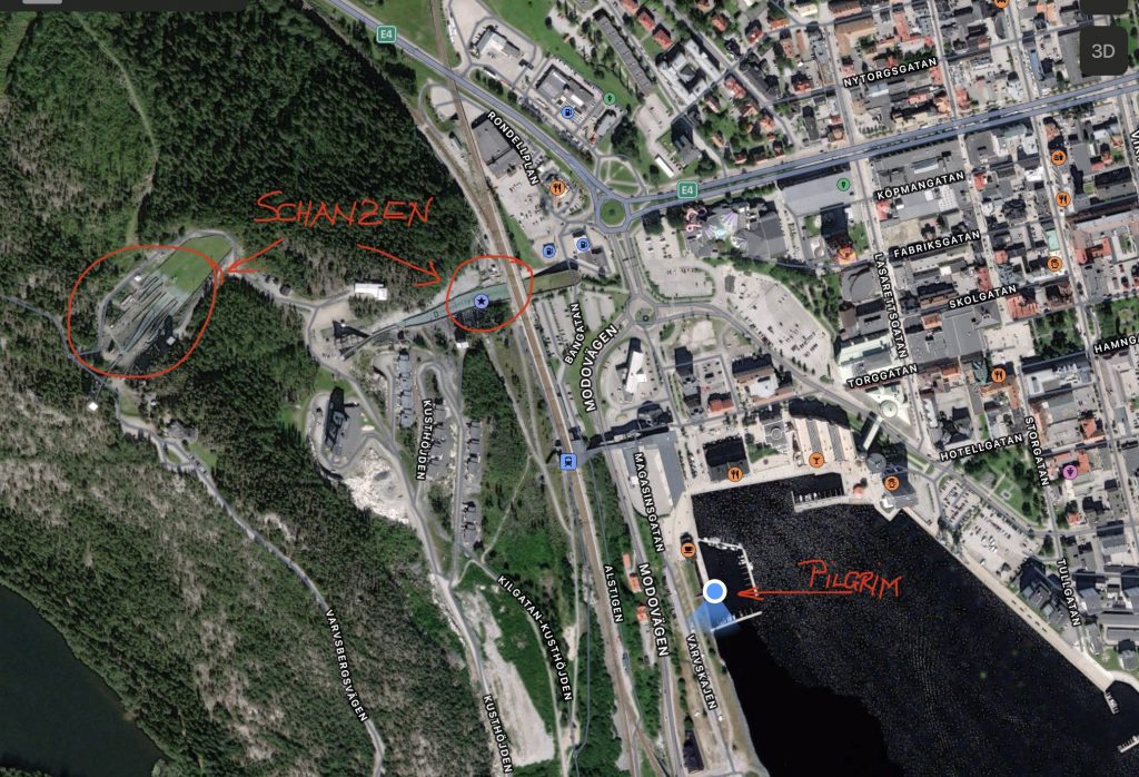 Übrigens haben wir das erste Mal einen Liegeplatz mit Blick auf eine Skisprung-Schanze. Der Paradieskullen, eine Anlage mit unterschiedlich großen Schanzen, ist zwischen 1961 und 1992 entstanden und war die erste Mattenschanze Schwedens. Die Schanze hat sich zum Skisprung- und Kombinationszentrum Schwedens entwickelt und das hiesige Skigymnasium ist das einzige im Land, in dem gesprungen wird. Wegen des Baus der Botniabana, einer 190km langen Bahnstrecke von Västeraspby (etwa 80km südwestlich von Övik) nach Umeå, wurde eine der Schanzen 2004 abgerissen und um 40 m versetzt wieder aufgebaut. Die Eisenbahnstrecke führt auf einer Brücke über den Auslauf der Schanze.
