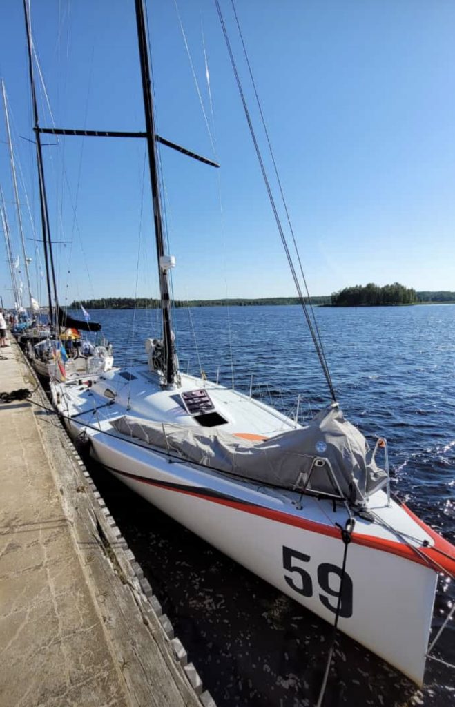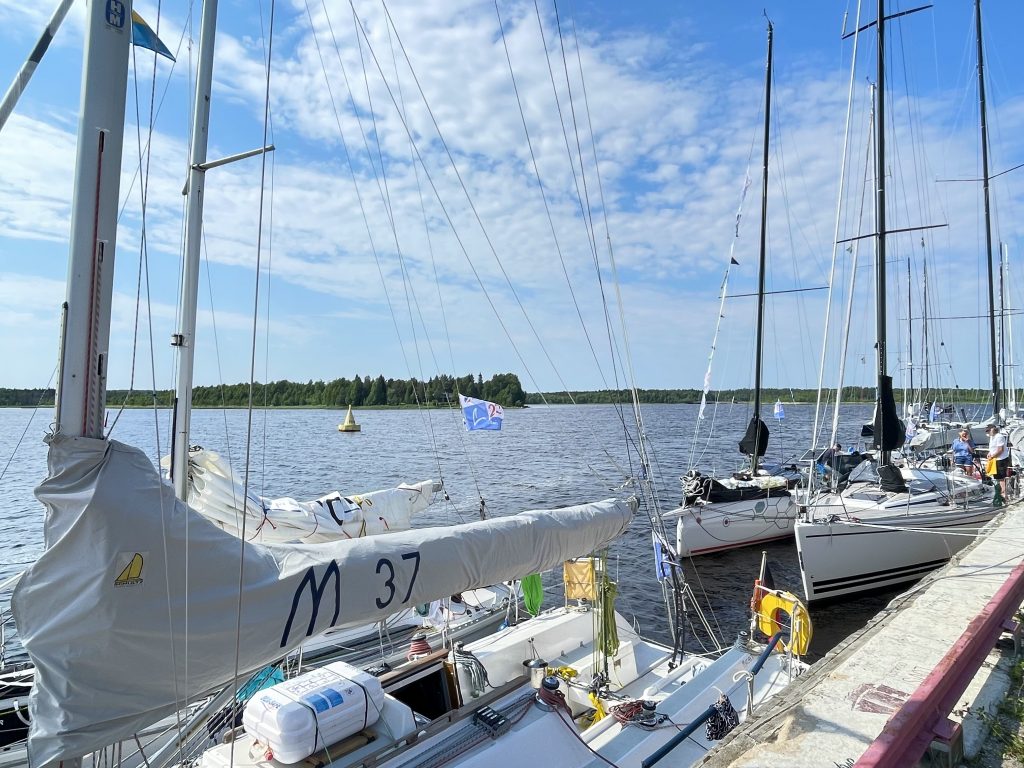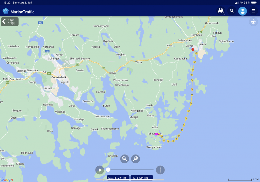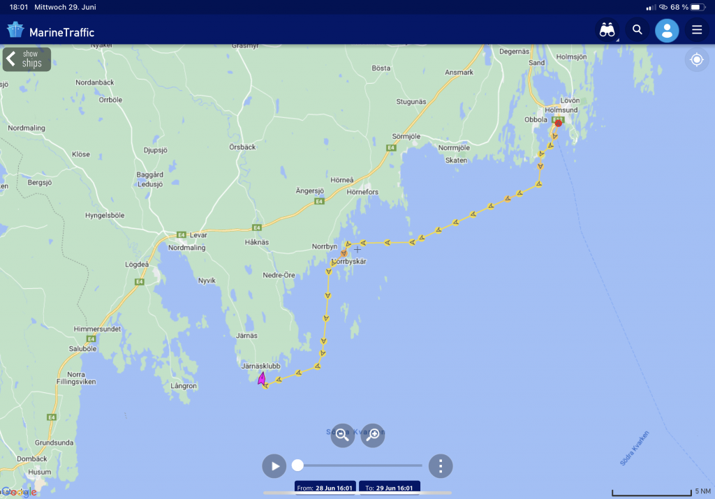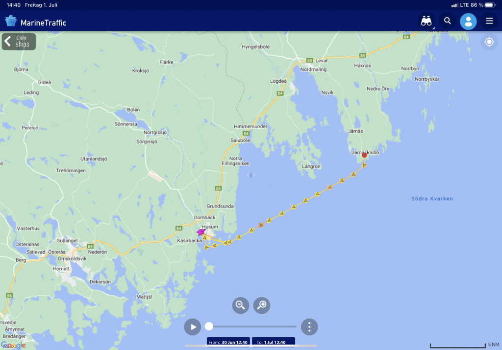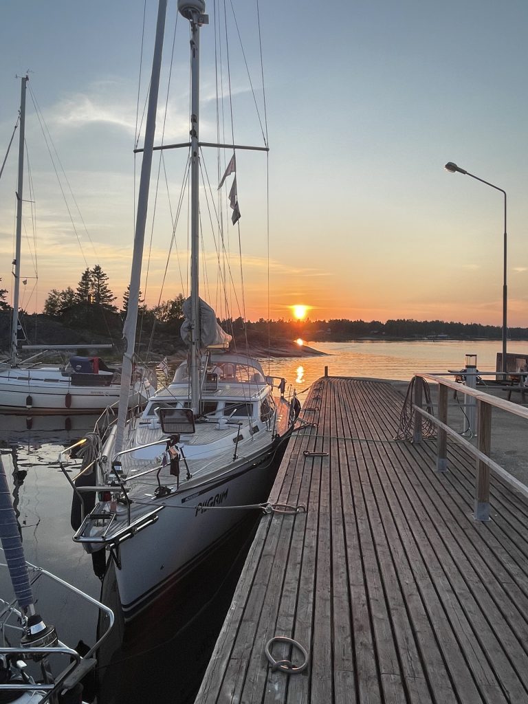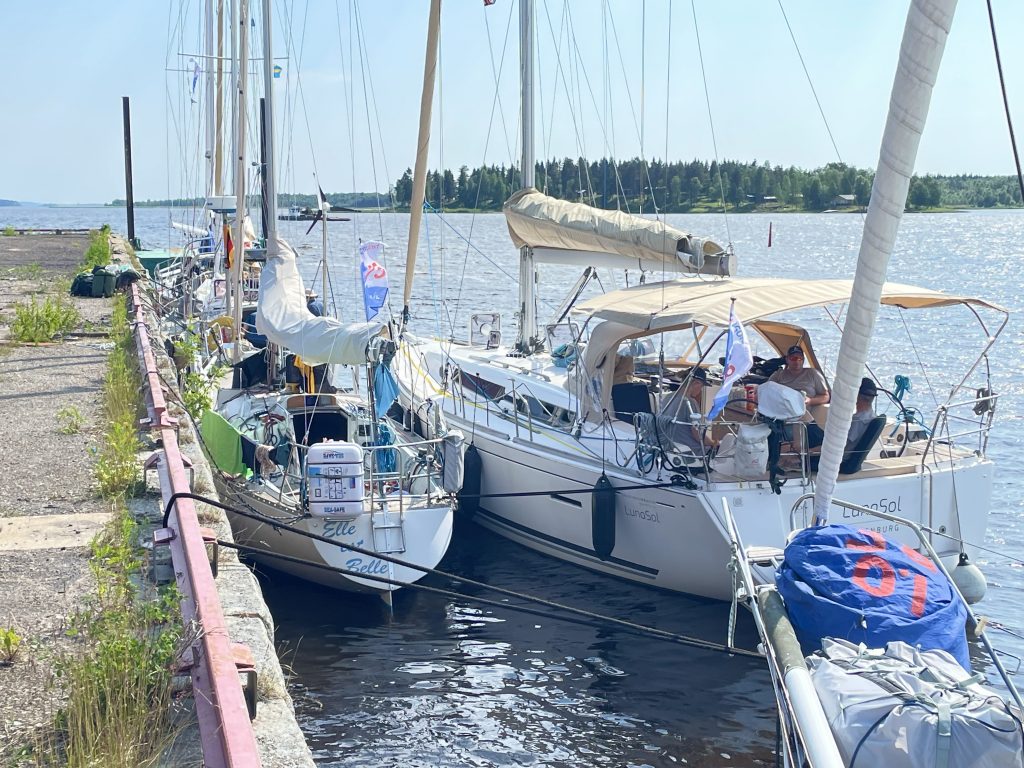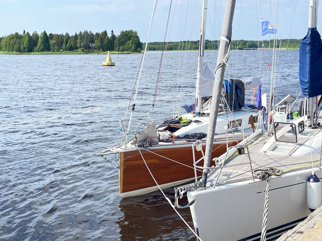 Und einige andere Segler sind auch da. Denn es gibt seit einigen Jahren eine Regatta, die hier ihre Ziellinie hat. Gestartet wurde am 21.06.2022 in Wismar zwischen den Schwedenköpfen, und der Gewinner ist nach 4 Tagen, 19 Stunden, 7 Minuten, 46 Sekunden Nonstop in Töre über die Ziellinie gesegelt und hat damit den bisherigen Rekord um einen ganzen Tag verbessert. Allerdings: mit einer Class 40, einer richtigen Regatta-Rennmaschine und entsprechend erfahrener Crew. Wie ich finde, irgendwie nicht passend für die MidsummerSail. Die anderen Schiffe – von einigen Meerrumpfbooten mal abgesehen – sind ganz normale Fahrtenschiffe mit natürlich hochambitionierten Crews… und dann auch schon den einen oder anderen Tag länger unterwegs als der Schnellste. Wobei in diesem Jahr die lang anhaltende Starkwindphase, die auch wir zu spüren bekommen haben (allerdings mit Hafentagen), das Erreichen eines neuen Rekordes begünstigt hat.