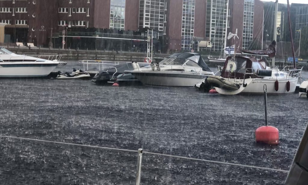 Nur ein freundlicher und redseliger „Hilfs-Hafenmeister“ ist vor Ort und stellt sich als Ole vor. Die Clubmitglieder wechseln sich wohl wöchentlich in dem Job ab. Bei einem Bier erzählt er und erzählt und erzählt… nach kurzer Zeit stört uns auch der herüberziehende Dampf und Brandgeruch der großen Papier-Fabrik nicht mehr (Kartonagen, Tetrapacks, Becher…) und unsere erste Skepsis ob der Auswahl des Liegeplatzes verfliegt. Das geplante Grillen auf dem breiten Steg muss allerdings ausfallen, da es dann doch den angesagten Regen gibt. Das Gewitter zieht aber glücklicherweise vorbei. Der Regen hält allerdings einige Jugendliche, die schon während des Sonnenscheins vom Steg aus baden waren, nicht davon ab, weiterhin mit Schwung ins Wasser zu springen.