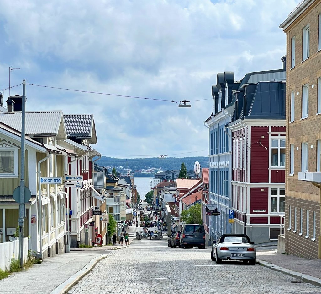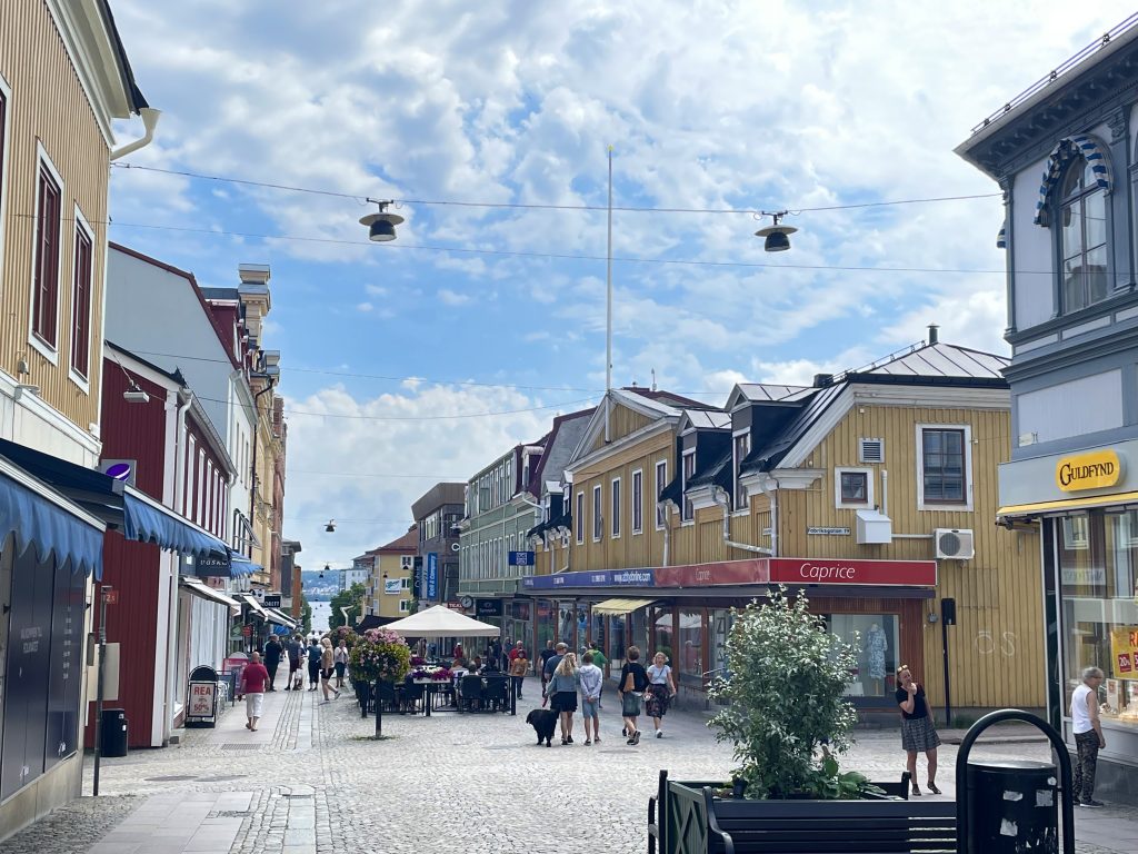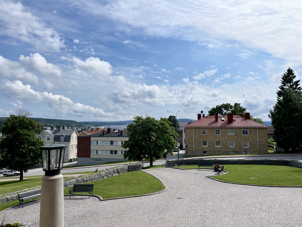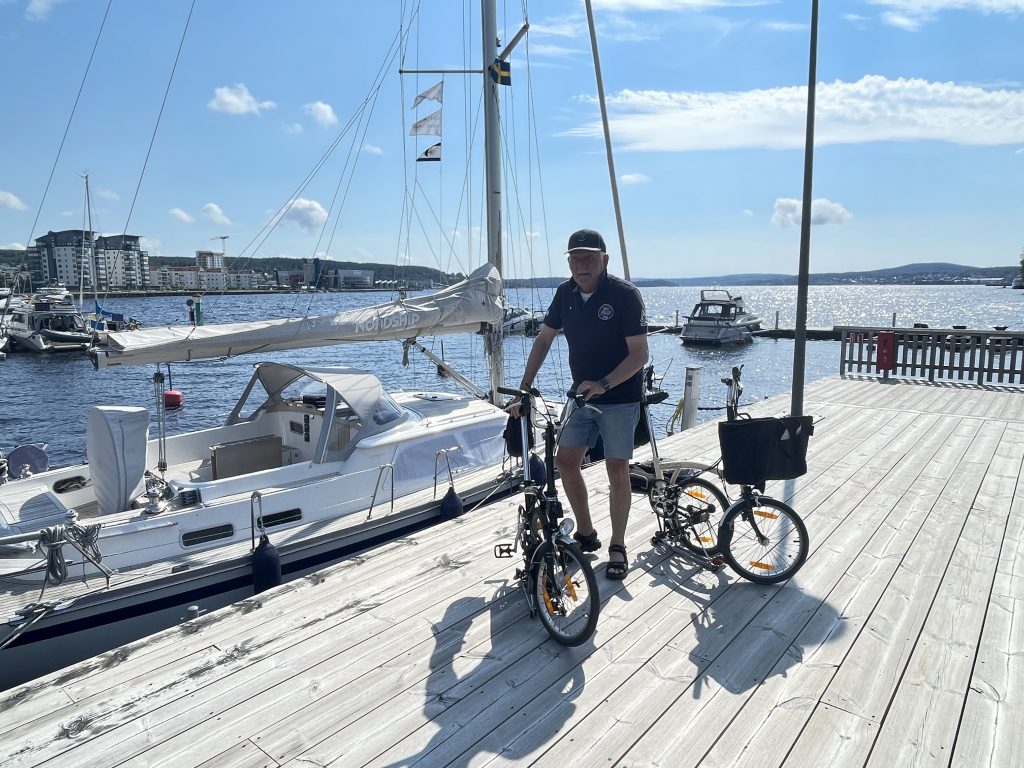 Der nächste Tag beginnt mit dem angesagten kräftigen Wind aus SüdSüdOst, der mächtig Unruhe in den Hafen bring. Die meisten Schiffe liegen genau quer zum Wind und den kleinen kabbeligen Wellen, die in den Hafen schwappen. Und alle schaukeln mächtig hin und her… nur wir nicht und ein weiteres Schiff unserer Größe, das sich hinter uns längs an die Pier gelegt hat und somit genau mit dem Bug im Wind liegt. Wir sehen unsere gestrige Entscheidung, uns hierher zu verholen, bestätigt. Bei strahlender Sonne packen wir unsere Fahrräder aus und lassen uns auch von den über die Berge jagenden, manchmal etwas unheilvollen Wolken, nicht abhalten, ein wenig durch die Stadt zu radeln. Övik ist zu groß, um es nur zu Fuß zu erwandern und glücklicherweise groß genug für einen Schiffsausstatter. Wir schauen mal nach seinem Angebot: aber naja… könnte besser sein. Jedoch für einige notwendigen Kleinigkeiten reicht es. Anschließend spazieren wir noch ein wenig durch die Innenstadt. Dabei geht es ganz schön bergauf und bergab – sind wir garnicht mehr gewohnt.