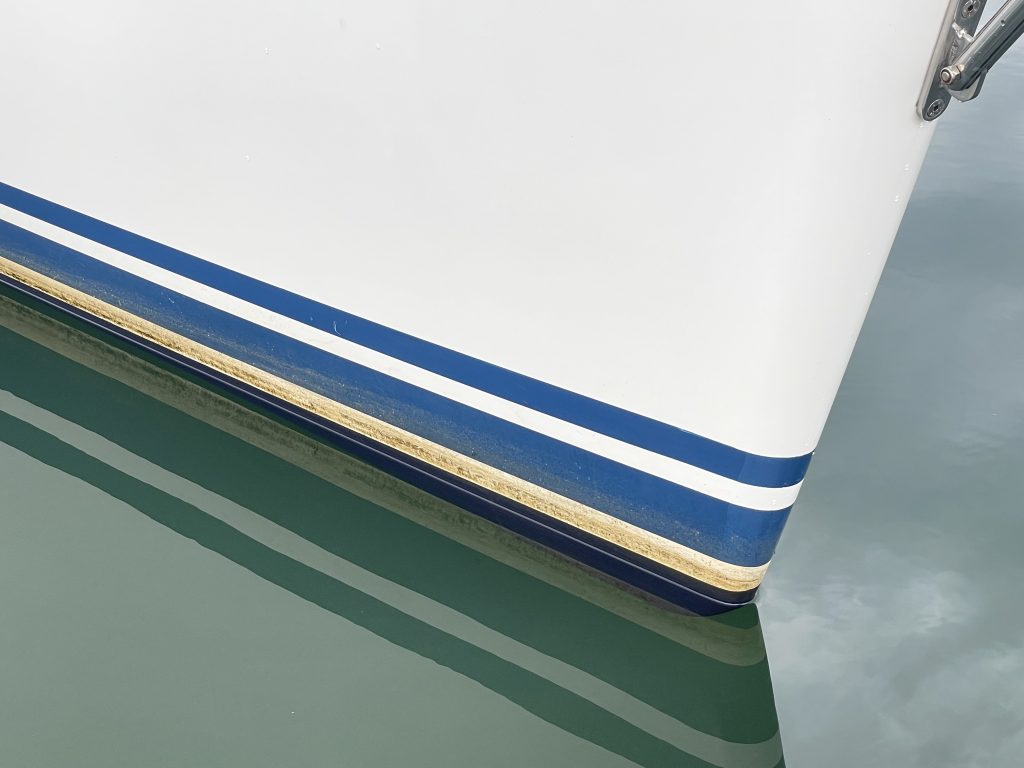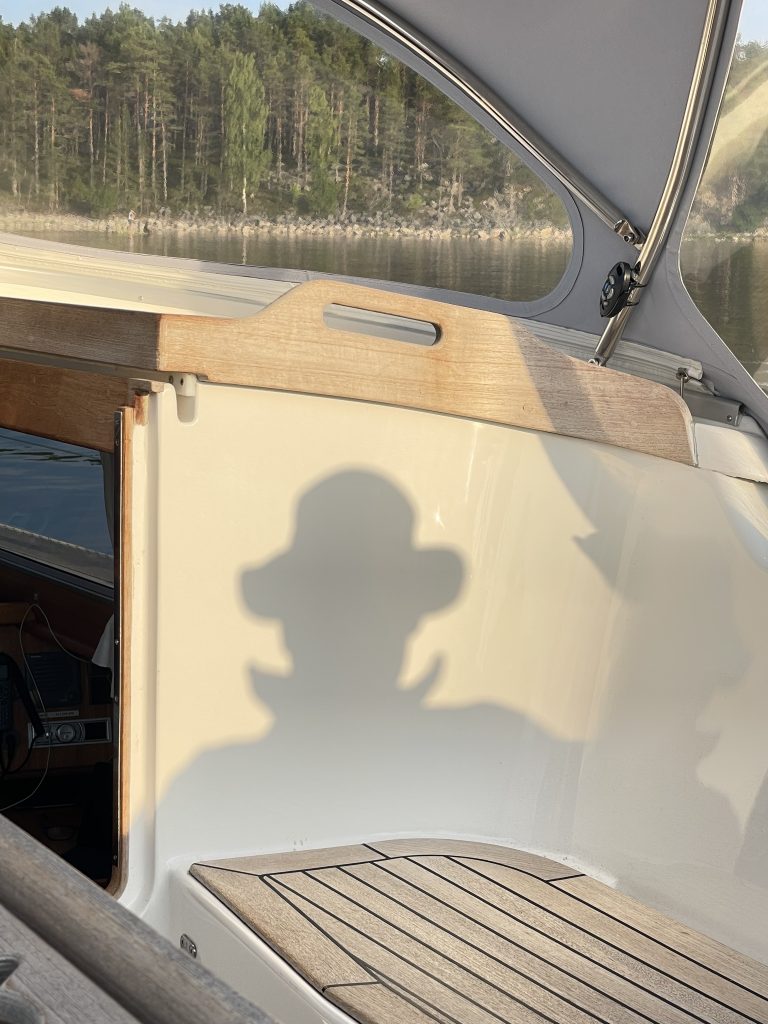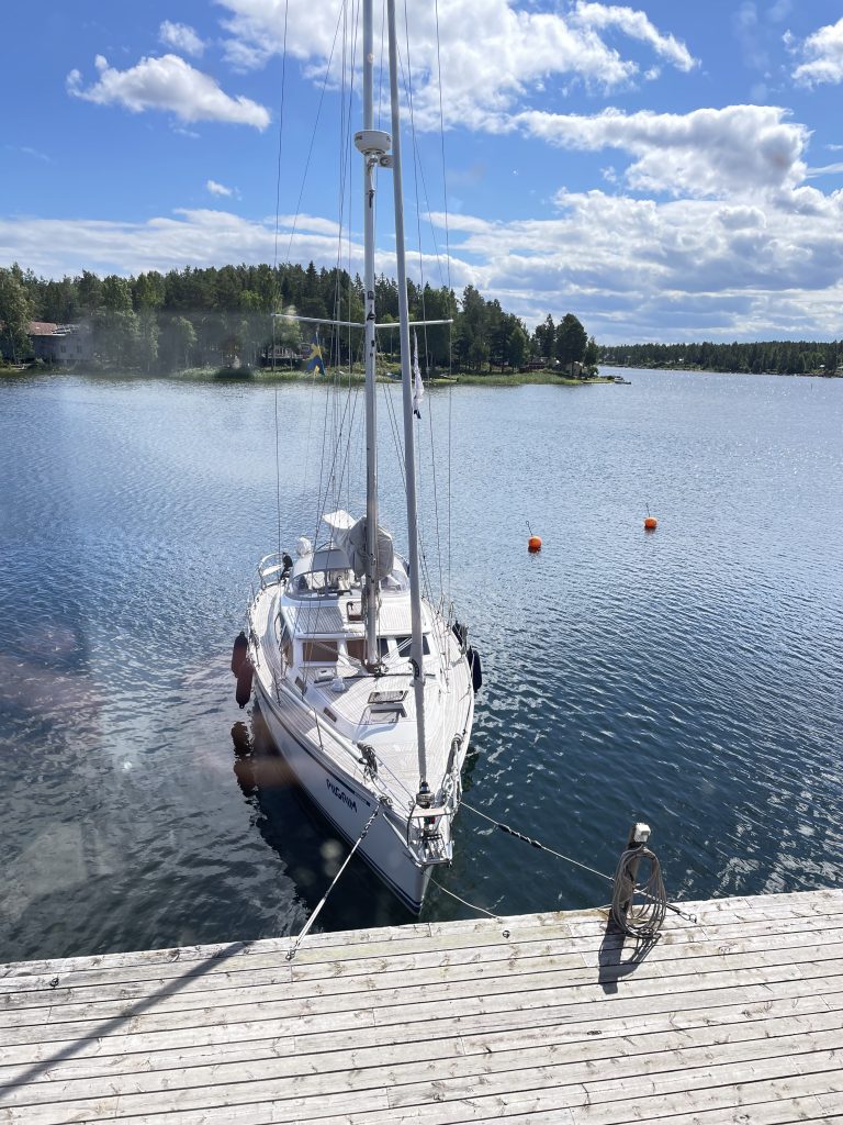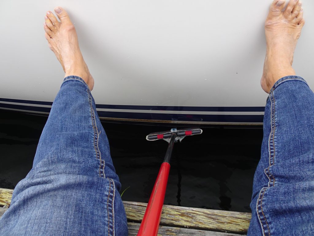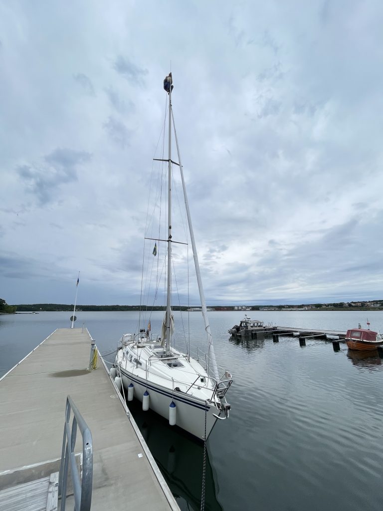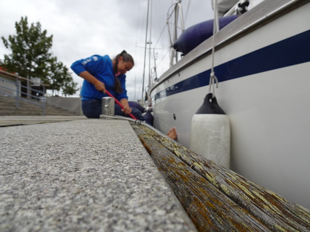 Übrigens kaufe ich nie mehr eine Sonnenbrille. Nachdem sich meine bisherige Segel-Sonnenbrille über die letzten Wochen so langsam aufgelöst hat, habe ich hier in Sundsvall – am ersten Tag unseres Aufenthaltes – endlich eine Neue gefunden… seitdem regnet es 😎🤷♀️☔️. Als der Regen endlich nachläßt nutzen wir die Zeit und die günstige Liegeposition, um doch mal zu versuchen, den Schmutzrand am Wasserpass zu entfernen. Klappt ganz gut… etwas einweichen… etwas schrubben… wenigstens eine Seite ist jetzt wieder chick.