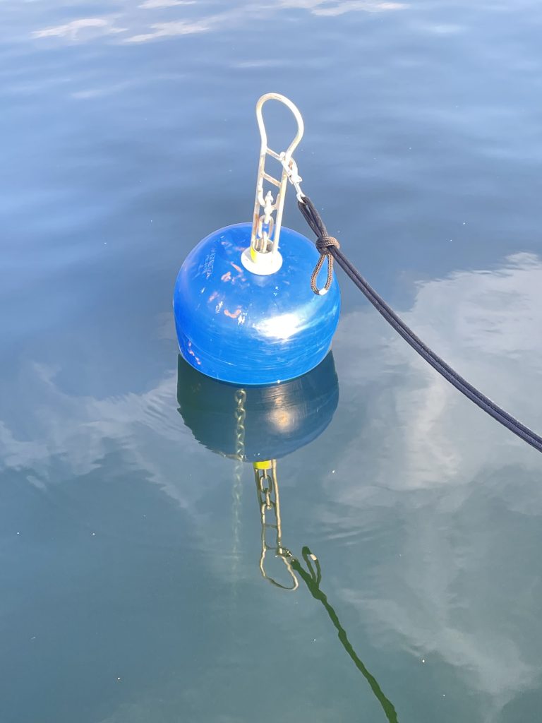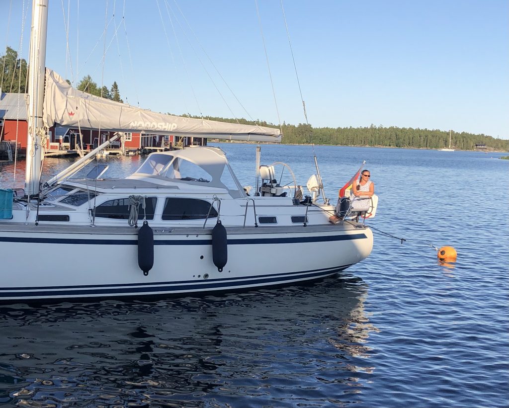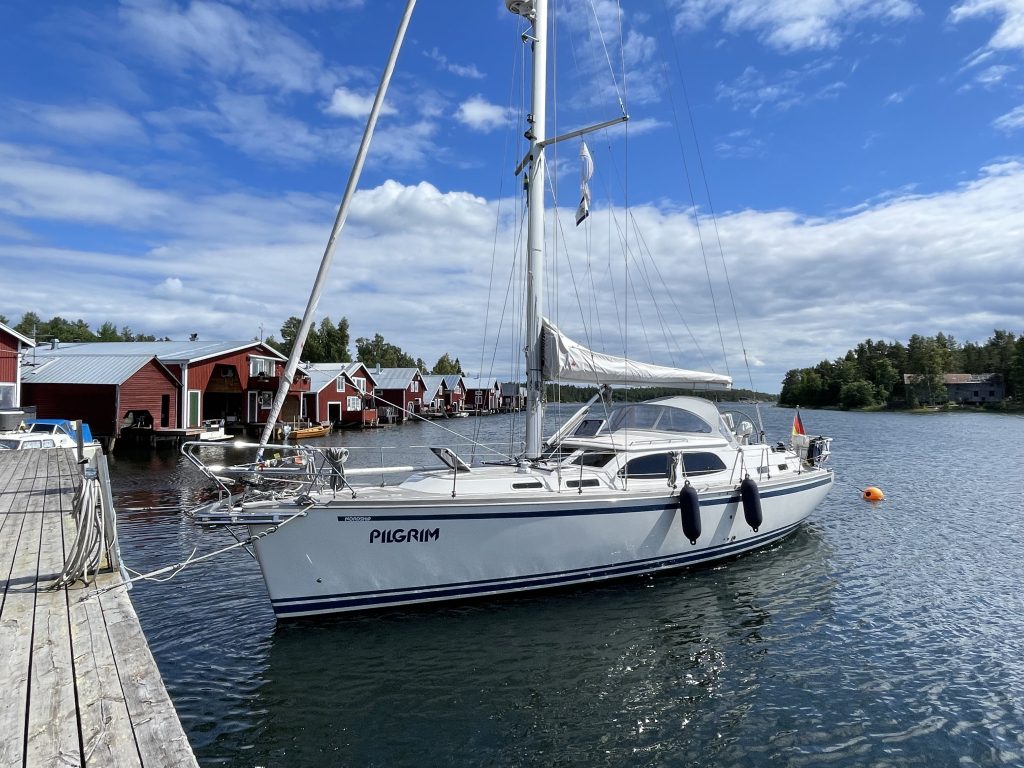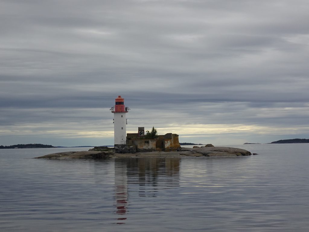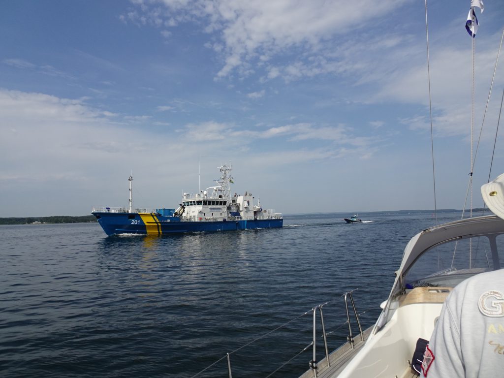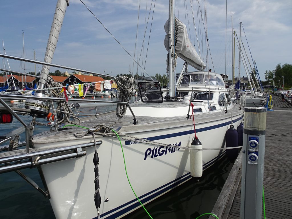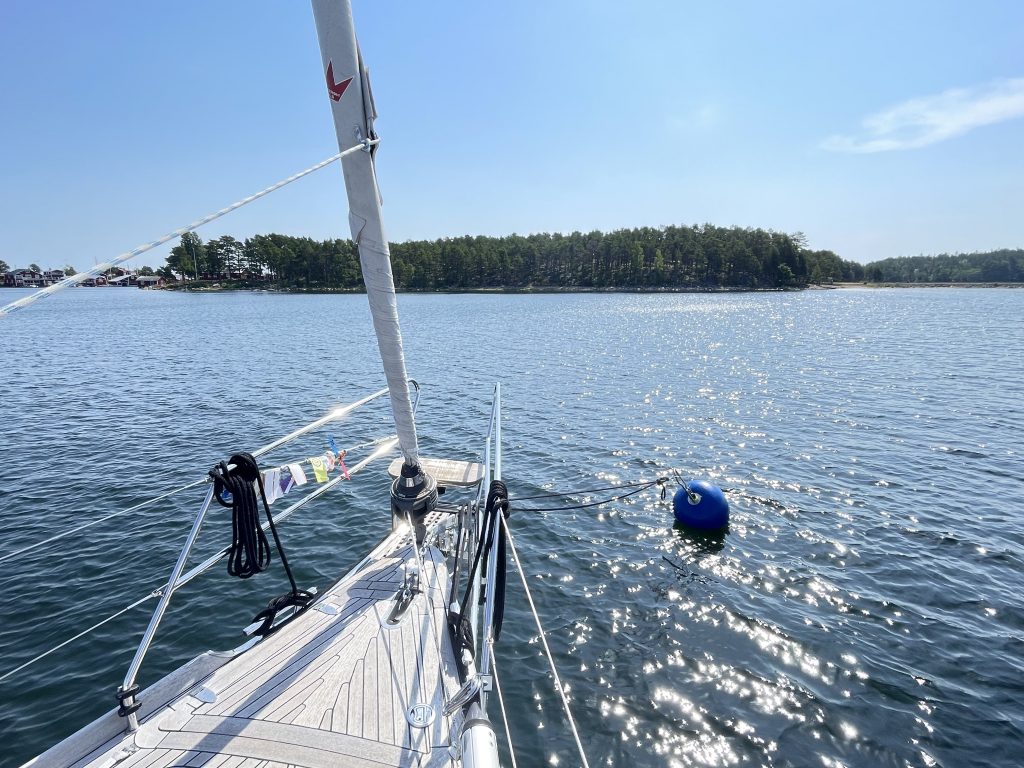 Am Mittwochmorgen (20.07.) starten wir früh, denn der Wind soll zulegen… und das leider aus der falschen Richtung. Bei schwachem Südwind motoren wir bis zu einer kleinen Ankerbucht und schnappen uns die dort ausliegende SXK-Boje. Der Wind nimmt, wie vorhergesagt, beständig zu und gegen den Wind, der wirklich direkt von vorne kommt, anzukreuzen macht nicht wirklich Sinn. Also lieber gemütlich an der Boje in Kuggören schwojen, lecker Kaffe (1x mit Eierlikör, 1x mit Whisky) trinken und die Sonne genießen. Zwischendurch haben wir an unserer Boje sogar etwas Schräglage, da es einige richtig kräftige Böen in die Bucht schaffen. Pilgrim zerrt ordentlich an der Boje… aber diese hält. Allerdings wurde es einem anderen Segler, der wohl ebenfalls die für ihn falsche Windrichtung abwettern wollte und neben uns ankerte, zu ungemütlich. Vielleicht hatte er auch Bedenken ob der Haltekraft seines Ankers. Kaum hat er wieder abgelegt, lassen die Böen nach und wir genießen entspannt den Nachmittag. Jetzt, bei wieder ruhigem Wind und Wasser, können wir unsere Boje auch genauer in Augenschein nehmen: die Bojenkette scheint nagelneu! Kein Bewuchs, der auf längeren Wasserkontakt schließen läßt. Sehr gut – dann steht einer ruhigen Nacht ja nichts mehr im Wege.
