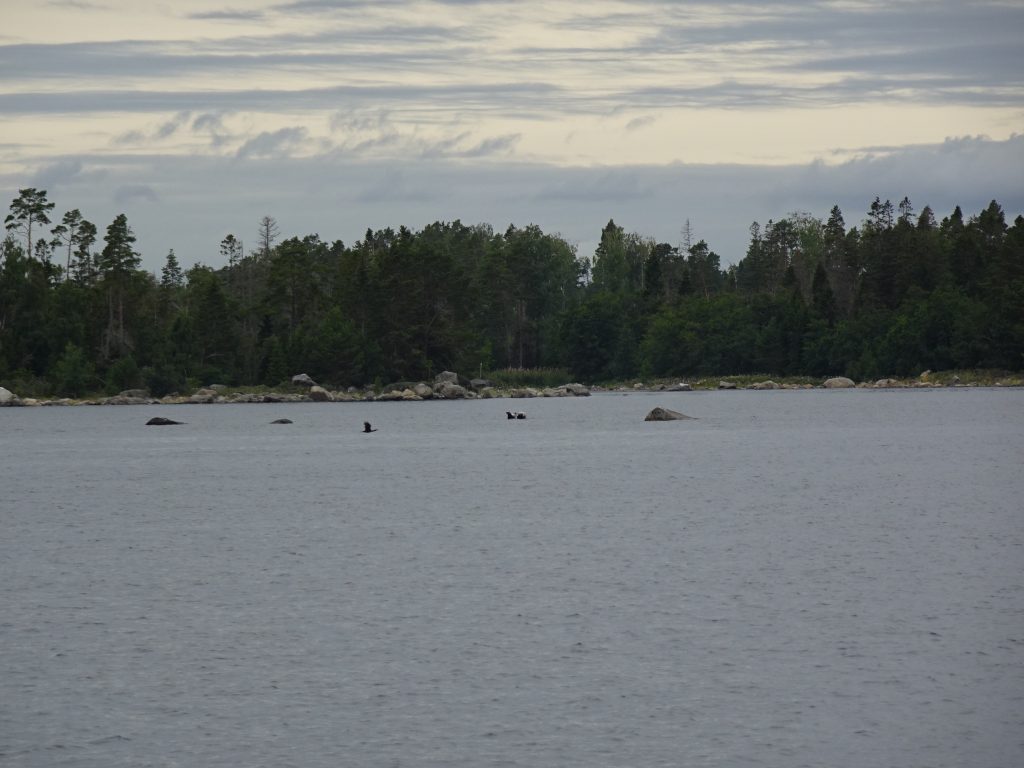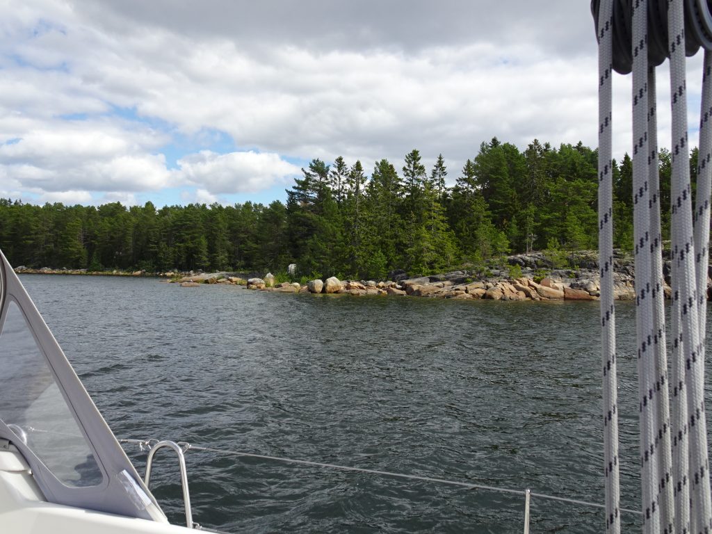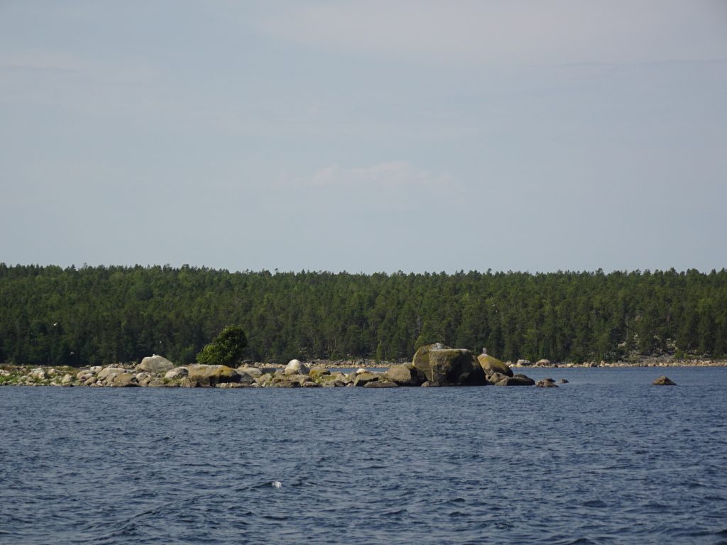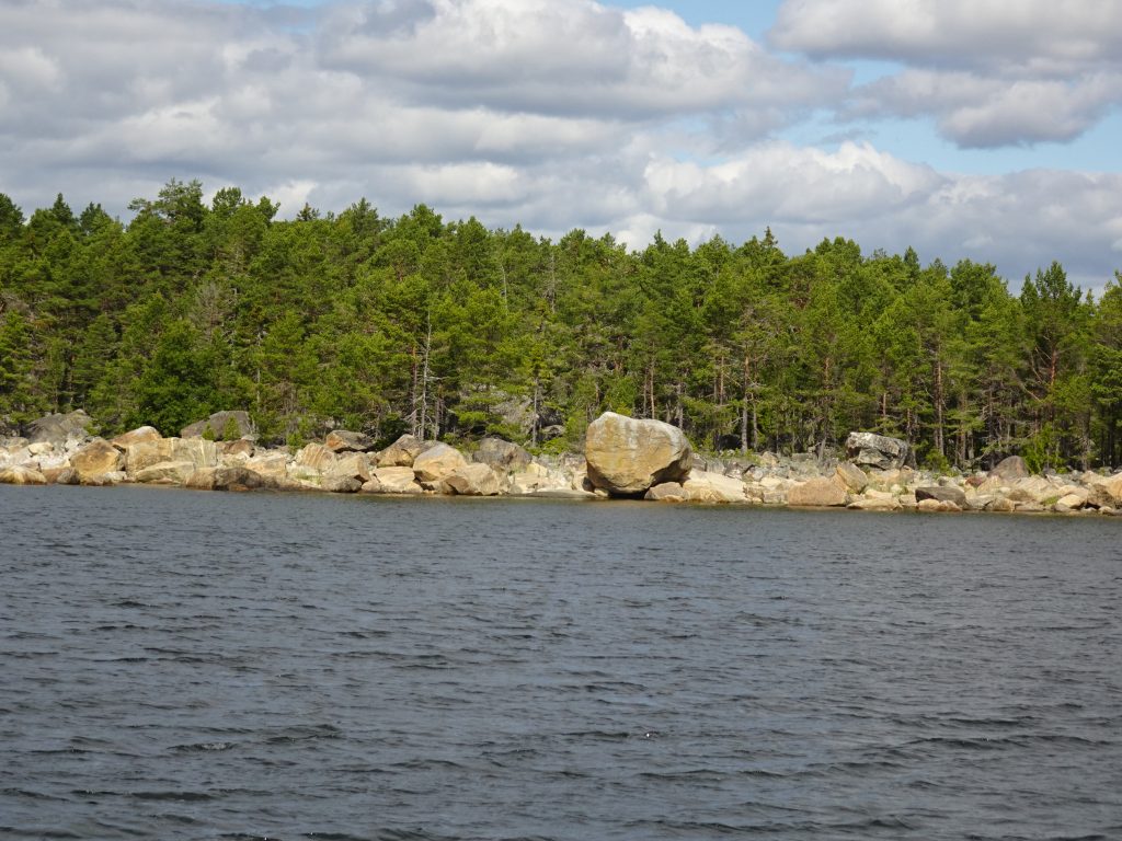 Wir begnügen uns damit, die vorbeiziehende Landschaft zu genießen. Es gibt nur ganz entfernt am Horizont noch höhere Berge und so begleitet ein grünes Band aus Fichten, Kiefern und einigen Laubbäume unsere Fahrt die Küste entlang… und natürlich immer mal wieder große Felsen.