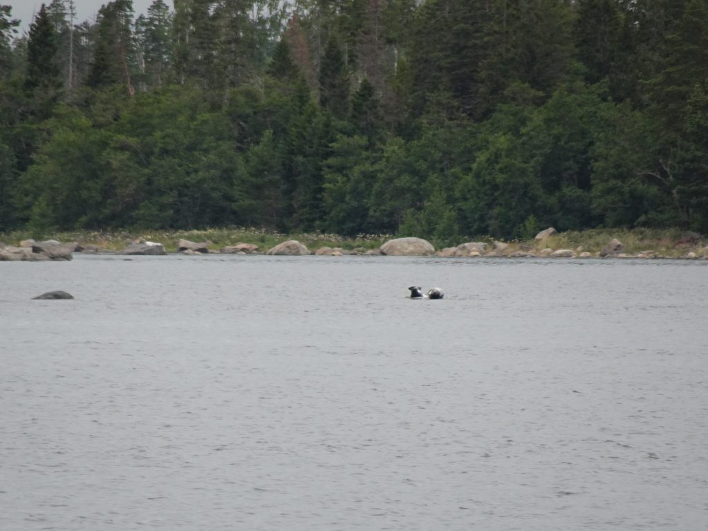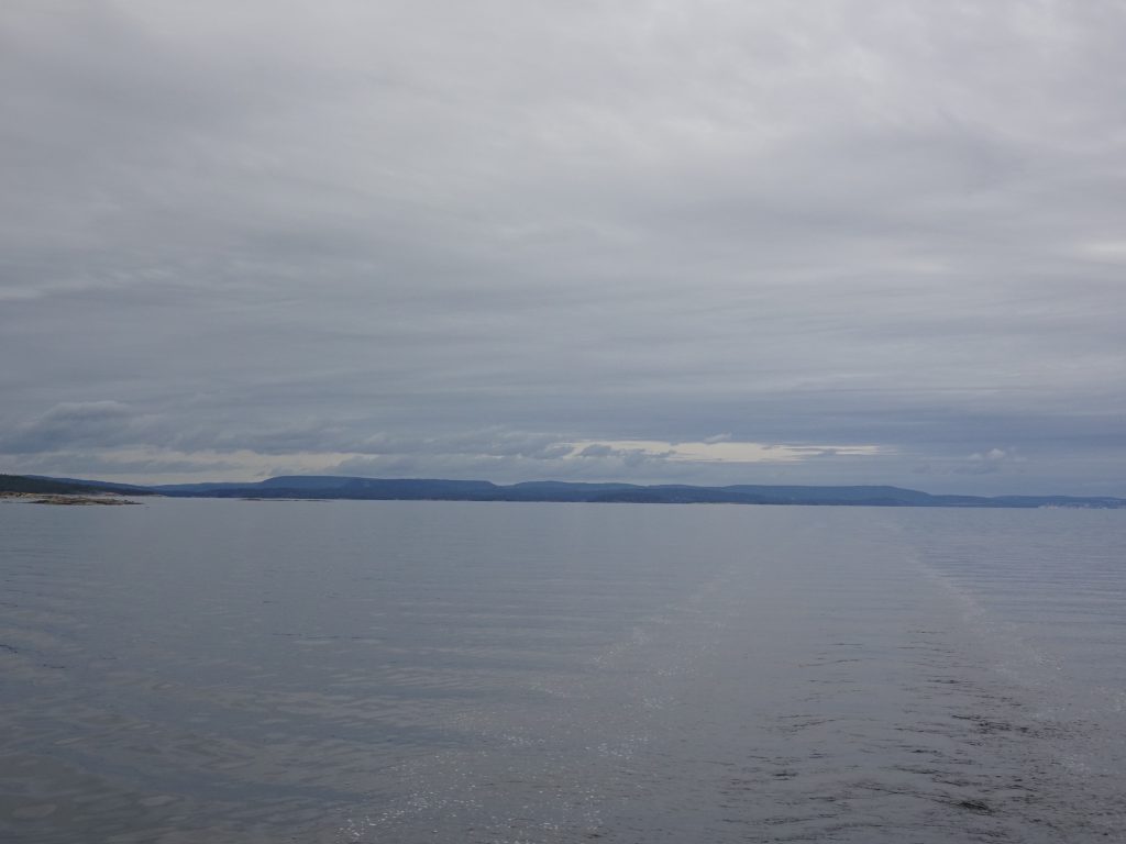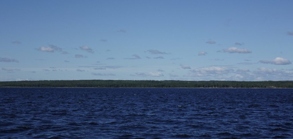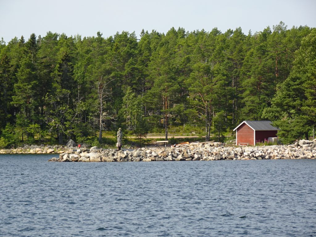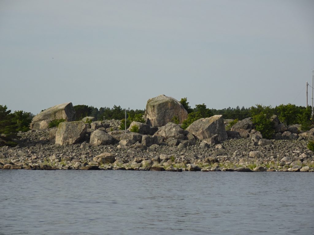 Wir begnügen uns damit, die vorbeiziehende Landschaft zu genießen. Es gibt nur ganz entfernt am Horizont noch höhere Berge und so begleitet ein grünes Band aus Fichten, Kiefern und einigen Laubbäume unsere Fahrt die Küste entlang… und natürlich immer mal wieder große Felsen.