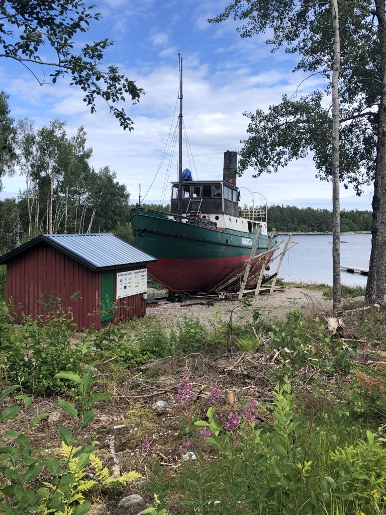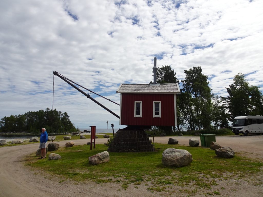 Der zum Hafen Lubban gehörende kleine Ort Galtström – eher einige vereinzelt stehende Häuschen – hat früher sein Geld mit dem Transport von Eisenerz aus den Bergwerken Mittelschwedens und Kalkstein und Quarz aus den Stockholmer Schären verdient. Roheisen wurde für den Versand in schwedische und ausländische Häfen verladen. Der ursprüngliche Hafen befand sich 800 m südlich des jetzigen Kais in Prästviken, musste aber Ende des 19. Jahrhunderts verlegt werden, da er durch die Landhebung zu seicht geworden war. 1876 wurde eine Eisenbahn gebaut, um den Hafen mit den Eisenwerken zu verbinden. Über einige der alten Gleise stolpern wir bei einem kleinen Spaziergang. Zum Be- und Entladen wurden drei Kräne eingesetzt, von denen eine Dampfkran noch am Kai steht. Es gab damals hier auch eine kleine Werft, die einen Zweimast-Schoner und zwei hochseetüchtige Schleppkähne baute. Der Schlepper „Ophelia“, der neben dem Kai aufgebockt steht, hatte ab 1885 seinen Dienst entlang der Nordküste Schwedens geleistet und steht jetzt mehr oder weniger dekorativ in der Landschaft. Der alte Kai wurde 2018 umfassend renoviert, und so haben wir heute einen prima Liegeplatz.