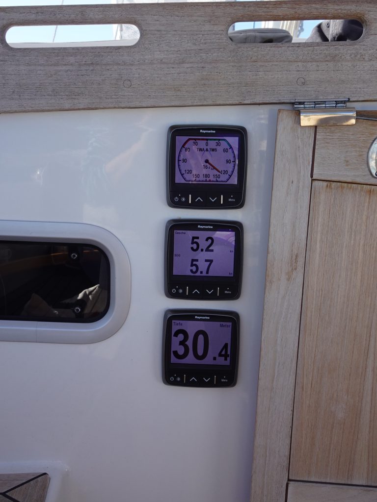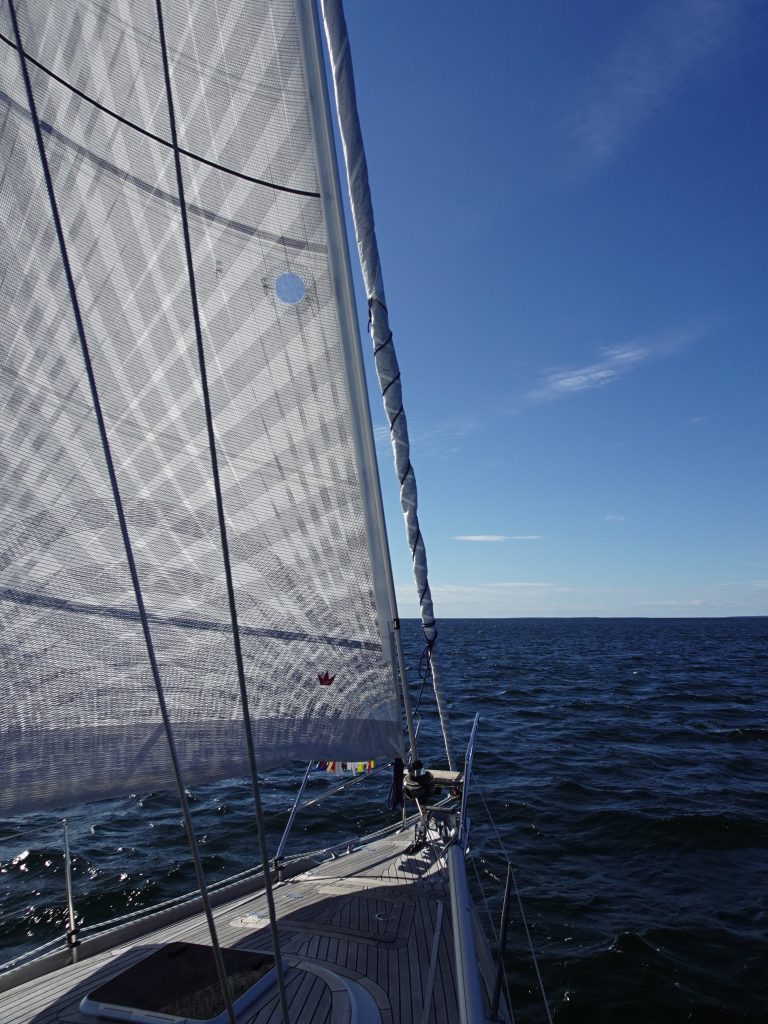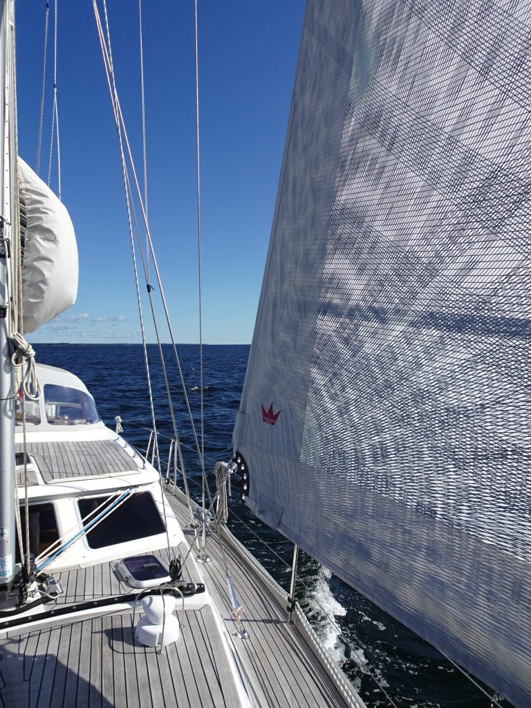 Am nächsten morgen (Dienstag, 19.07.) freuen wir uns auf einen perfekten Segeltag. Doch leider ist die Windstärke für unseren Code Zero mit gut 4 Bft zu stark. Da hat doch mal wieder der Wind die Vorhersage nicht gehört! Der Code Zero ist ein Leichtwindsegel – max. 3 Bft reichen ihm – und muss nun leider eingerollt bleiben. Bei dem Wind, mit zusätzlichen starken Böen bis 6Bft, kommen wir auch mit unserem Vorsegel zügig voran. Als die Böen noch etwas stärker werden bergen wir unseren Code Zero lieber, denn die lange Rolle vor dem Vorstag – der eingewickelte Code Zero – verursacht einige Schwingungen im gesamten Schiff, die sich nicht gut anfühlen. Welle haben wir kaum, denn der Wind kommt über Land und wir segeln dicht unter Landabdeckung, und da hat das Wasser keine Zeit, sich zu höheren Wellen zu formieren. So ist der Code Zero problemlos bald wieder gut verstaut.