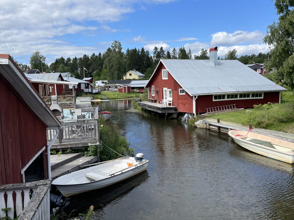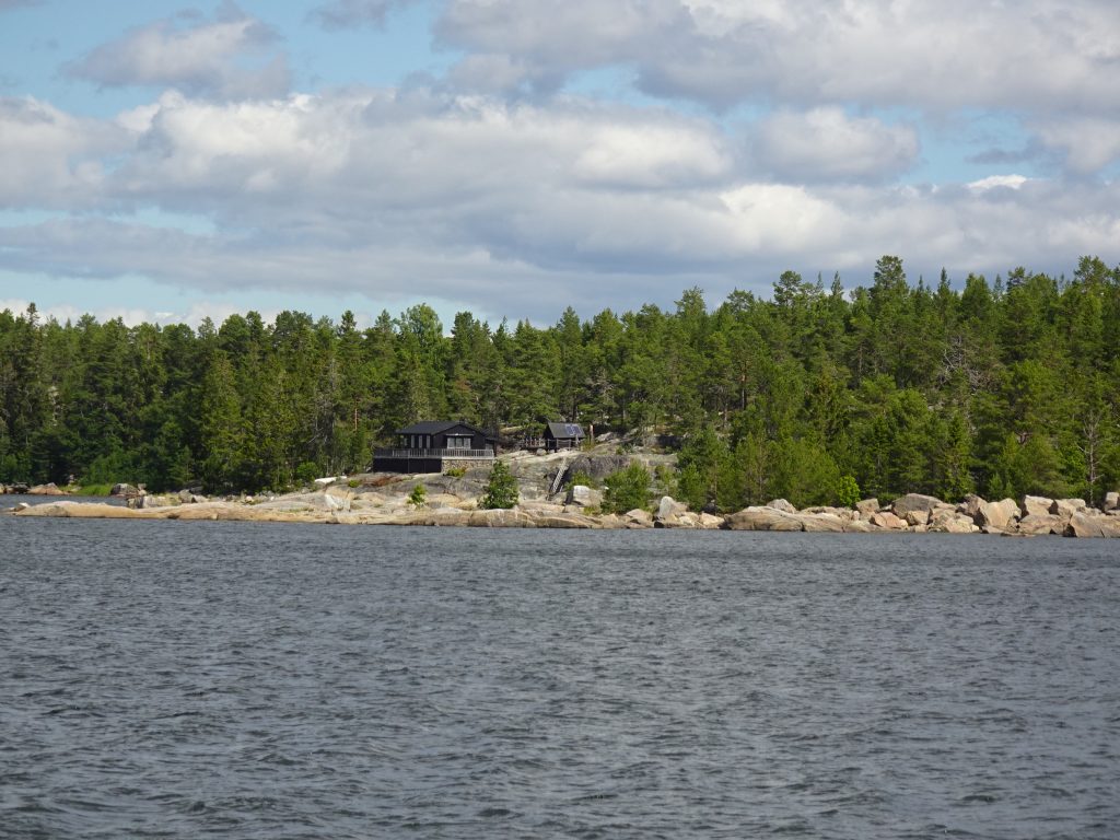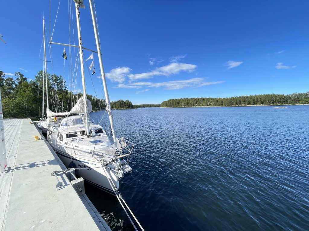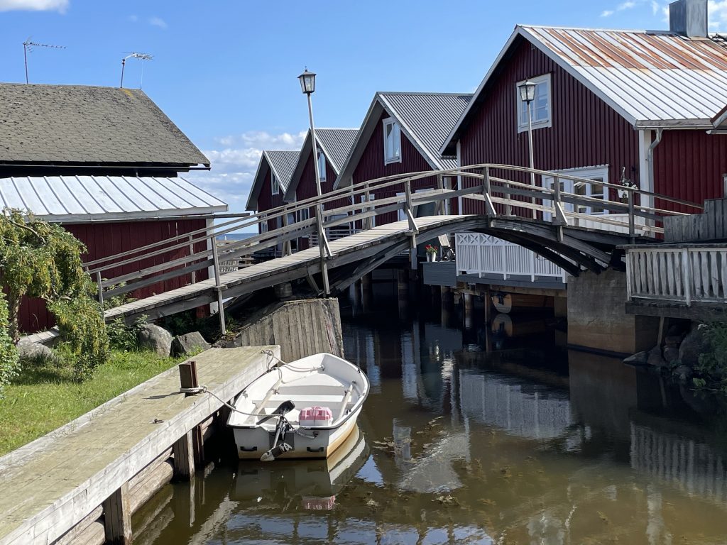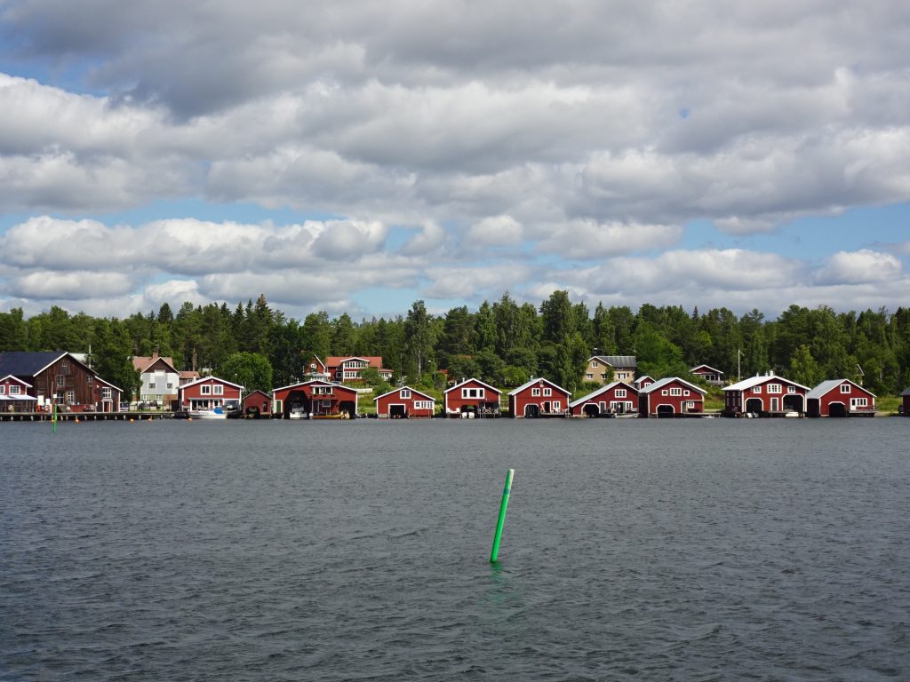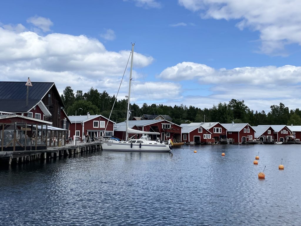 Bald erreichen wir Mellanfjärden, ein ehemaliges kleines Fischerdorf, das heute wohl nur noch vom Tourismus lebt. Kein Wunder… es ist echt niedlich hier. Viele kleine rote Häuschen mit Bootsgaragen säumen das Ufer und wir finden einen Platz direkt vor einem kleinen Restaurant. Jedoch erst nach einer kurzen Schrecksekunde. Als wir eben unseren Haken in die Heckboje gepickt haben und ich mit den Vorleinen bereitstehe, an Land zu gehen, setzt die elektronische Motorsteuerung aus. Der Motor läuft, aber weder Vorwärts- noch Rückwärtsgang läßt sich einlegen. Und wir sind noch mindestens 2m vom Steg entfernt. Soweit kann ich nicht springen… und wir treiben langsam rückwärts und vom Steg weg. In D+DK gibt es ja meist dicke Poller oder Klampen am Steg, über die ich die Vorleine von Bord aus werfen könnte. Doch in SE+FI gibt es eben allermeistens Ringe, in die man die Leine einfädeln muß – oder per Karabiner einhaken… von Land aus. Glücklicherweise wollen grad einige Gäste ins Restaurant und nach einem kurzen Zuruf ist ein Mann so geschickt, die ihm von mir zugeworfenen Leine zu fangen und am besagten Ring am Steg einzuhaken. In der Zwischenzeit hat Kalli geistesgegenwärtig den Motor ausgeschaltet… und wieder eingeschaltet… und er läßt sich einkuppeln. Da sind wir aber schon gut am Steg fest und müssen nur noch die Entfernung regulieren. Tja, was war das denn nun? Solch einen Fehler hatten wir noch nie. Kalli stöbert in den Handbüchern und die sagen sehr hilfreich: Servicewerkstatt kontaktieren. Das hilft einem ja richtig weiter. Ist jetzt aber nicht zu ändern… also weiter beobachten.🤷♀️🤷♂️