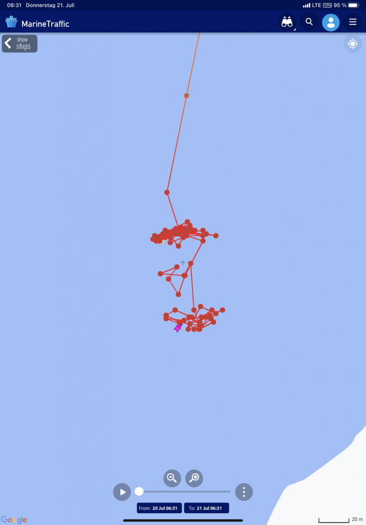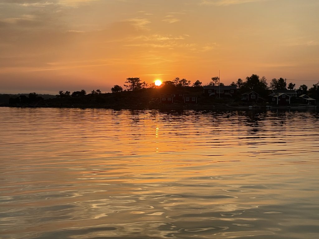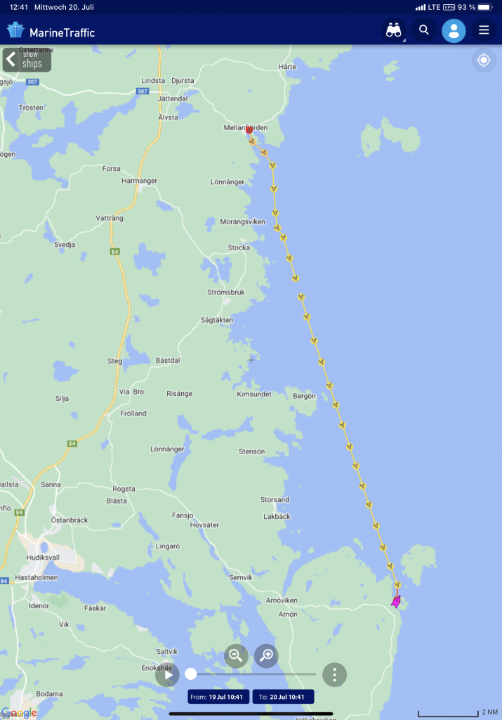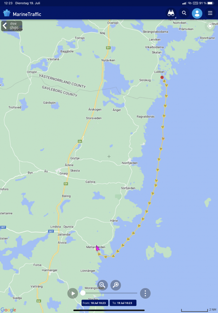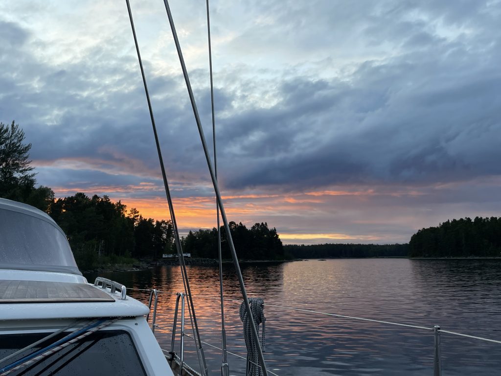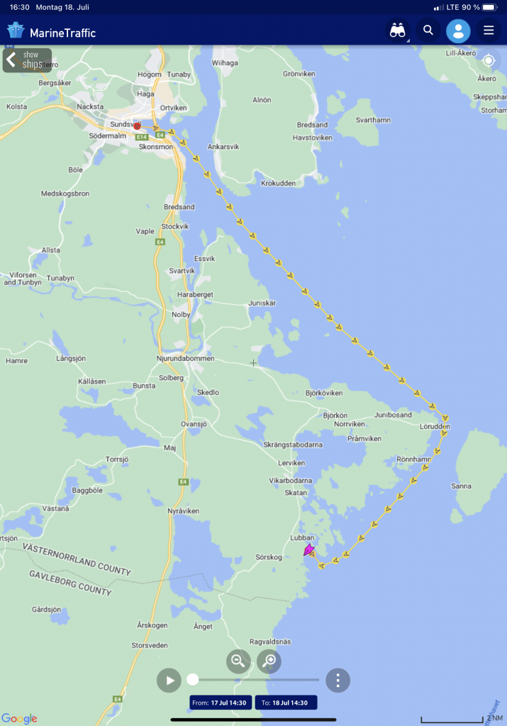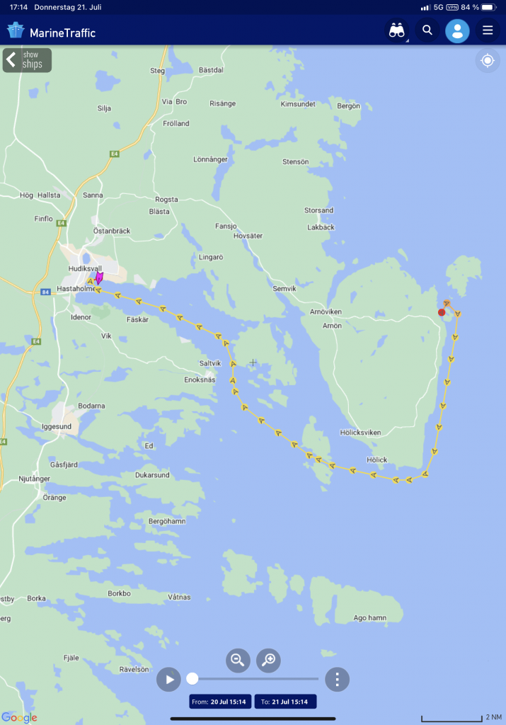 Nach einer ruhigen Nacht, einem tollen Sonnenaufgang (Foto 04.10h) und etwas Frühnebel starten wir, nachdem sich der Nebel aufgelöst hat, gemütlich in Richtung Hudiksvall. Es ist Donnerstag, der 21.07. und leider kein Wind 🤷♀️🤷♂️. Die Wasseroberfläche ist wiedermal so glatt, dass wir jeden Augenblick einige Seehundköpfe daraus auftauchen sehen könnten. Aber keiner zeigt sich. Schade. Dann halt nicht.
