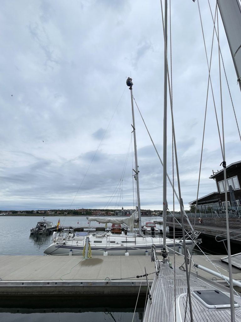 Die Entscheidung, uns zu verlegen, war genau richtig. Nicht nur Essen, auch Service sind bestens, die Duschen edel und wir liegen – den Wind betreffend – genau in der Abdeckung des Restaurants und damit geschützt vor dem ungemütlich böigen Wind. Und auch weit weg vom Stadthafen, in dessen Nähe offensichtlich ein Musikfestival stattfindet… wummernde Musik schallt zu uns herüber. Wir wollen lieber nicht wissen, wie laut es direkt am Stadthafen ist🔊🎧🔊.Doppelt gute Entscheidung. Später am Abend kommt dann noch ein Segler – zu Fuß – vorbei, den wir vor einigen Tagen schon mal getroffen habe. Er überlegt, sich auch hierher zu verlegen. Allerdings mit einem kleinen Hintergedanken: sein Windmesser im Masttop ist defekt. Er hat sich Ersatz gekauft, muß jetzt aber hoch in den Mast, um ihn zu montieren. Und er ist alleine. Klar helfen wir gerne.