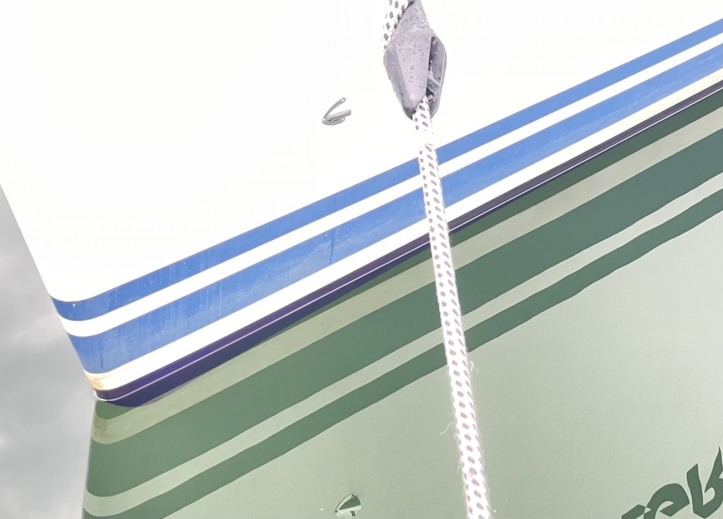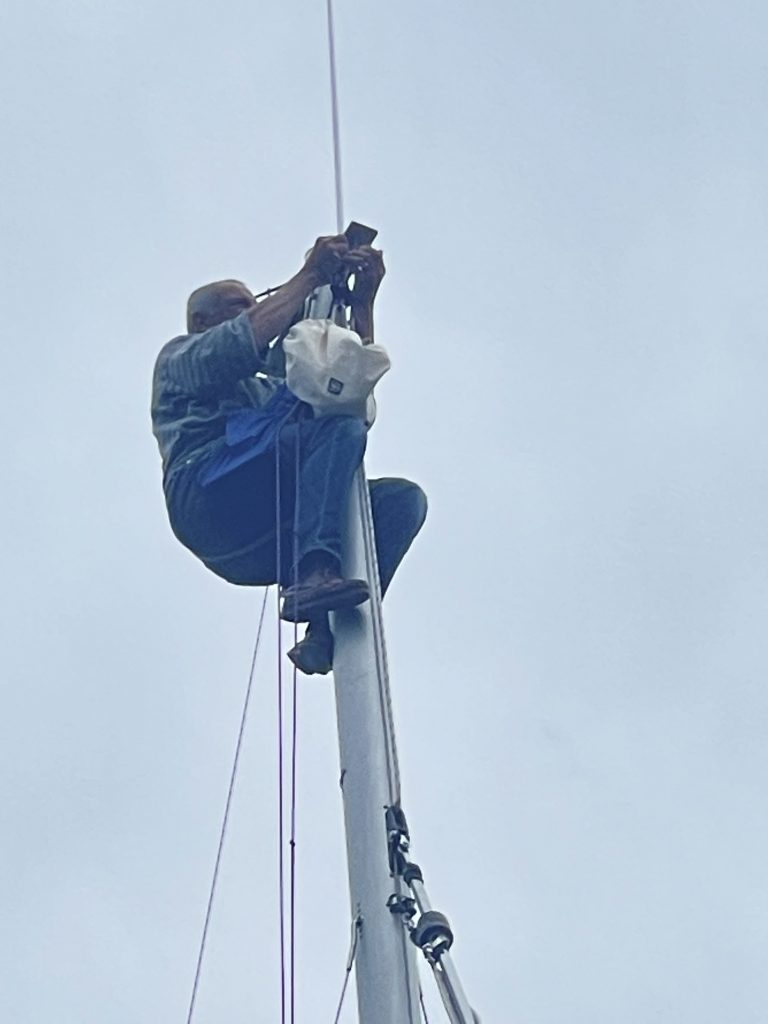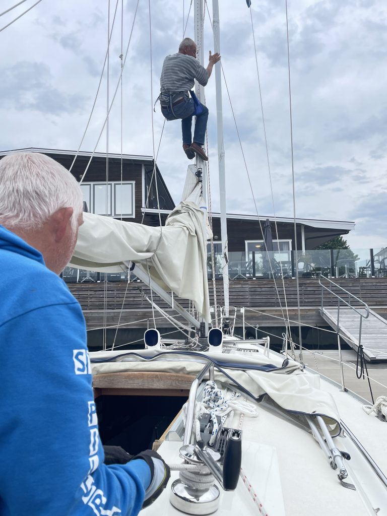 Am nächsten Morgen – der Regen macht Pause – verlegt Ulli sein Schiff direkt vor unseres und wir kurbeln ihn im Mast hoch. Auf halber Strecke wird natürlich noch der Tarif verhandelt…😜 Er hat doppelt Glück: erstens sind wir gnädig und lassen ihn auch ohne Gegenleistung wieder runter, und zweitens läßt sich das Ersatzteil gut montieren und zeigt ihm nun wieder korrekten Wind an.