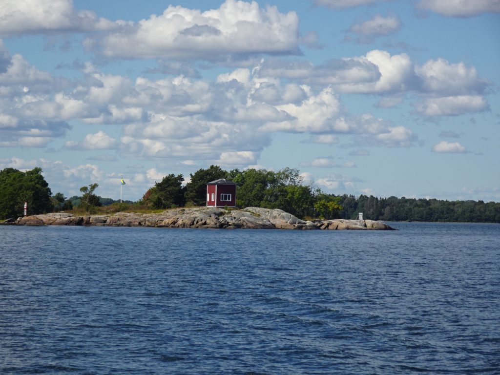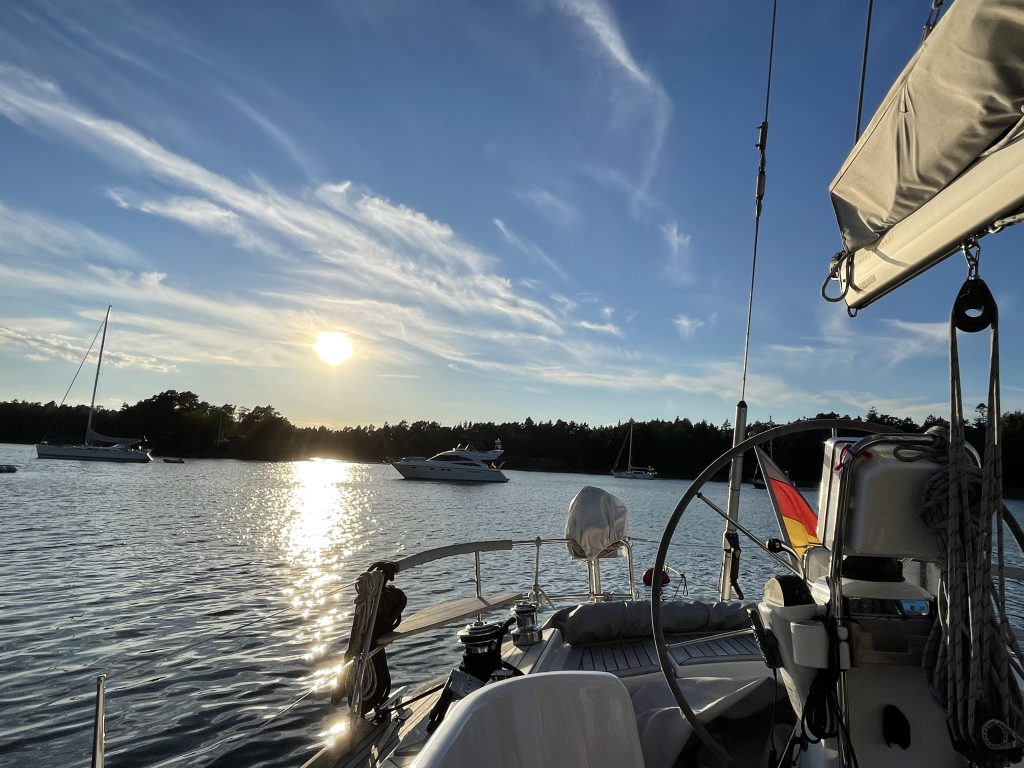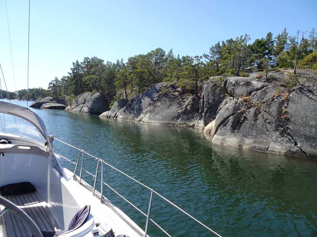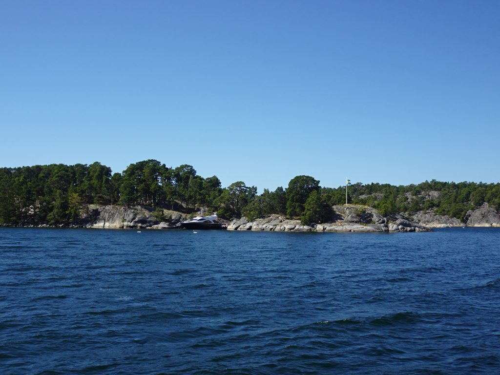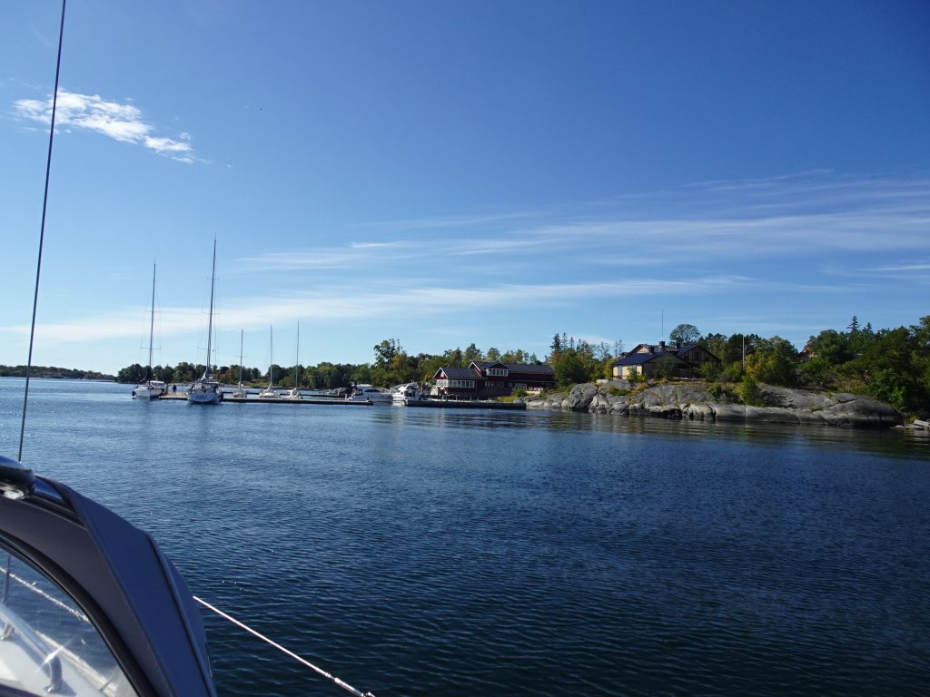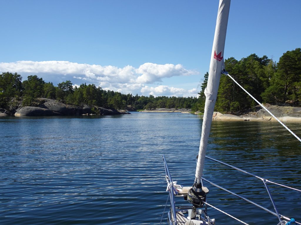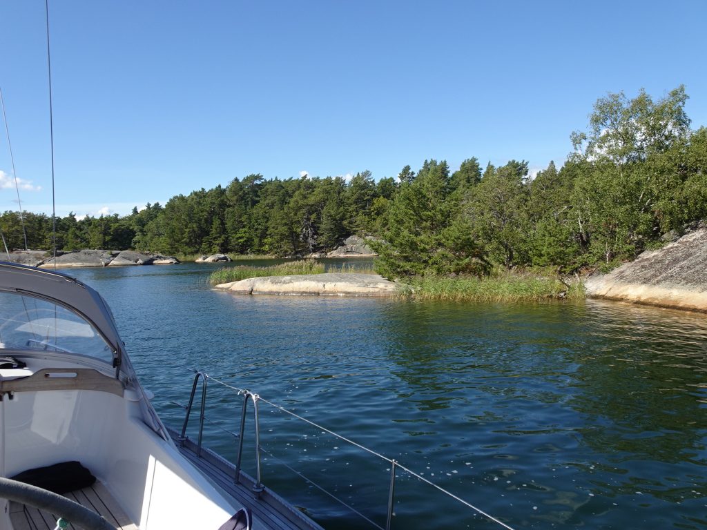 Am Donnerstag (11.08.) wird erstmal etwas ausgeschlafen. Dann gibt es einen gemütlichen zweiten Kaffee im Cockpit. Die Sonne strahlt wieder so vor sich hin und der Wind bläst so vor sich hin. Als wir dann starten, hat er sich ein wenig beruhigt, kommt aber mal wieder direkt von vorne. Ulli („Incognito“) schreibt uns später, dass er wieder tapfer gegen den Wind aufgekreuzt ist – bis zu seinem Ziel mit 42 Wenden!!! Was für eine Ausdauer! Hochachtung! Die haben wir nicht, haben aber auch so eine schöne Fahrt durch die Inselwelt östlich von Stockholm. Und man glaubt es kaum: wir treffen zwei weitere Schiffe, die wir schon in Finnland und im Norden Schwedens getroffen haben.