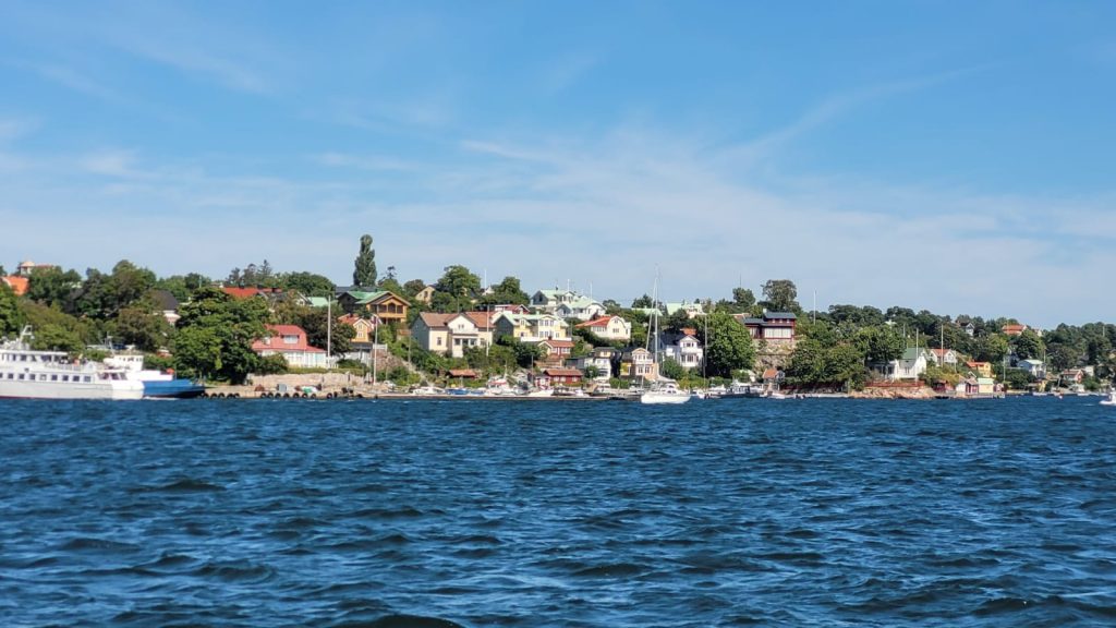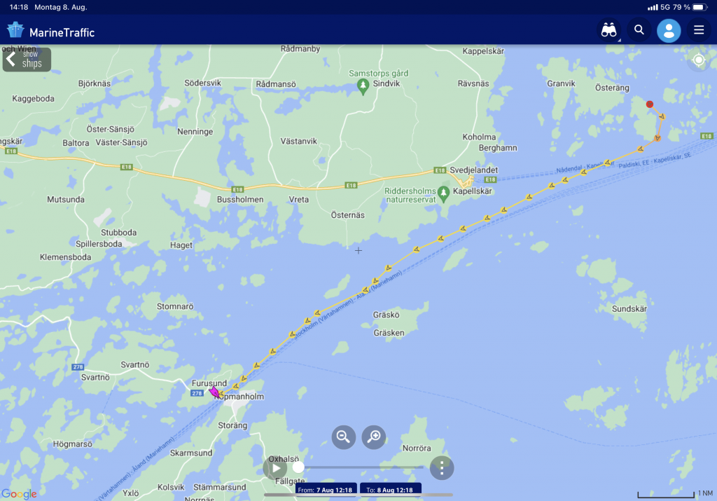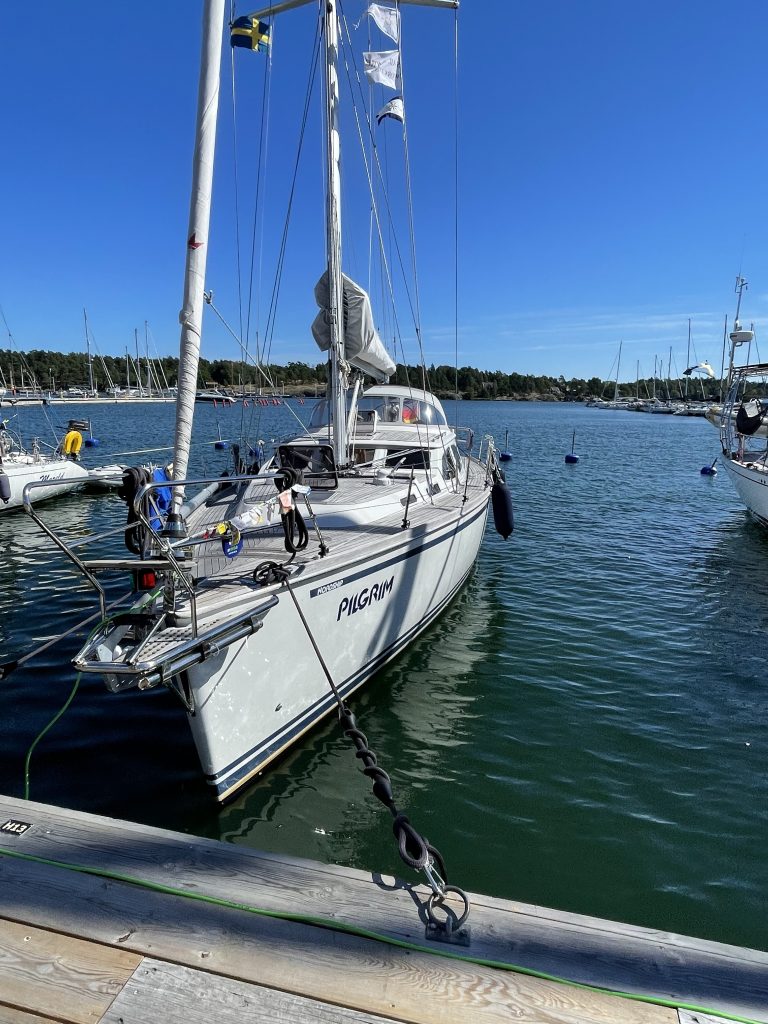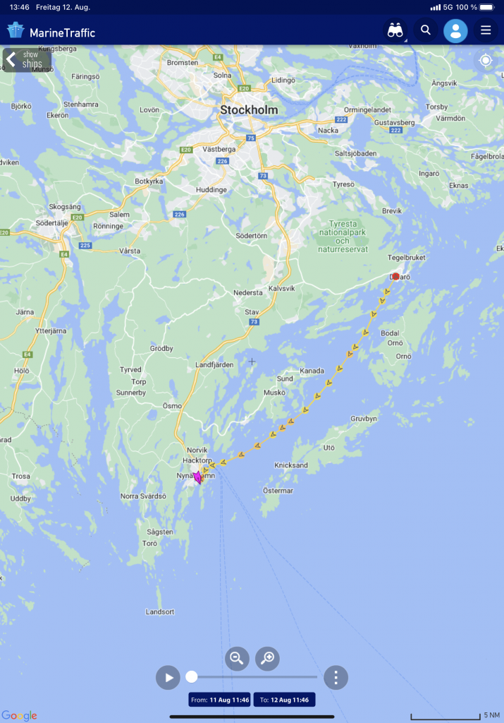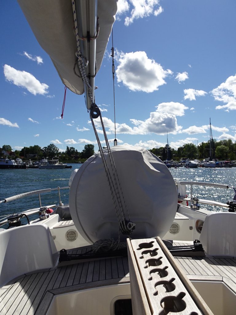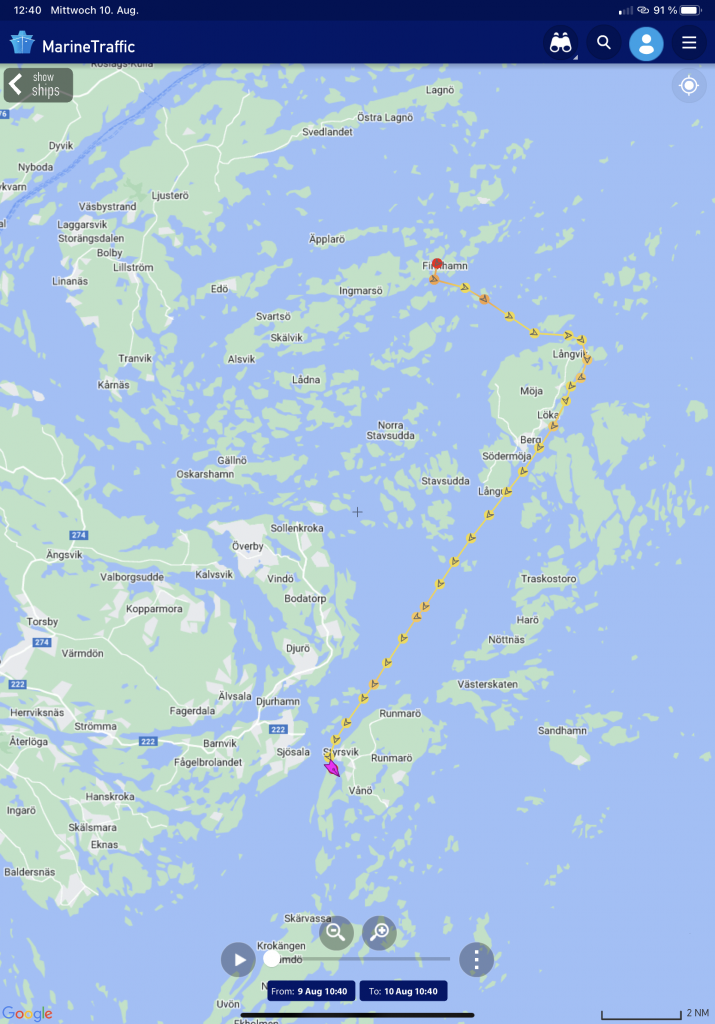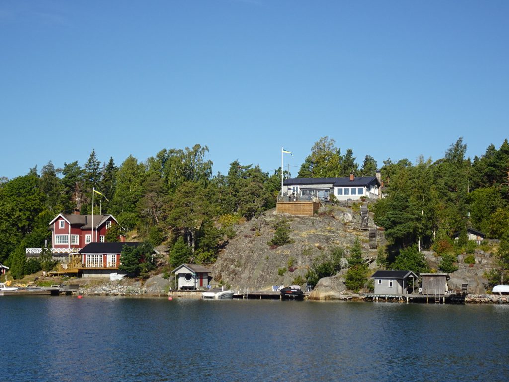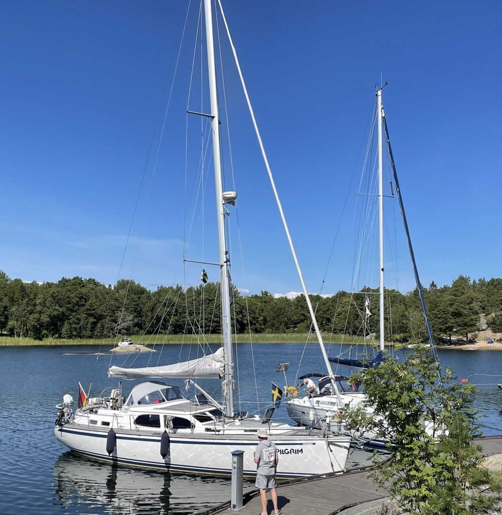 Am Donnerstag (11.08.) wird erstmal etwas ausgeschlafen. Dann gibt es einen gemütlichen zweiten Kaffee im Cockpit. Die Sonne strahlt wieder so vor sich hin und der Wind bläst so vor sich hin. Als wir dann starten, hat er sich ein wenig beruhigt, kommt aber mal wieder direkt von vorne. Ulli („Incognito“) schreibt uns später, dass er wieder tapfer gegen den Wind aufgekreuzt ist – bis zu seinem Ziel mit 42 Wenden!!! Was für eine Ausdauer! Hochachtung! Die haben wir nicht, haben aber auch so eine schöne Fahrt durch die Inselwelt östlich von Stockholm. Und man glaubt es kaum: wir treffen zwei weitere Schiffe, die wir schon in Finnland und im Norden Schwedens getroffen haben.
