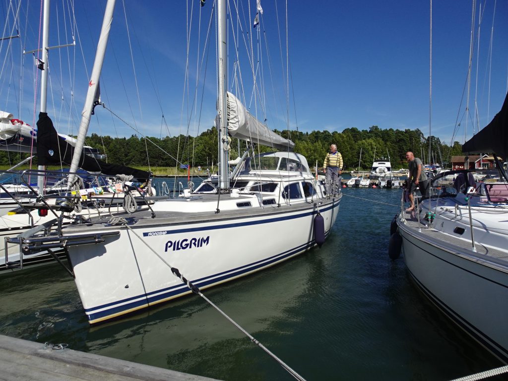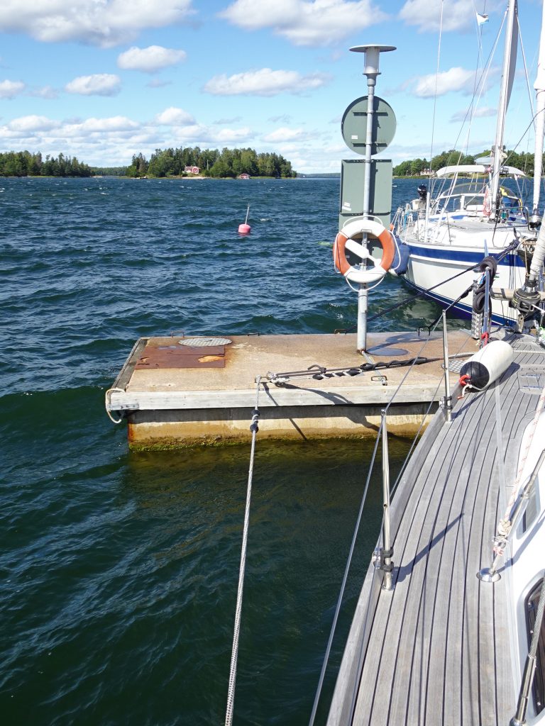 Der Kommunalhafen von Dalarö, den wir vor 3 Monaten bei der Vorbeifahrt als nicht wirklich hübsch empfunden haben, eignet sich auch heute überhaupt nicht zum festmachen. Der Wind bläst die Wellen genau gegen die Schwimmpontons (mit vielen vielen freien Liegeplätzen) und bringt die Pontons mächtig ins schaukeln. Kein Wunder, dass hier niemand festmacht. Da wird einem ja beim Hinschauen schon schwindlig. Wir funken ein soeben ablegendes Segelschiff an (Björn+ „Chrysanta“, kennen wir aus Finnland), dass nur mal schnell einen Mitsegler abgesetzt hat. Der muss nämlich zu Bus und Flieger und nach Hause. Björn rät uns eindringlich ab, denn für länger als 15min ist es am Ponton nicht auszuhalten. Wir beherzigen natürlich seinen Rat und fahren weiter in den Yachthafen Askfartshamnen gleich um die Ecke vom Kommunalhafen. Der Yachthafen ist zwar reichlich eng und drumherum sehr flach, aber es sind Plätze frei. Nach dem Festmachen trauen wir unseren Augen nicht: die „Workout“ liegt direkt neben uns. Zora + Lutz hatten wir in Finnland in Kylmäpihlaja, der kleinen Leuchtturminsel, mal ein Abschiedsständchen gesungen und gespielt. Großes Hallo… Allerdings ist das Anlegen vorher eine etwas ärgerliche Aktion, da erst die Motorsteuerung mal wieder kurz ausfällt und uns dann auch noch die Hilfs-Einweiser des Hafenmeisters an einen ziemlich blöden Platz schicken wollen. Wir weigern uns standhaft, denn Kalli hat uns einen anderen Platz ausgeguckt – schön mit dem Bug in den Wind – aber da sollen wir nicht hin. Keiner weiß, warum… wir schon garnicht. Nach etwas Diskussion und stur bleiben unsererseits geht es dann doch. Na bitte! Anschließend spricht Kalli mit dem Chef-Hafenmeister und richtet Grüße der beiden Senioren-Brüder – … die mit der Grillkohle – aus. Und schwups… alles ist prima. Wir dürfen selbstverständlich an unserem Wunschplatz liegen bleiben.