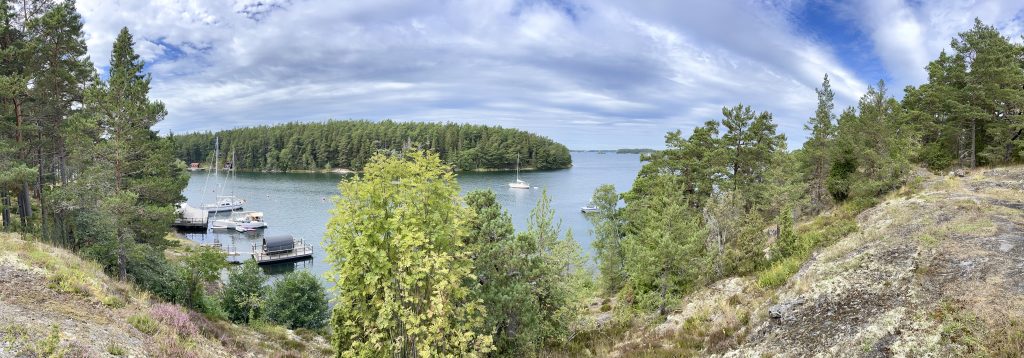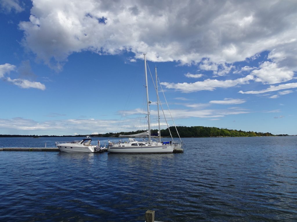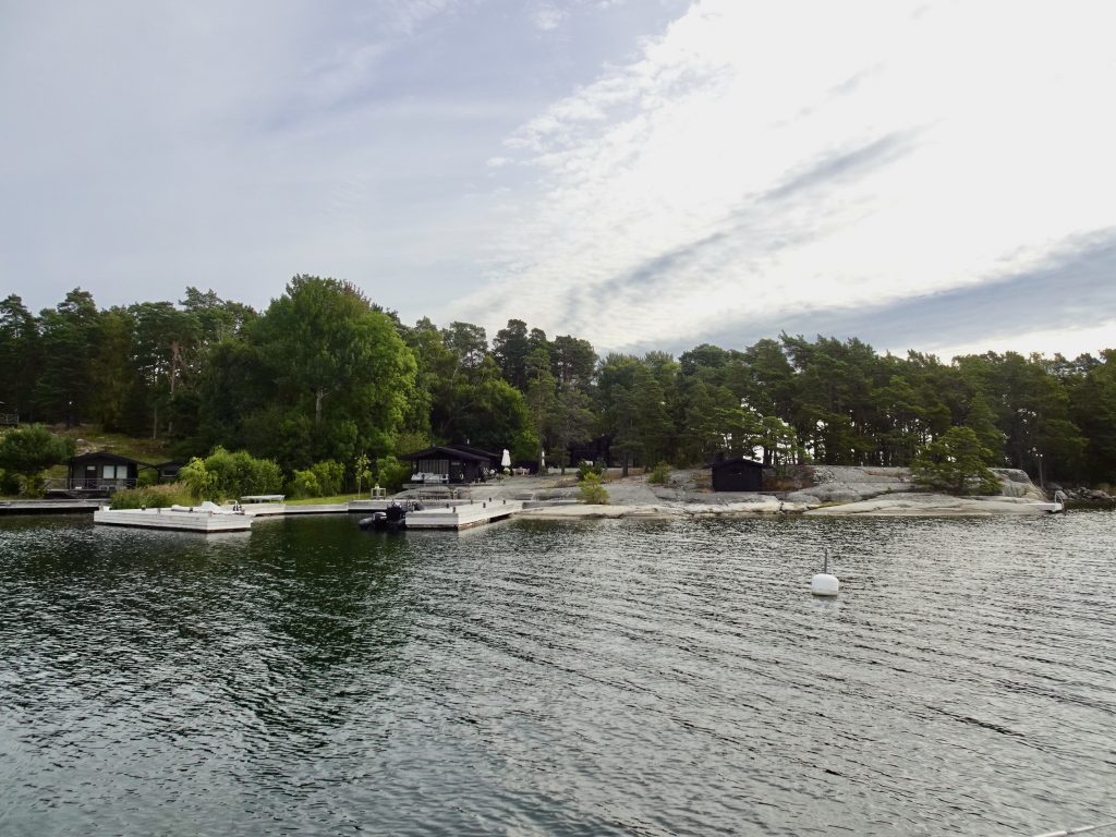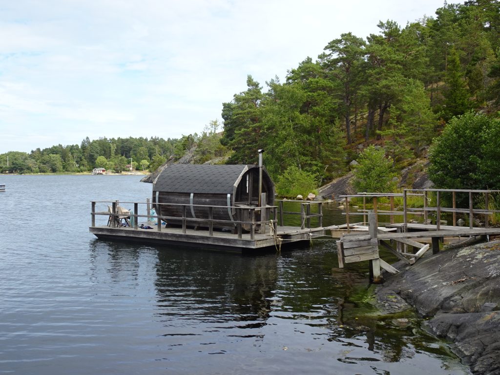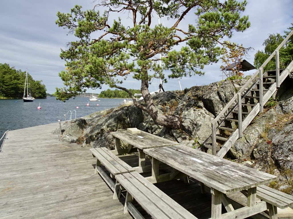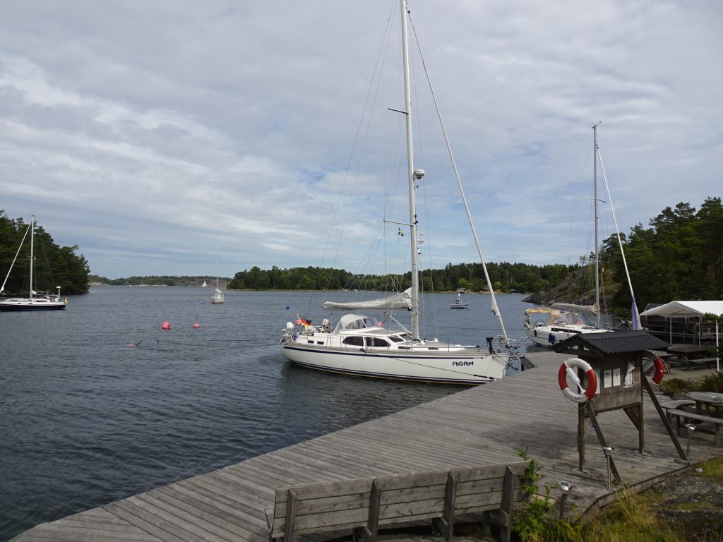 Doch es ist klar: am nächsten Morgen müssen wir weg. Und so starten wir am Mittwoch (10.08.) erstmal in Richtung Möja. Zwar eine größere Insel, aber ein kleinerer Hafen. Den wollen wir uns wenigstens mal anschauen. Doch schon auf dem Weg dahin entscheiden wir, lieber weiterzufahren. Der Wind hat reichlich zugelegt und der Hafen ist nett, aber winzig. Wir steuern also lieber eine kleine Bucht an, die wir schon mal besucht haben und von der wir wissen, wie ruhig man dort liegt. In Norrviken auf Storön gehen wir dieses Mal nicht an eine Boje, da die drei Schiffe, die schon da sind (es gibt 5 Bojen), doch im Wind reichlich hin und her schwojen. Da haben wir heute mal keine Lust drauf. Wir machen am Steg fest und haben so auch die Möglichkeit, das Mini-Saunahaus zu nutzen. Das lag Ende Mai, bei unserem ersten Besuch, noch winter-gesichert an Land. Der kleine Spaziergang über die Insel – noch nicht zu viel herumlaufen, von wegen dem Knie – bringt uns zu einem schönen Aussichtsplatz mit Blick über die Bucht. Jetzt muss nur noch die Sonne wieder richtig hinter den Wolken hervorkommen.