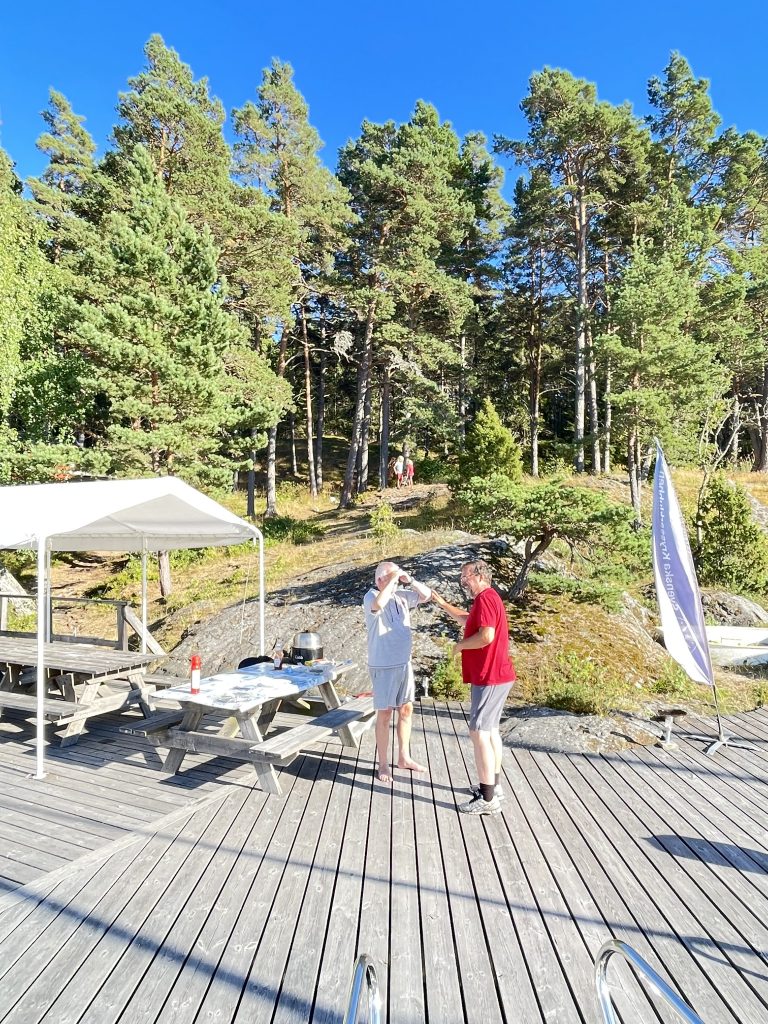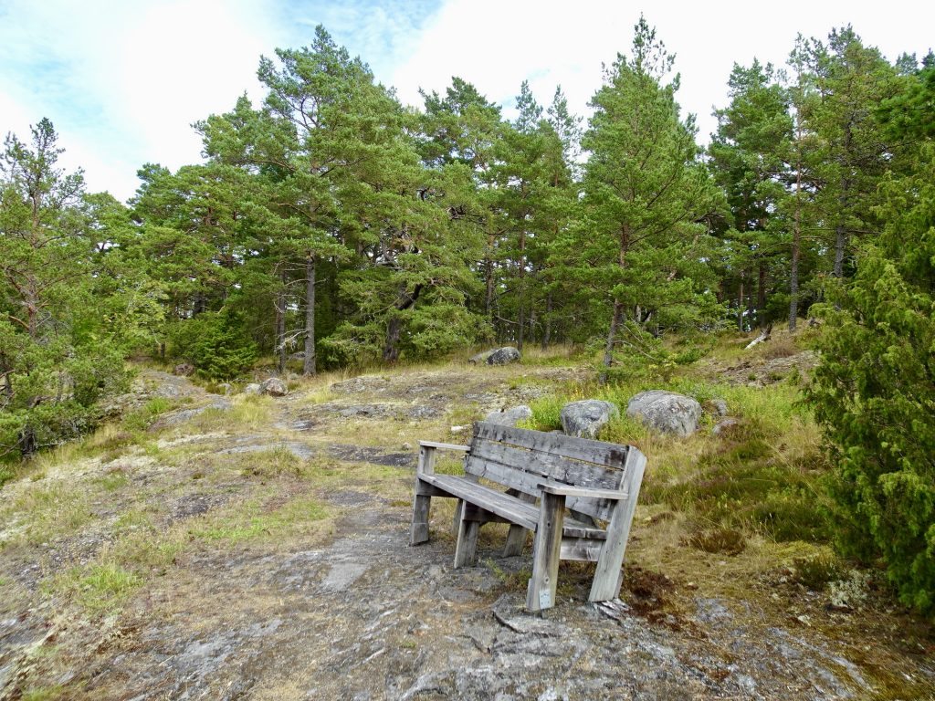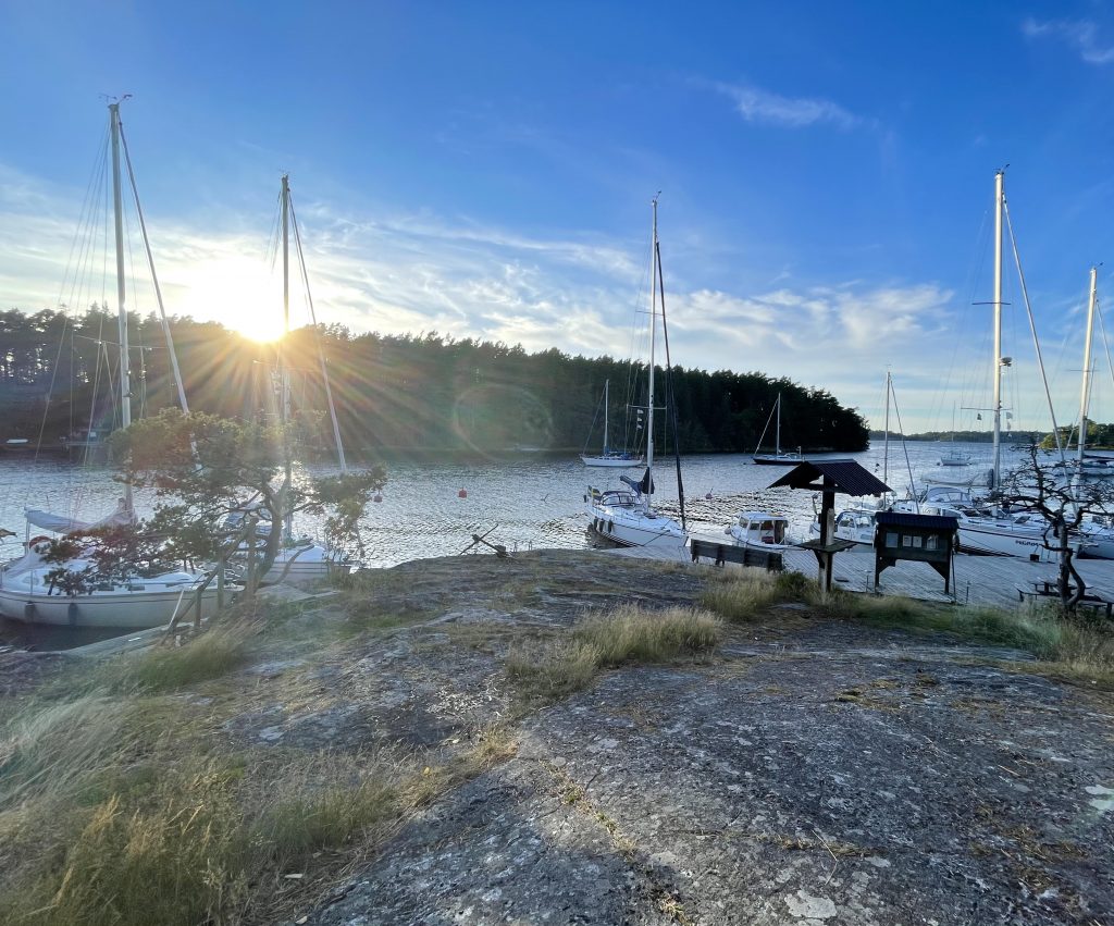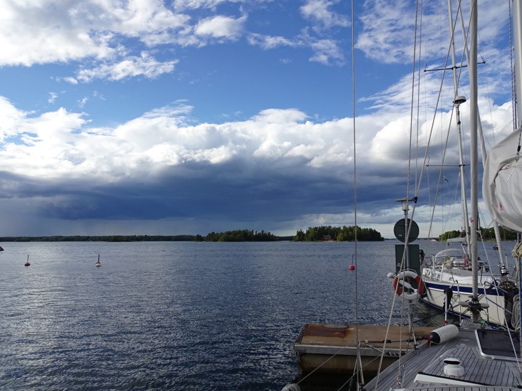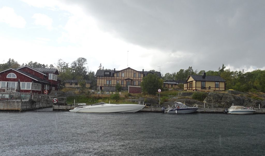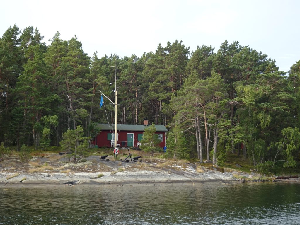 Doch es ist klar: am nächsten Morgen müssen wir weg. Und so starten wir am Mittwoch (10.08.) erstmal in Richtung Möja. Zwar eine größere Insel, aber ein kleinerer Hafen. Den wollen wir uns wenigstens mal anschauen. Doch schon auf dem Weg dahin entscheiden wir, lieber weiterzufahren. Der Wind hat reichlich zugelegt und der Hafen ist nett, aber winzig. Wir steuern also lieber eine kleine Bucht an, die wir schon mal besucht haben und von der wir wissen, wie ruhig man dort liegt. In Norrviken auf Storön gehen wir dieses Mal nicht an eine Boje, da die drei Schiffe, die schon da sind (es gibt 5 Bojen), doch im Wind reichlich hin und her schwojen. Da haben wir heute mal keine Lust drauf. Wir machen am Steg fest und haben so auch die Möglichkeit, das Mini-Saunahaus zu nutzen. Das lag Ende Mai, bei unserem ersten Besuch, noch winter-gesichert an Land. Der kleine Spaziergang über die Insel – noch nicht zu viel herumlaufen, von wegen dem Knie – bringt uns zu einem schönen Aussichtsplatz mit Blick über die Bucht. Jetzt muss nur noch die Sonne wieder richtig hinter den Wolken hervorkommen.