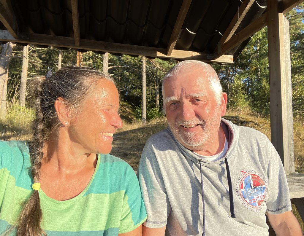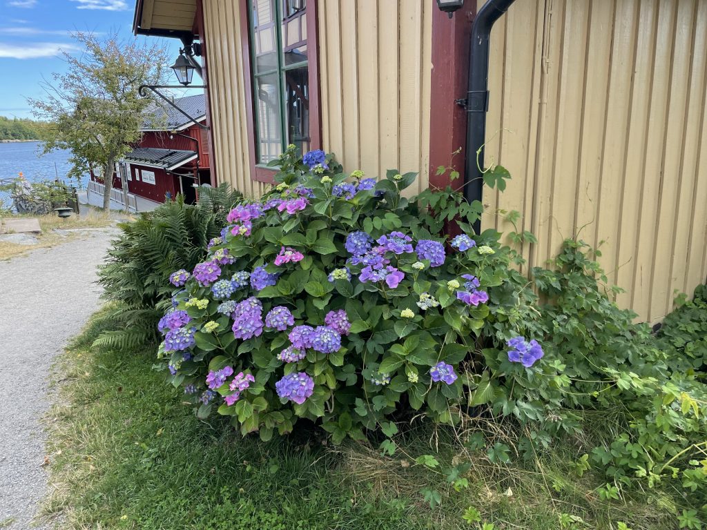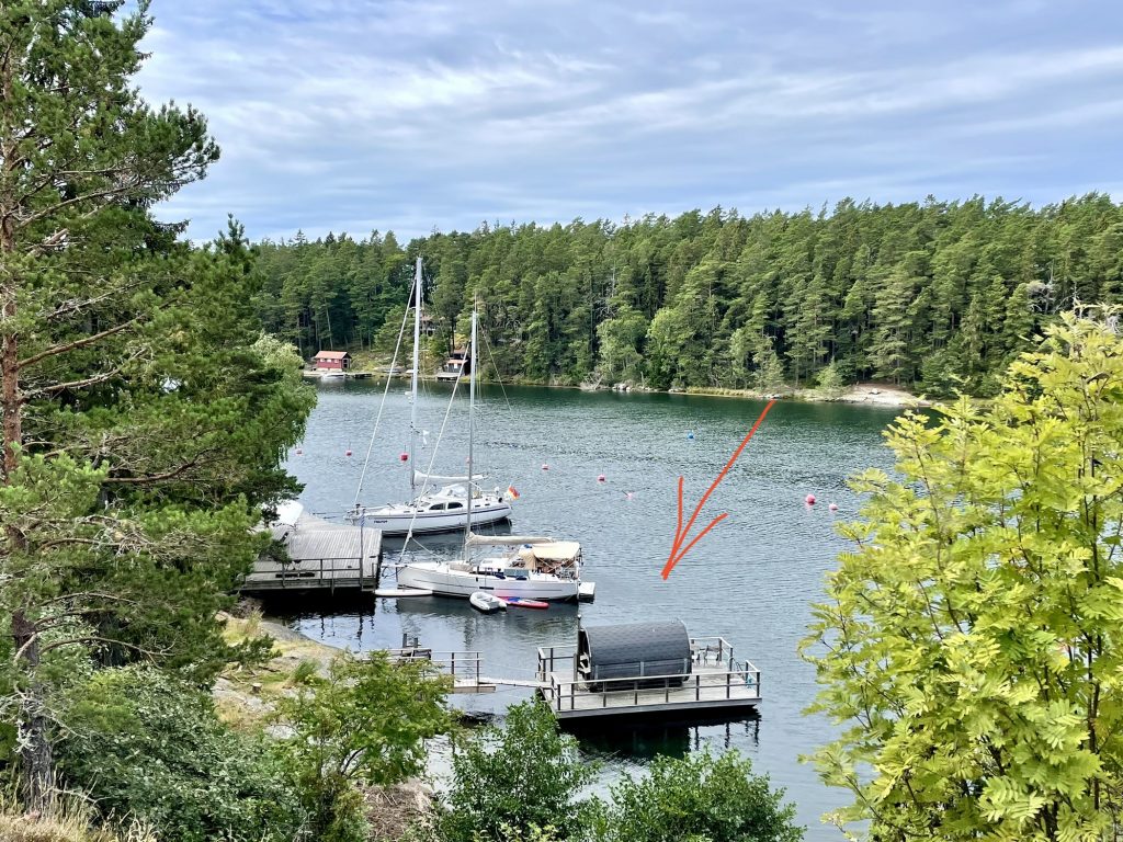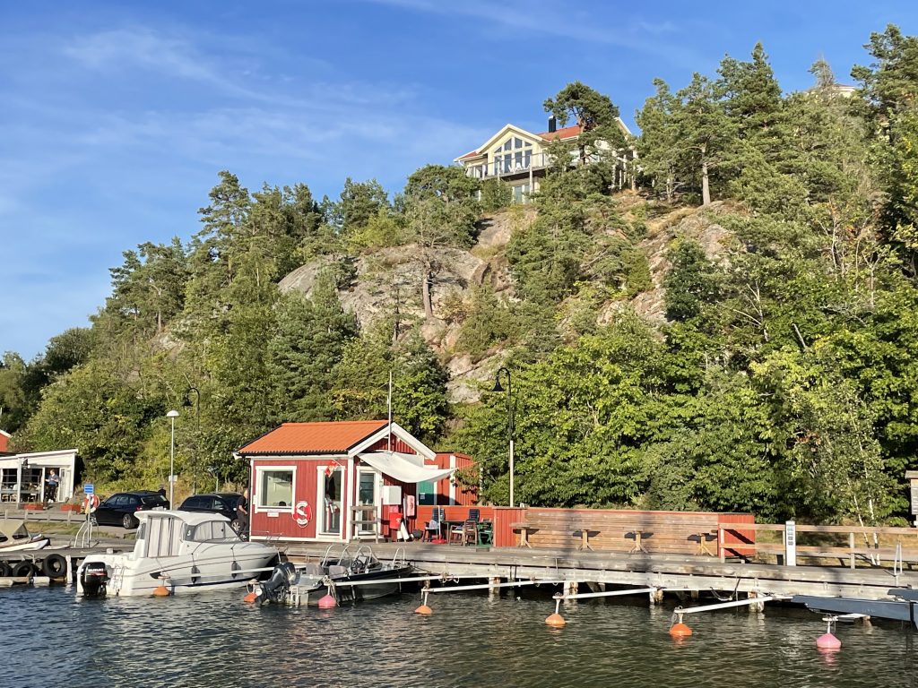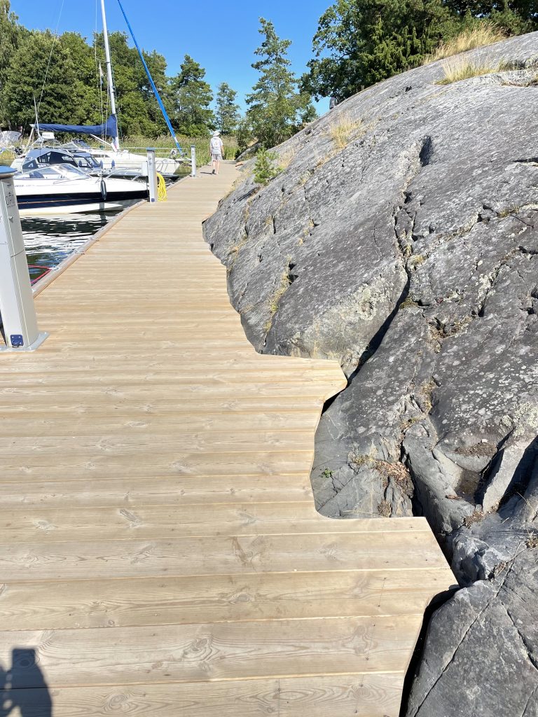 Doch es ist klar: am nächsten Morgen müssen wir weg. Und so starten wir am Mittwoch (10.08.) erstmal in Richtung Möja. Zwar eine größere Insel, aber ein kleinerer Hafen. Den wollen wir uns wenigstens mal anschauen. Doch schon auf dem Weg dahin entscheiden wir, lieber weiterzufahren. Der Wind hat reichlich zugelegt und der Hafen ist nett, aber winzig. Wir steuern also lieber eine kleine Bucht an, die wir schon mal besucht haben und von der wir wissen, wie ruhig man dort liegt. In Norrviken auf Storön gehen wir dieses Mal nicht an eine Boje, da die drei Schiffe, die schon da sind (es gibt 5 Bojen), doch im Wind reichlich hin und her schwojen. Da haben wir heute mal keine Lust drauf. Wir machen am Steg fest und haben so auch die Möglichkeit, das Mini-Saunahaus zu nutzen. Das lag Ende Mai, bei unserem ersten Besuch, noch winter-gesichert an Land. Der kleine Spaziergang über die Insel – noch nicht zu viel herumlaufen, von wegen dem Knie – bringt uns zu einem schönen Aussichtsplatz mit Blick über die Bucht. Jetzt muss nur noch die Sonne wieder richtig hinter den Wolken hervorkommen.