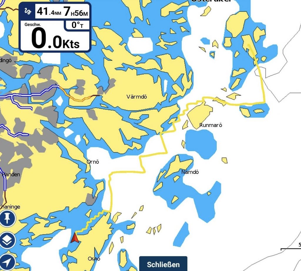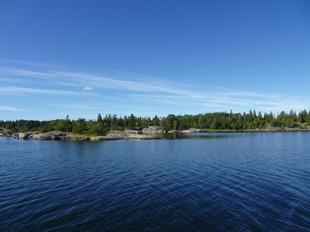 Am nächsten Morgen, nach dem Frühnebel, starten wir den Jockel und machen uns auf den Weg in eine viel gepriesene und empfohlene Ankerbucht. Eigentlich wollten wir nochmal weiter nach Osten in die Außenschären fahren und Ulfs Tipps beherzigen. Eine Fahrt direkt bis nach Stockholm rein steht nicht an – das ist uns alles zu trubelig und voll. Da aber für die nächsten Tage mal wieder etwas stärkerer Wind angesagt ist, planen wir um. Der äußere Schärengürtel ist nur etwas für ruhiges Wetter. Die Inselchen dort sind eher etwas flacher und nicht so groß und geben gegen stärkeren Wind nicht viel Schutz. Also bleiben wir im mittleren Schärengürtel. Heute kommt uns allerdings der Wind erstmal direkt entgegen, aber bei 0-1Bft macht das nichts – es freut den (sauberen) Motor. Wir haben eine tolle Fahrt, die uns wieder durch den Blidö-Sund führt. Wir können uns nicht sattsehen, obwohl wir hier auf der Nord-Fahrt vor vielen Wochen schon mal längs sind.