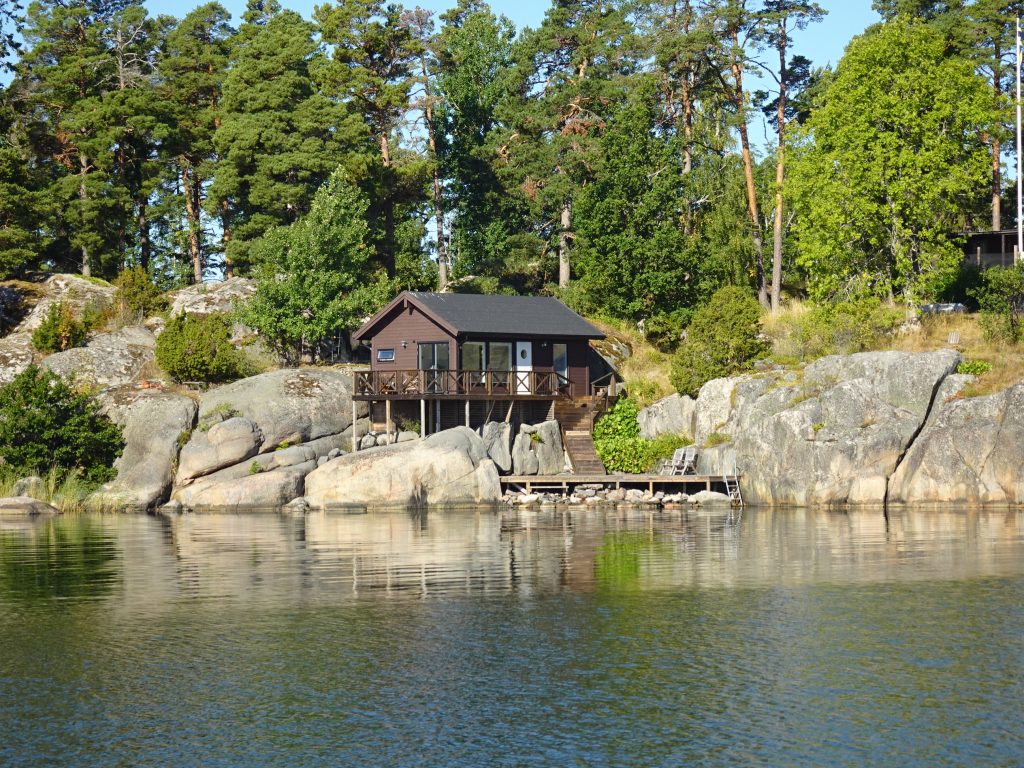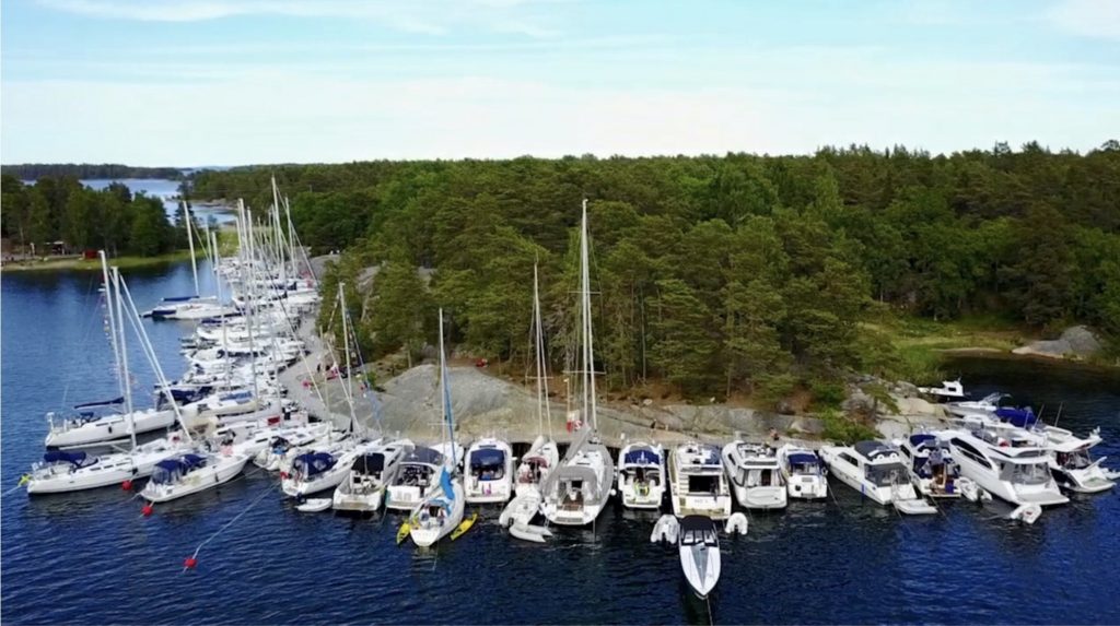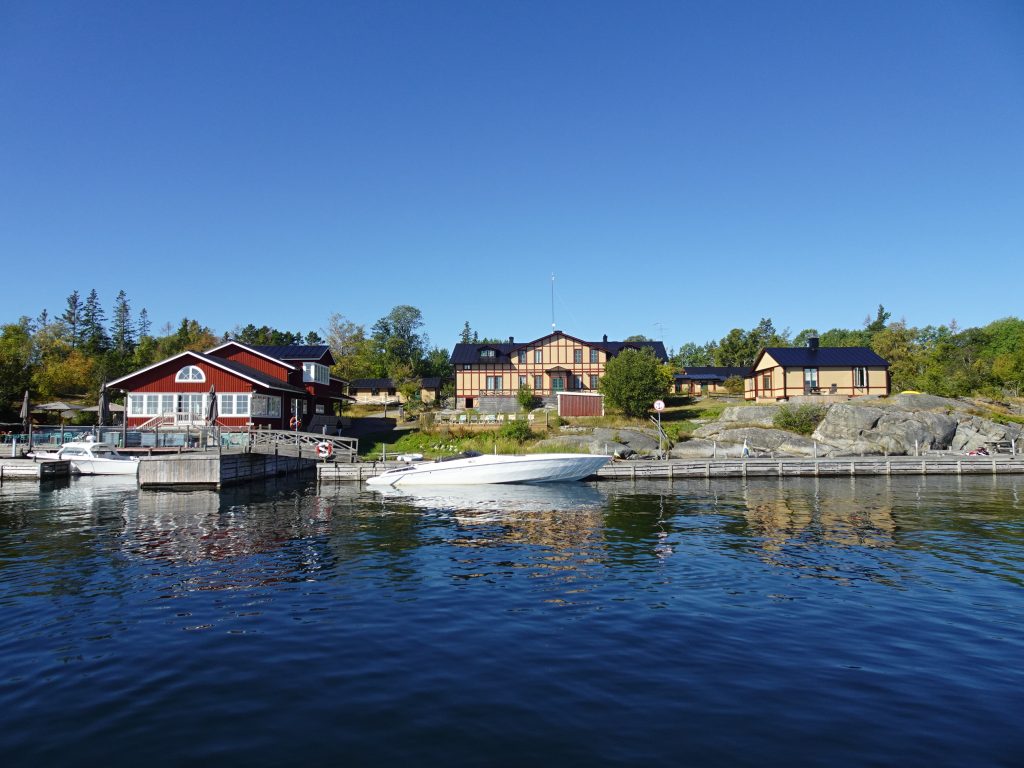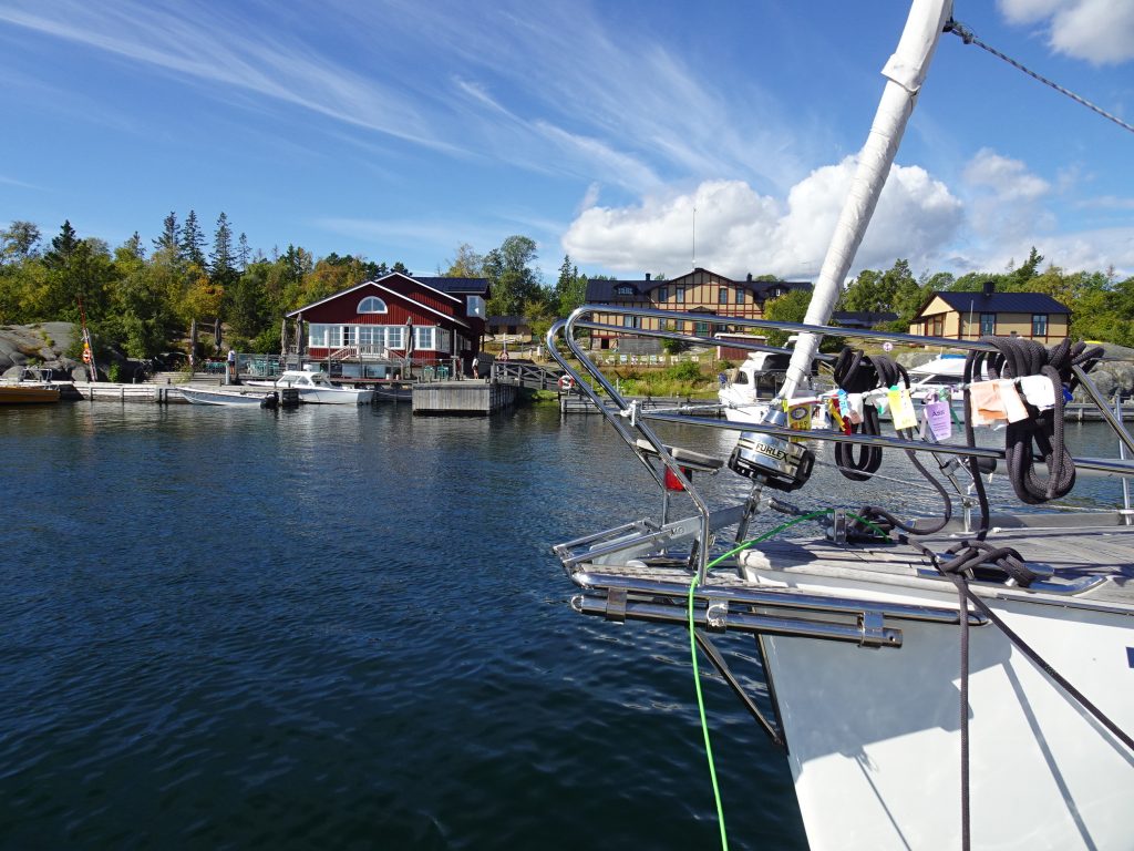 Dann irgendwann kommen wir zu einer engen und flachen Passage und… gelangen nach Finnhamn Paradiesviken. Der Name ist Programm. Wir gelangen in eine wegen der verschlungenen Einfahrt rundum gut geschützte Bucht. Man kann frei ankern, fest mit Heckanker den Bug dicht an den Felsen fahren und dort – oder an einem Baum – festmachen, oder man kann eine der wenigen Heckbojen nutzen, die vor einem erst kürzlich gebauten kleinen Steg ausliegen.