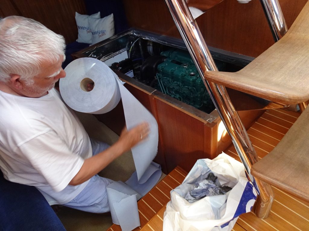 Glück für mich, dass mein Knie noch nicht wieder ganz ok ist und ich es lieber nicht so lange anwinkele bzw. hockend belaste und so muss Kalli die Motorraum-Reinigung alleine vornehmen… und er hat auch wirklich wieder alles gut sauber bekommen! Ich versuche es mit moralischer Unterstützung. Allerdings: Ablegen wird verlegt auf 10h.