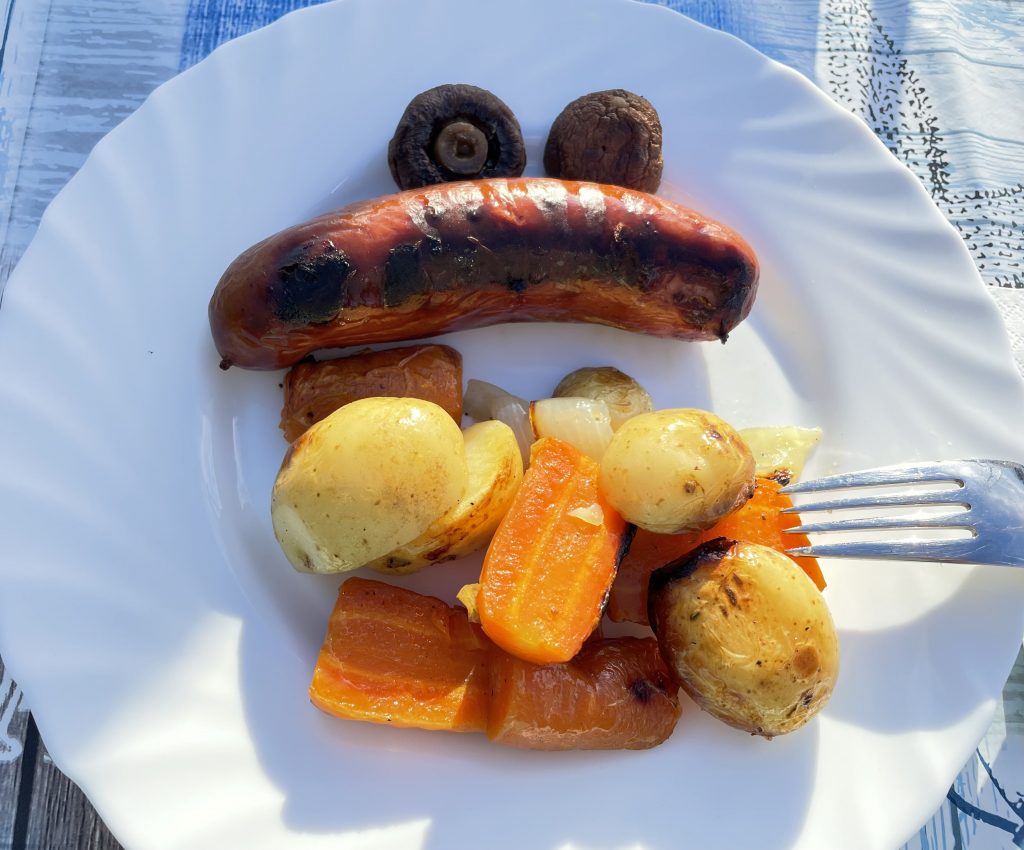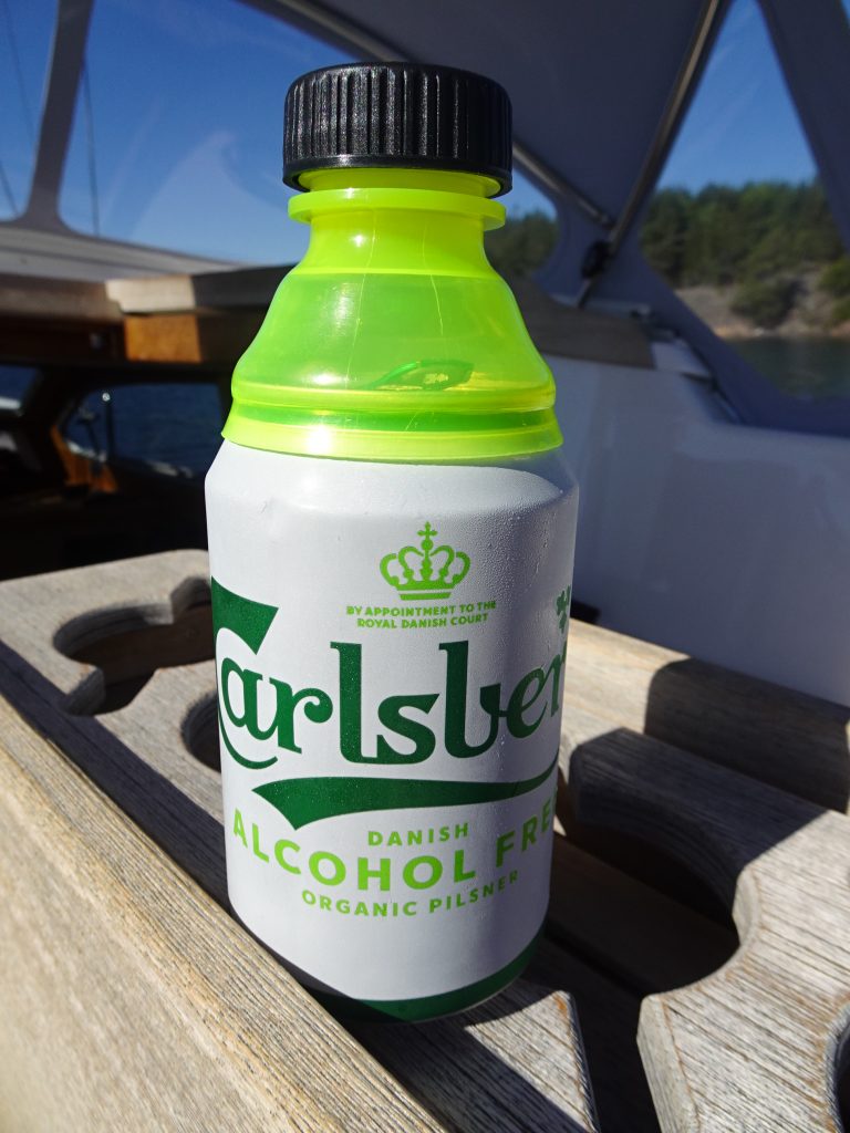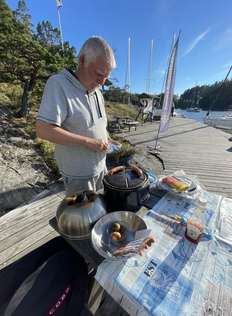 Am Abend wird endlich mal wieder gegrillt. Nach Kallis Saunagang – ich passe derweil strickend auf’s Schiff auf 🧶😜 – packen wir unsere Grillutensilien zusammen und bereiten uns leckeres Gemüse und Würstchen. Wir haben einen prima Sitzplatz direkt vorm Schiff und brauchen nichts weit tragen. Nach dem Essen können wir noch zwei ältere Segler – zwei Brüder, 81+70 Jahre alt – mit unserem noch heißen Grill beglücken: sie suchen nämlich ihr ganzes Schiff durch und finden ihre Grillkohle nicht. Die haben sie wohl beim letzten Stopp irgendwo stehen gelassen. Nun sind sie happy, dass es zum Abendessen Steaks statt trocken Brot gibt… und bedanken sich mit Rotwein. Verwunderlich ist allerdings, dass sie die Suche nach der Grillkohle im Ankerkasten beginnen. Es gibt auf einem Schiff kaum einen feuchteren Platz, als den Ankerkasten und er ist der wirklich allerletzte Ort, um Grillkohle zu verstauen. Wieso tut man das? Nunja… jeder hat halt seine Vorlieben 🤷🤷