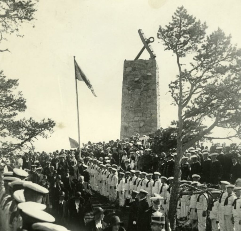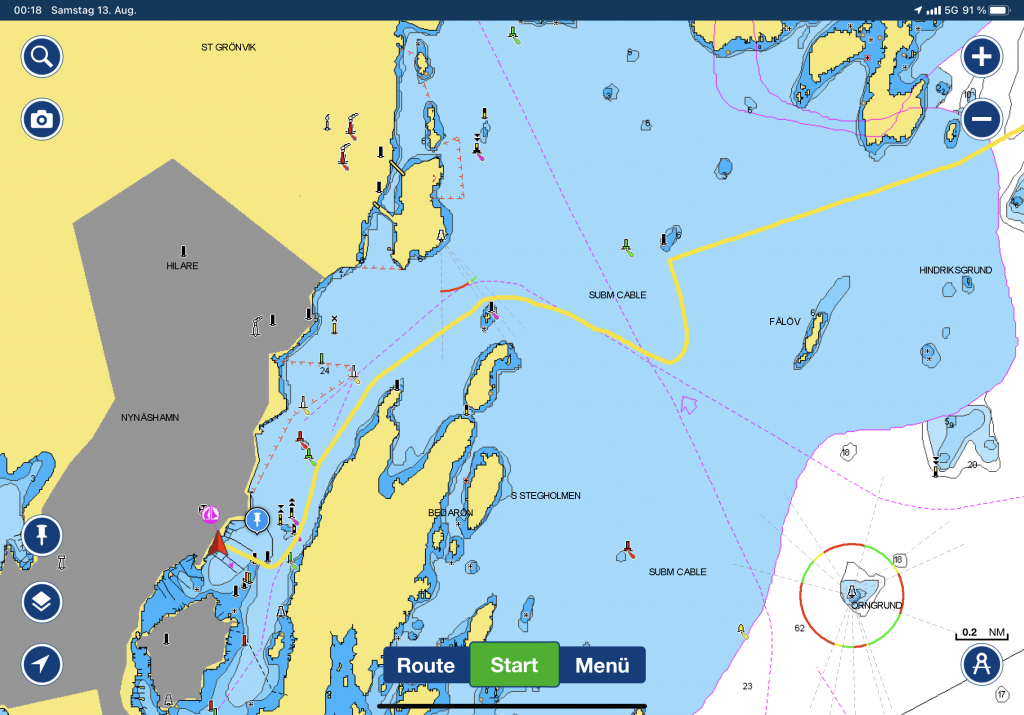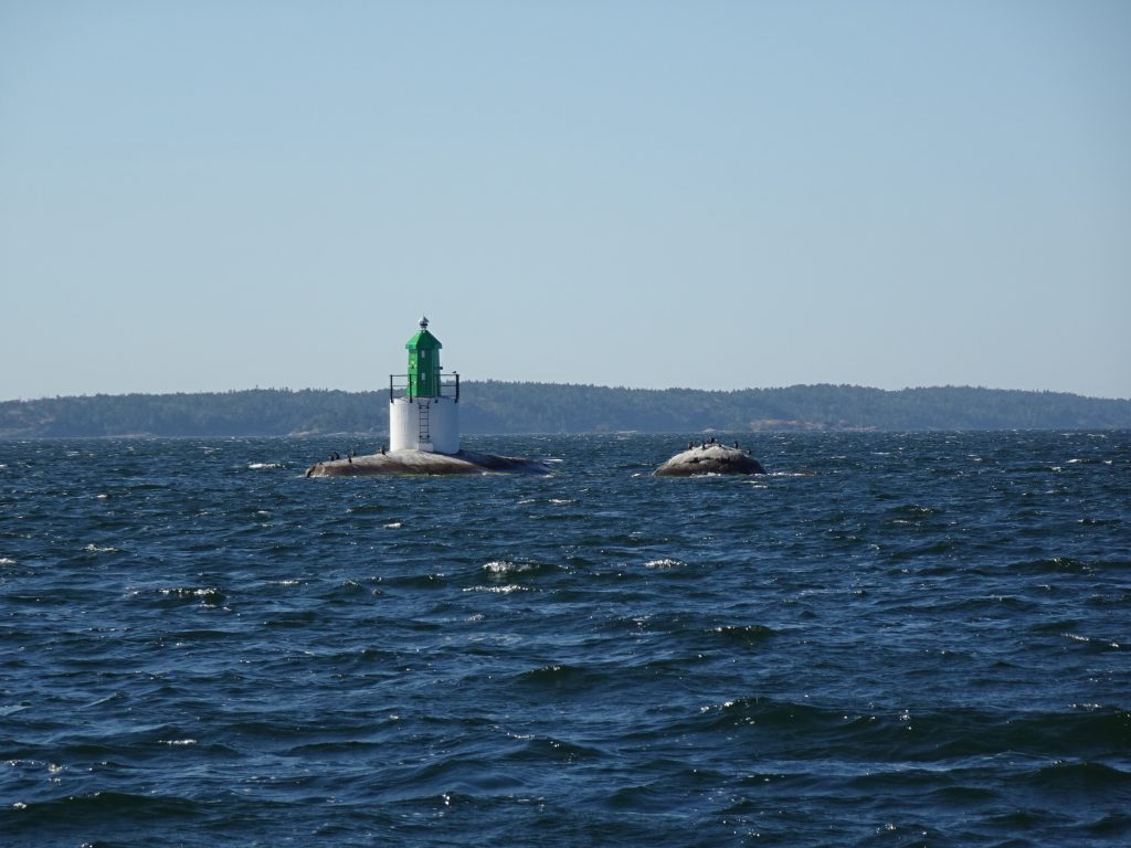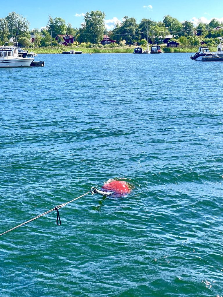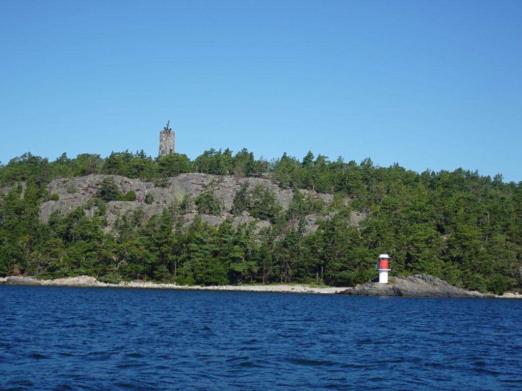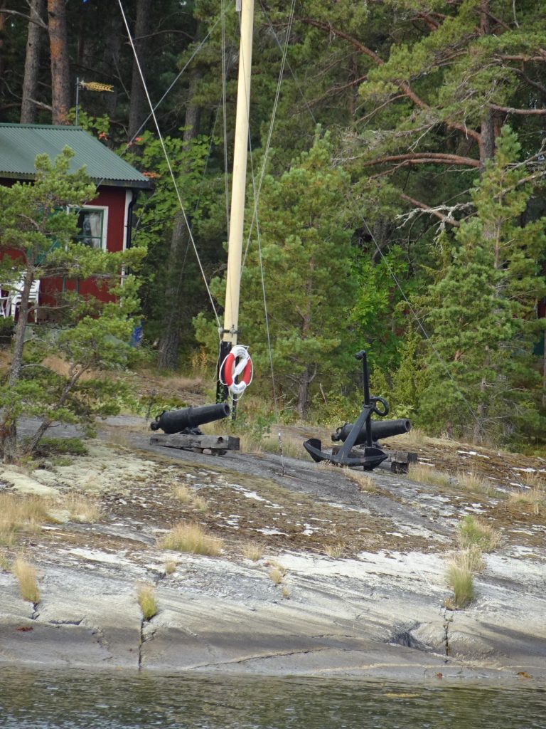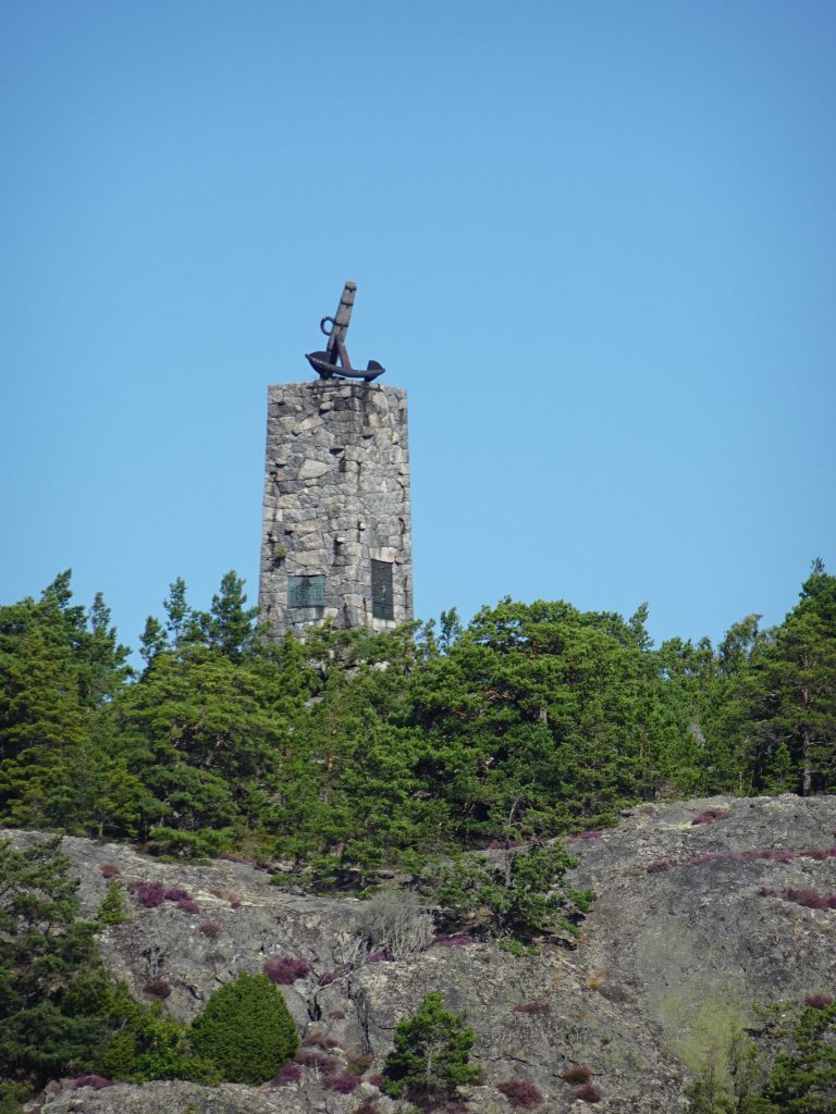 Unsere Etappe am Freitag (12.08.) bringt uns dann tatsächlich nach Nynäshamn. Unterwegs leider Wind wieder genau von vorne. Zuerst ganz wenig… dann langsam etwas mehr… Wir kommen an einem Felsen mit einem riesigen Anker oben drauf vorbei. Den haben wir auf der Hinfahrt schon gesehen, aber damals nicht weiter beachtet. Wie haben sie den denn da hoch bekommen? Wikipedia weiß zumindest, weshalb er da ist: der große Anker ist ein Dankmal, eingeweiht 1930, in Erinnerung an die Abfahrt Gustav II. Adolf am 17. Juni 1630 mit seinen Truppen nach Deutschland in den 30-jährigen Krieg. Für viele an Bord war dieser Felsen das Letzte, was sie von Schweden sahen. Der Krieg dauerte bis 1648.