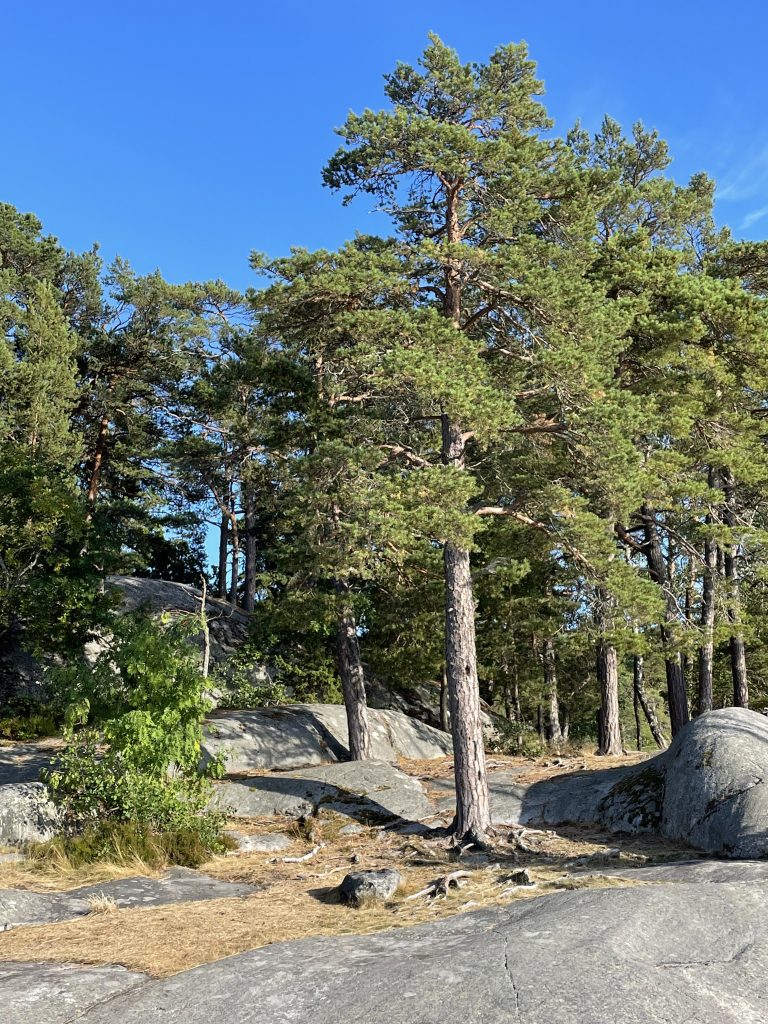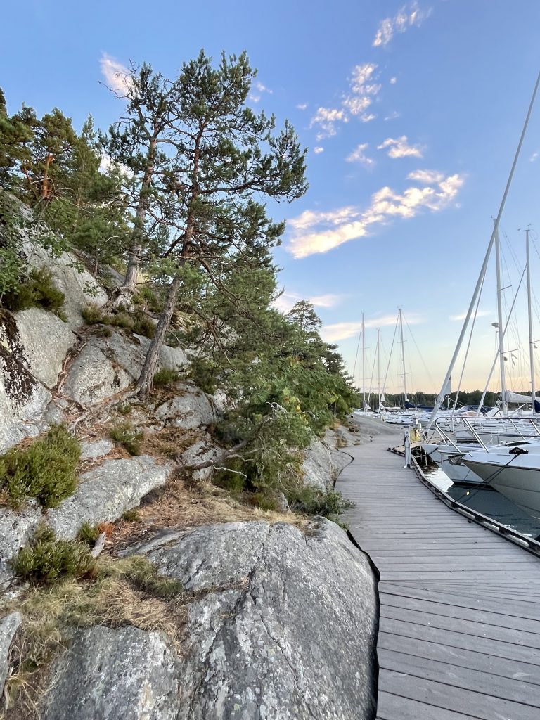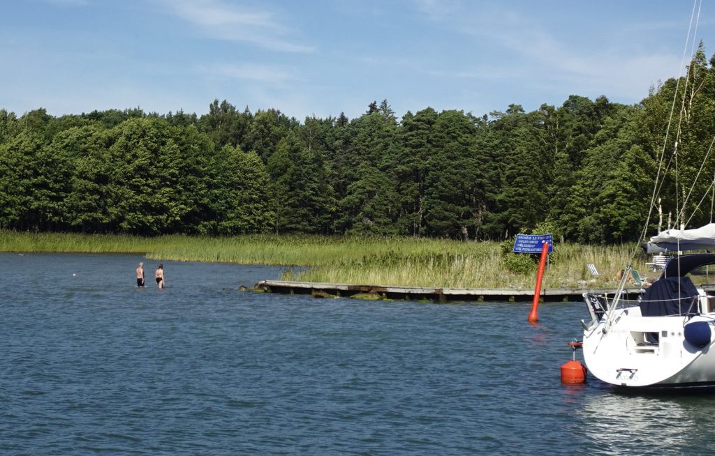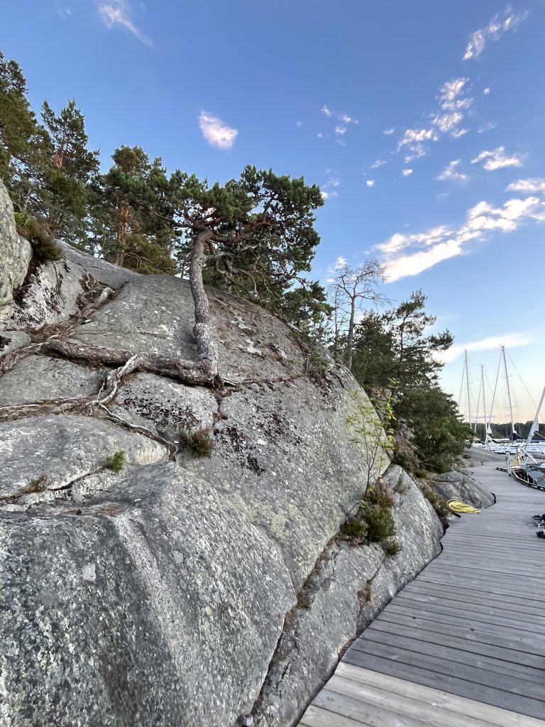 Es ist wirklich idyllisch hier. Glatte Felsen, knorrige Bäume, ein bisschen Schilf, ein kleiner Strand… Allerdings ist es, trotz nahendem Schweden-Ferienende, für unsere Begriffe zu voll. Man sagt uns allerdings, dass, wenn es richtig voll ist, die Schiffe dicht an dicht gedrängt und manchmal sogar in zweiter Reihe am Steg liegen… und mindestens 20 Schiffe frei ankern.