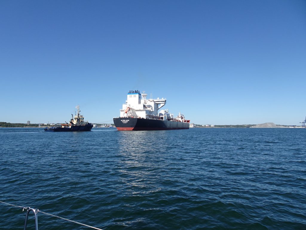 Kurz vor dem Hafen beruhigt sich der Wind wieder ein wenig. Als wir uns dem Industriehafen nähern, weichen wir lieber einem großen Frachter aus, der von zwei Schleppern an seine Entladeposition bugsiert wird. Kalli funkt ihn an und bekommt die freundliche Antwort: „wir nehmen eh grad die Geschwindigkeit zurück, fahrt ruhig so weiter, das sollte passen. Und wenn nicht, dann fahrt doch einfach hinter uns durch.“ Tolle Antwort… wir fahren hinter ihm durch.