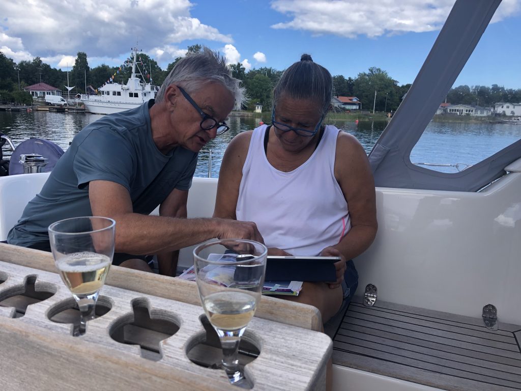 Wir nutzen den verregneten Tag – Knie schonend – mit dem Studium von Hafenhandbüchern. Es gibt hier im Stockholmer Schärengarten so viele kleine Inselchen und schönen Plätze, dass es wirklich schwerfällt, eine Auswahl zu treffen. Aber einige „da-müssen-wir-unbedingt-hin-Plätze“ haben wir jetzt auf der Liste und hoffen auf den jeweils passenden Wind.
