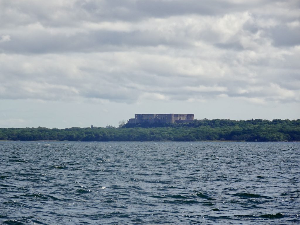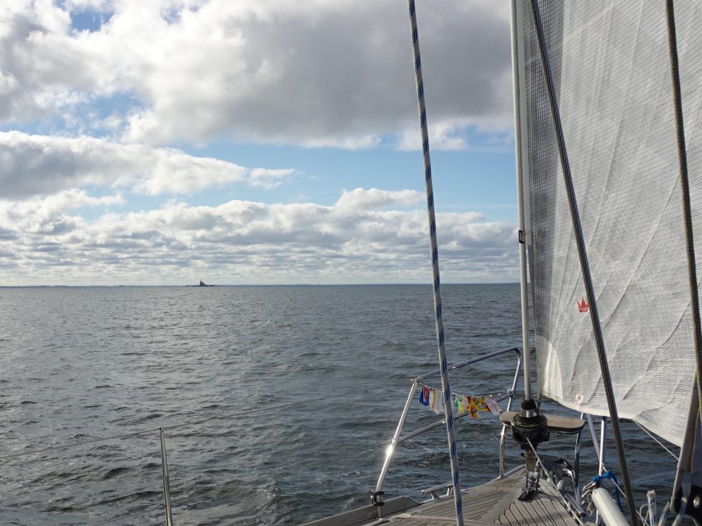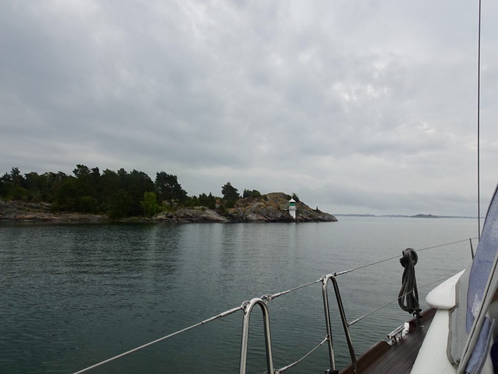 Am nächsten Morgen (Dienstag, 23.08.) schwächelt der Sommer dann doch. Vielleicht will uns aber auch das etwas trübe Wetter nur den Abschied aus den Schären leichter machen. Denn heute geht es nun wirklich raus aus dem breiten Schärengürtel vor dem Festland. Es gibt zwar im Kalmarsund, in den wir jetzt gelangen, an der Küste entlang auch vorgelagerte Schären, aber kleiner, flacher, und mit drumherum geringeren Wassertiefen, die nicht mehr so gut für unser Schiff geeignet sind. Aber ein gutes hat das Wetter: es ist mal wieder schöner Wind zum segeln. Also nichts wie alle Segel hoch. Allerdings währt das Glück nicht sehr lange. Der Wind begibt sich schnell wieder zur Ruhe und so motoren wir durch eine Ansammlung von Grautönen bis zu unserem nächsten Ziel. Selbst die Blå Jungfrun, eine einzelne Insel im Kalmarsund mit ihrer markanten Silhouette, sieht nur wie ein grauer Klumpen im Wasser aus.