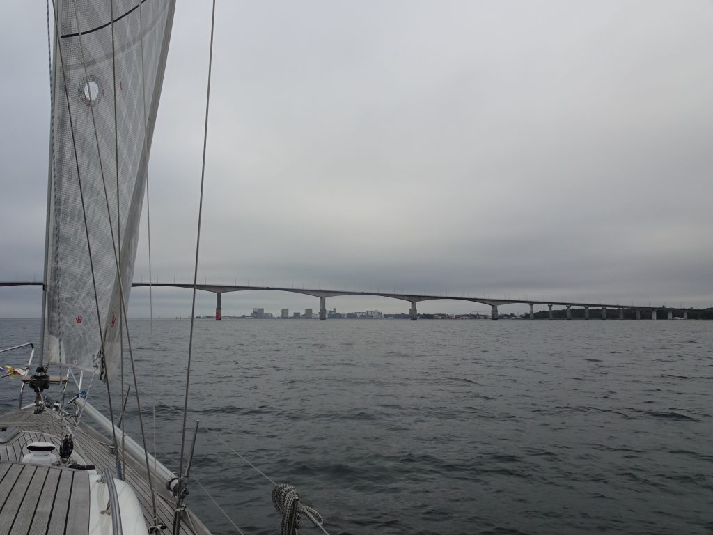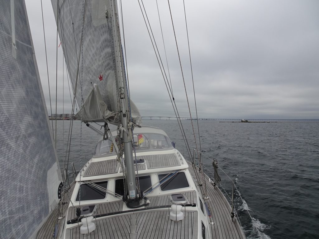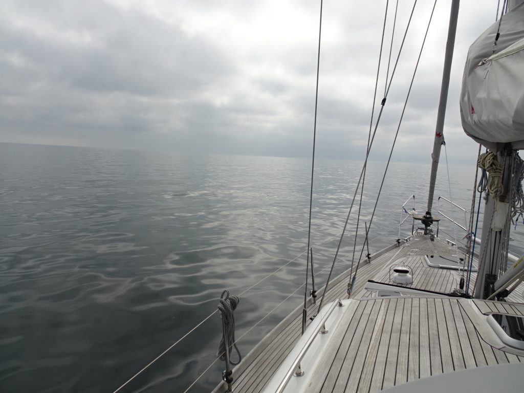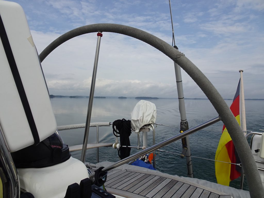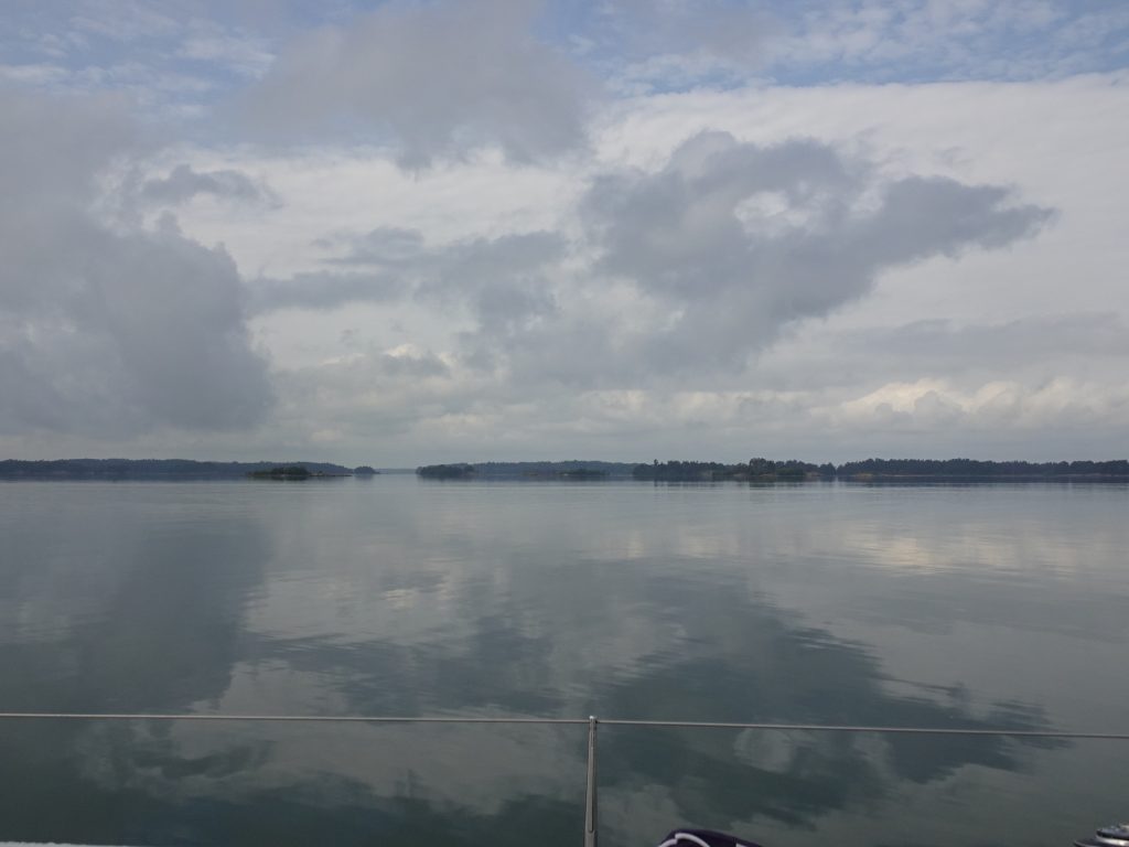 Zum aufwachen gibt es eine Mischung aus Grau… alles zwischen zartgrau, staubgrau, regengrau, elefantengrau und weißgrau ist vertreten. Nur keine Sonne. Hmm!! Die krieje ma später – hoffentlich. Wir schleichen uns leise aus dem Hafen – nur nicht Ulli wecken – und können bis zur Ölandbrücke schon ein wenig segeln. Dann legen wir in Kalmar eine kurze Tankpause ein. Die Bunkerstation (Tankstelle) liegt so günstig, dass wir die Gelegenheit wahrnehmen. 20 min. später sind wir aus dem Hafen wieder raus und freuen uns, dass der Wind ein wenig zugelegt hat. Eine ganze Weile genießen wir den für uns passenden Segelwind… allerdings mit grauem Segel vor grauem Himmel. Bei Sonne sehen unsere Segel irgendwie schöner aus. Bald legt sich eine bleierne Trübe über das Wasser… kaum Wind, schwül, diesig… irgendwie seltsames Wetter. Und die Sonne? Schaut einmal ganz kurz vorbei und versteckt sich dann wieder hinter blaugrauen Wolken. Dann eben heute nicht.