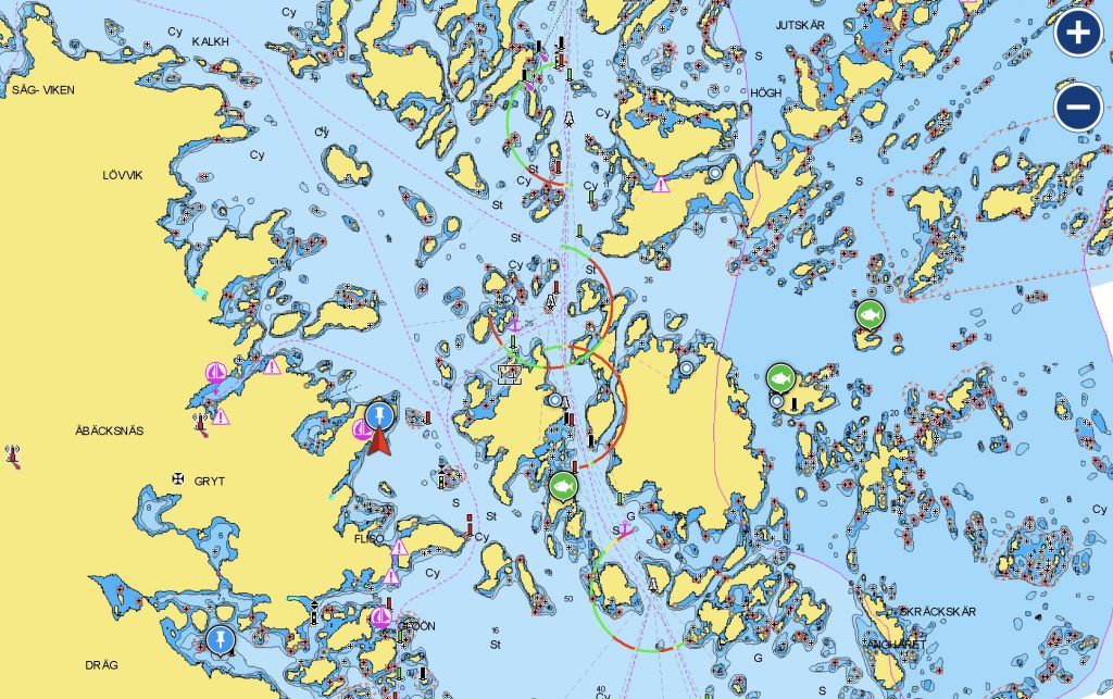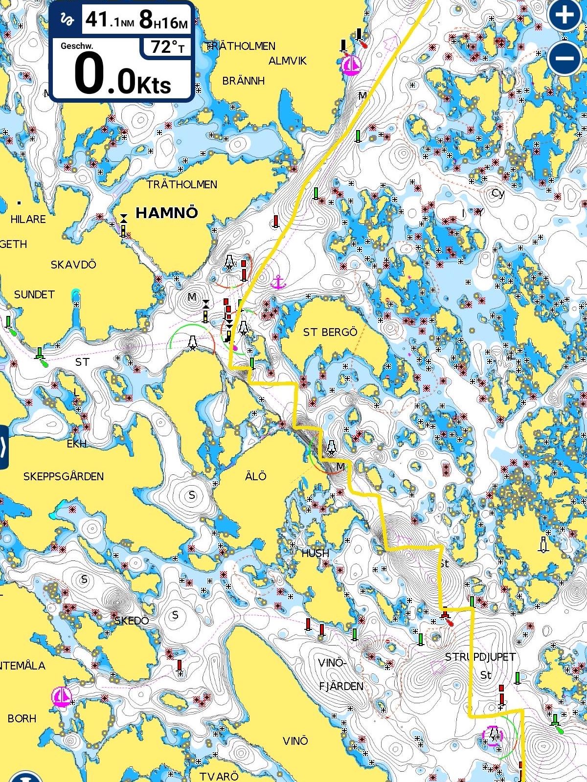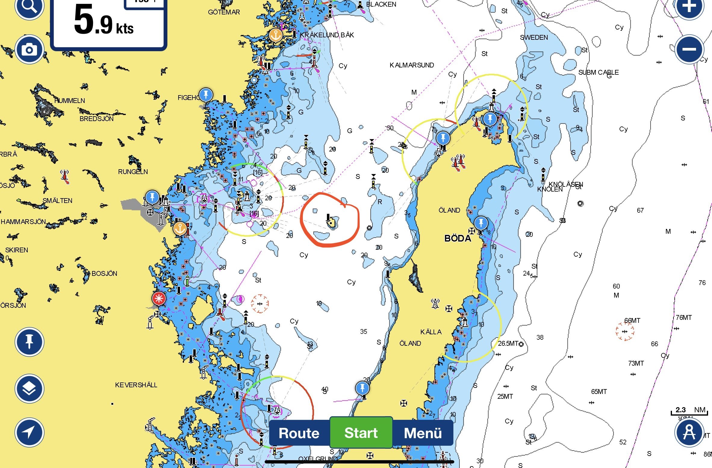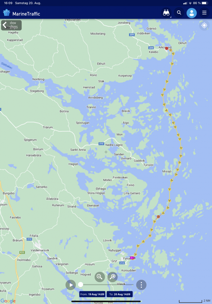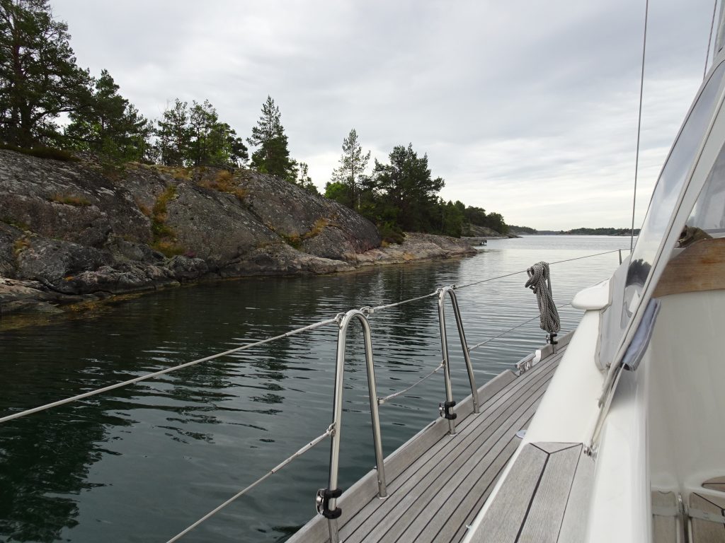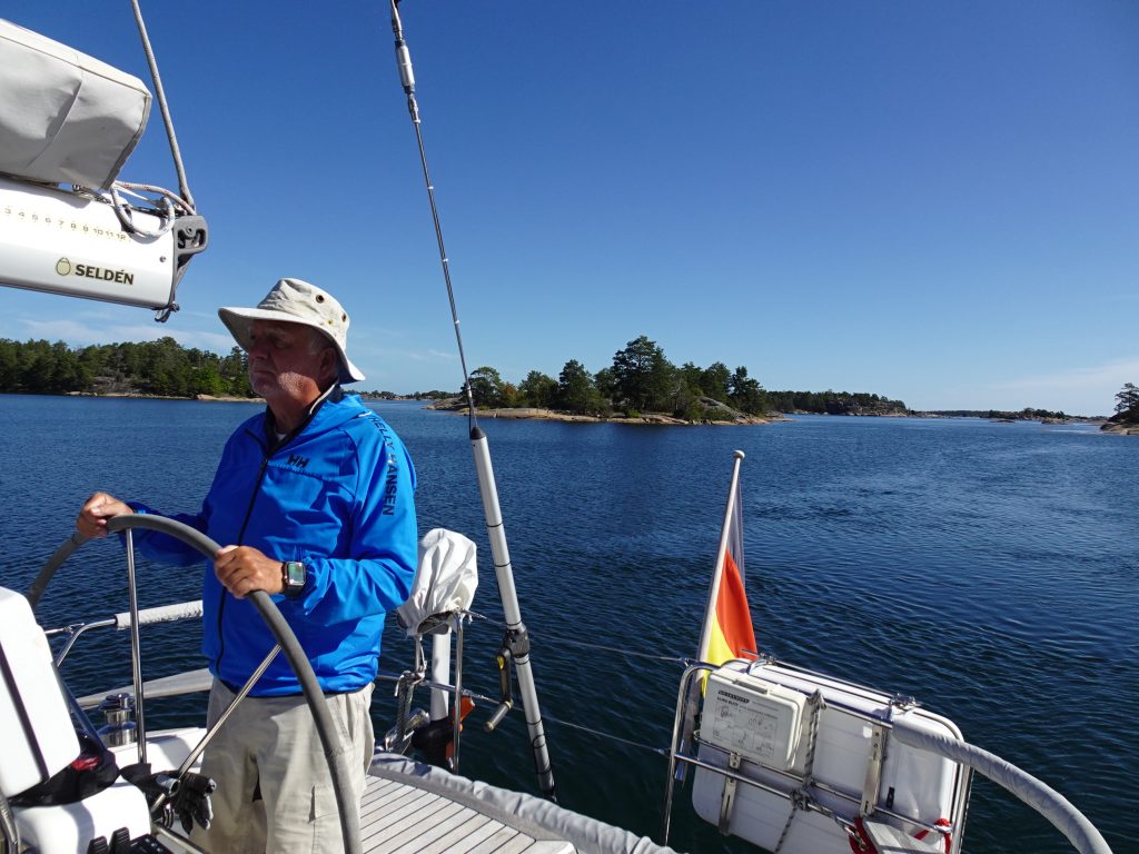 Der Montag (22.08.) ist eher ein Sonn(en)tag. Der Sommer ist doch nochmal zurück! Der Plan war, den angesagten nördlichen Wind zu nutzen, um den Schärengürtel zu verlassen und nach Öland zu segeln. Die Windrichtung stimmt zwar, aber die Stärke ist mit 1 Bft doch deutlich zu wenig, um unser Schiff voran zu bringen. Wir könnten natürlich etwas abwarten, um ggf. auf etwas stärkeren Wind zu warten – wenn er denn kommt. Ma waas es nett… Wir entscheiden, statt den Kurs nach Öland zu nehmen, lieber noch etwas durch die heute richtig toll sonnige Schärenlandschaft zu fahren – Öland muss noch warten. Doch zuerst mal ablegen und dabei keine der im Wasser hängenden Mooringleinen mit dem Ruderblatt oder womöglich der Schraube erwischen. Der Wind spielt uns in die Karten. Wir lassen uns einfach seitwärts etwas vom Steg wegtreiben bis wir über die Leinen hinweg sind und dann erst wird der Gang eingelegt. Plan hat gut geklappt und wir sind unterwegs.