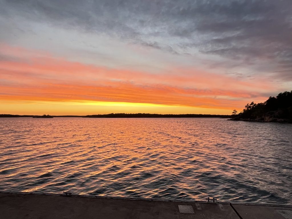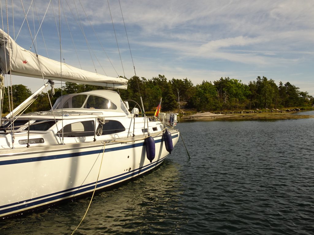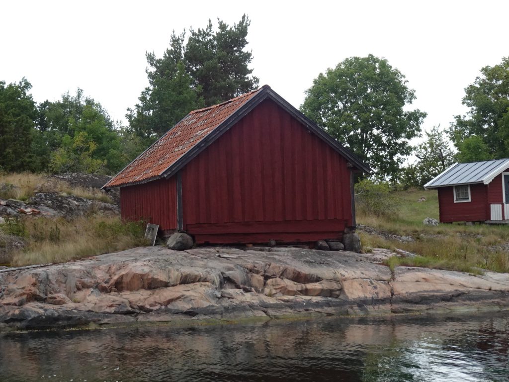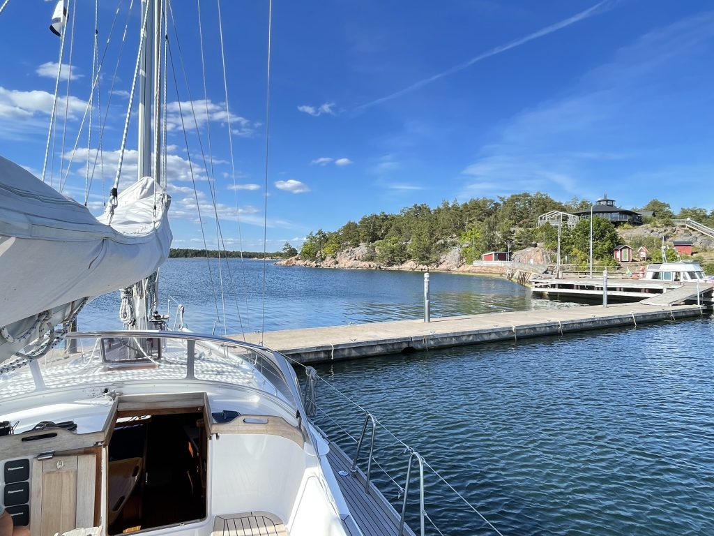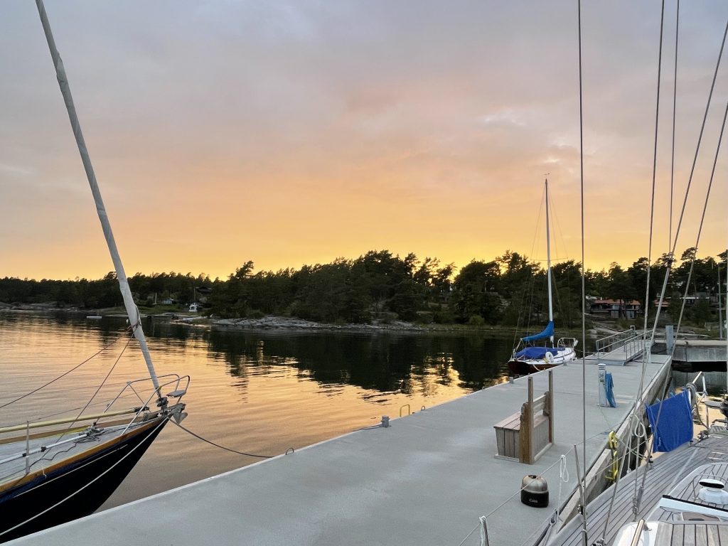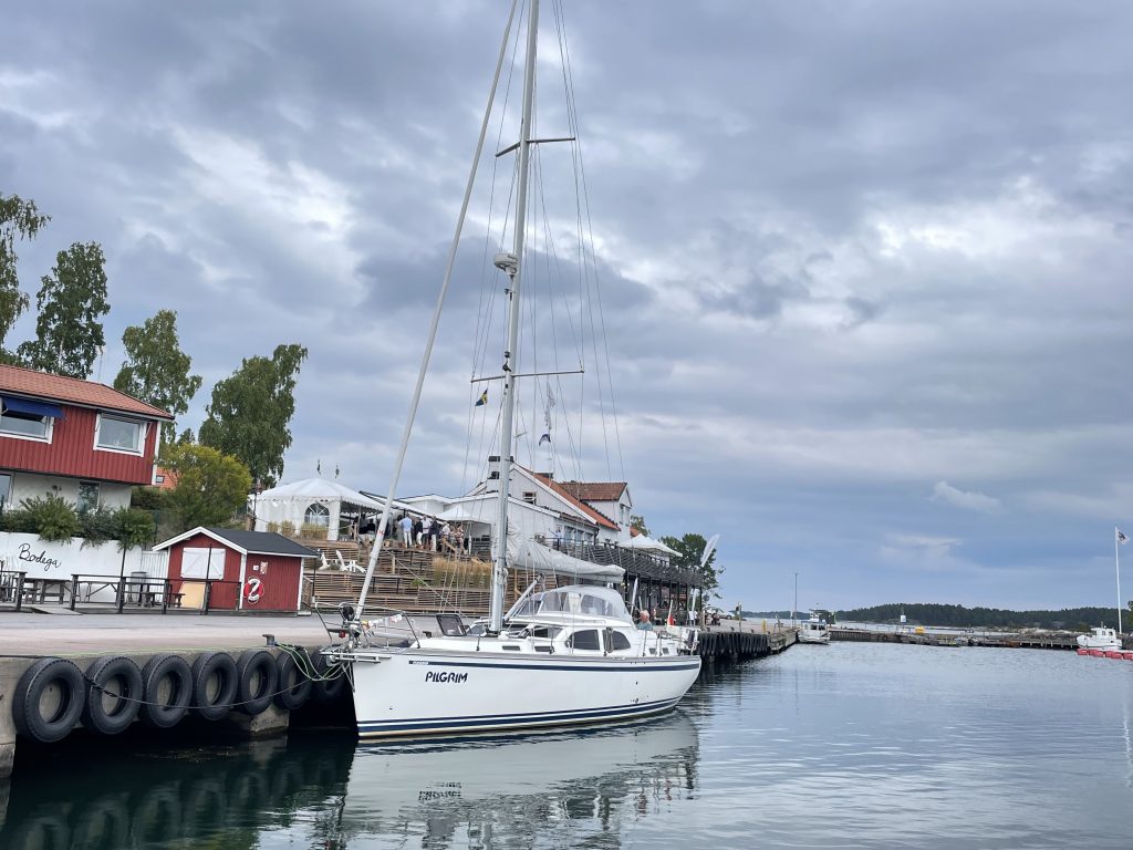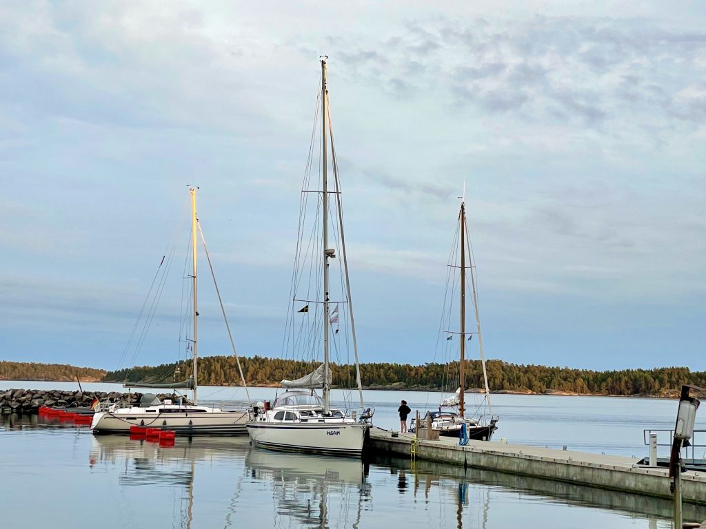 Nach heute einer mal etwas längeren Etappe – wir wollen ja die Nebeltage „aufholen“ – machen wir auf Idö fest. Der Anleger der kleinen Insel, ein einfacher Schwimmponton als Verlängerung des Mini-Hafenbeckens, ist fast verwaist und wir bekommen problemlos einen Platz. Wir machen uns erstmal mit den vorhandenen Mooringleinen fest. Und dann schnell umziehen, denn ohne Fahrtwind ist es in der Sonne ganz schön warm. Später kommt ein bisschen mehr Wind auf, der allerdings die Wellen von Achtern gegen das Schiff treibt, was eine ziemliche Plätscherei in der Achterkoje nach sich zieht. Also lassen wir uns kurzerhand seitwärts an den Schwimmponton treiben und die Mooringleinen ins Wasser gleiten. Ist ja nur ein weiteres Schiff da und wir verlegen uns auch erst, als wir meinen, dass wohl kein weiteres Schiff mehr kommt. Das auf der Anhöhe liegende Restaurant „Skärgårdskrog“ ist leider schon wieder geschlossen – Saisonende – und so bleibt uns der weite Blick über die Nachbarinseln, den man bei klaren Tagen von der Terrasse aus genießen kann, verwehrt. Hatten wir aber vor einigen Jahren schon mal (zu sehen bei „Hafenimpressionen“) und ist daher auch nicht so schlimm. Bei unserem letzten Besuch war das Essen zwar sehr gut, aber eben auch sehr teuer.