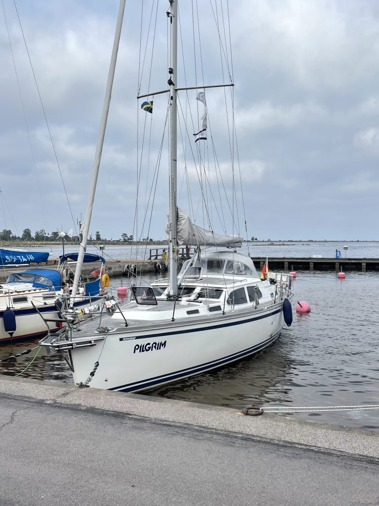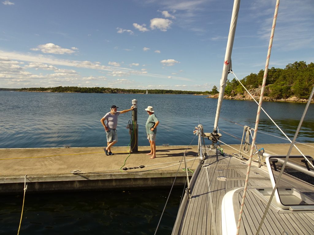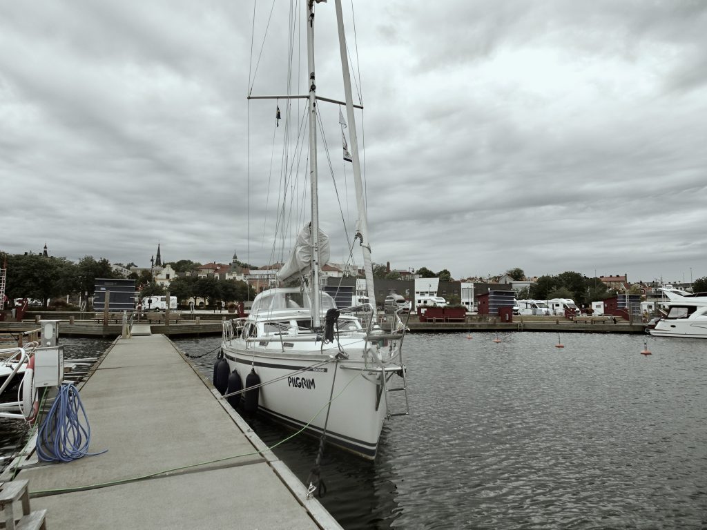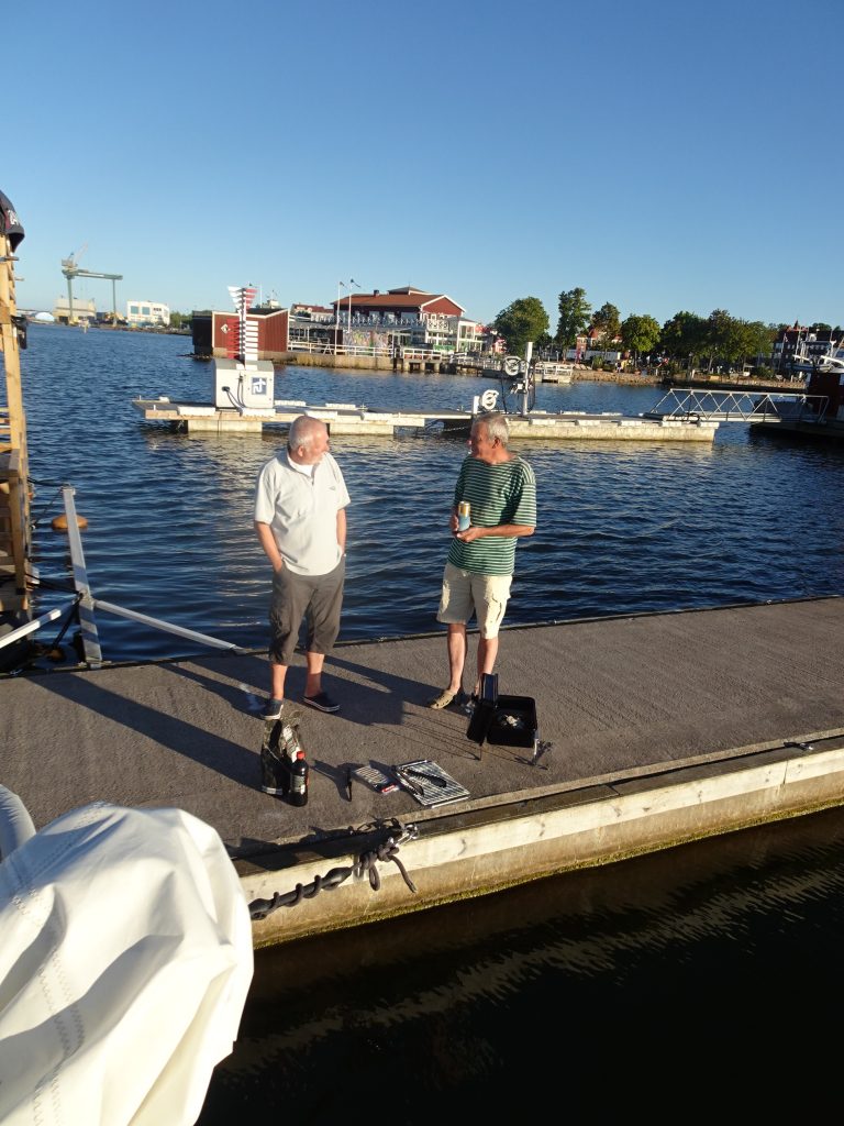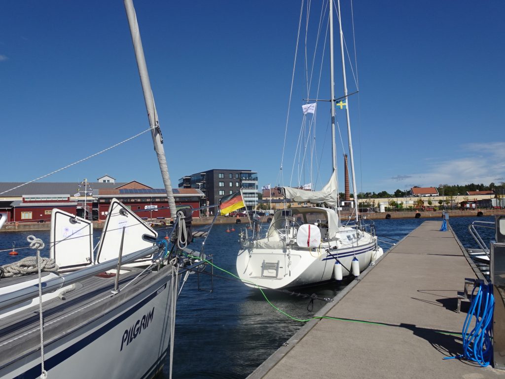 Ulli schleicht sich noch schnell vor dem (zu) kräftigen Wind nur unter Vorsegel nach Oskarshamn. Wir können ihm die Leinen annehmen, was es für ihn als Solosegler beim Anlegen schon deutlich leichter macht. Er erzählt uns dann bei einem Einlaufdrink (wir bekommen netterweise auch einen) die Geschichte seines gestrigen Erlebnisses beim Anlegen. Da hätten wir gerne Mäuschen gespielt. Aber manchmal läuft eben nicht alles rund. Vielleicht liest er ja diesen Bericht und gibt einen launigen Kommentar in seinen Worten – wäre schön.