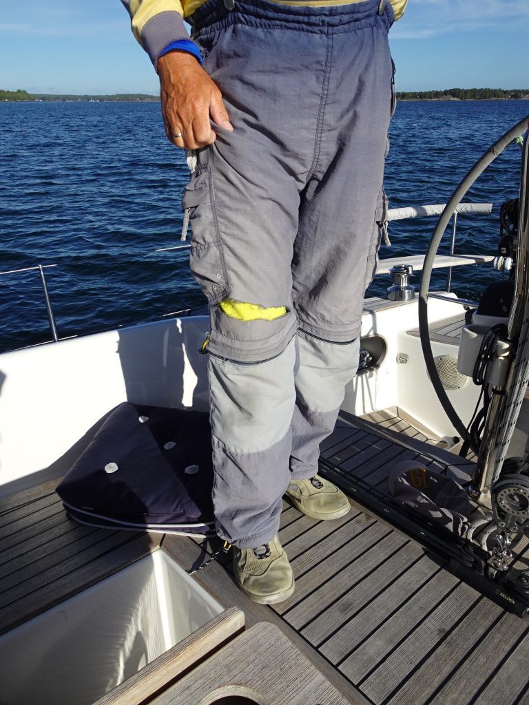Wir träumen uns so durch die Schären… da plötzlich ein großes Drama! Kallis Super-Sonder-Lieblings-Segel-Hose quittiert den Dienst. Nach 20 Jahren (!!!) als treuer Begleiter bei Wind und Wetter, bei Regen und Sonne, geht sie jetzt den Weg alles Irdischen. Der neue Riss ist nicht mehr zu flicken. Ich habe die Hose bestimmt schon 5 mal repariert, ein Mal wurde sie sogar schon professionell „restauriert“, doch inzwischen ist der Stoff einfach dünn und mürbe geworden. Kalli würde ein kleines Vermögen für genau diese Hose in Neu ausgeben. Doch wir haben schon soo intensiv gesucht. Es gibt sie einfach nicht mehr. Die Hose war sogar schon mal zum Schneider in Singapur, doch auch der hat kapituliert – zu aufwändig, solch eine Hose zu kopieren und nachzunähen. Jetzt stellt sich nur die Frage: kommt sie einfach in die Tonne oder darf sie zu Hause in eine Erinnerungs-Kiste, zu Kallis kurzer Ur-Hose (Bille und Ronny werden sich an diese erinnern) und zu der bei einem Sturm über Nacht durchgescheuerten Festmacher-Leine (die anderen Leinen haben aber gut gehalten). Was man so alles aufhebt… mal abwarten. Jedenfalls muss Kalli nun eine andere seiner langen Segelhosen langsam an die verantwortungsvolle Aufgabe der „First-Büx“ heranführen. Erstmal gibt es einen kleinen Schnaps zur Trauerbewältigung.
