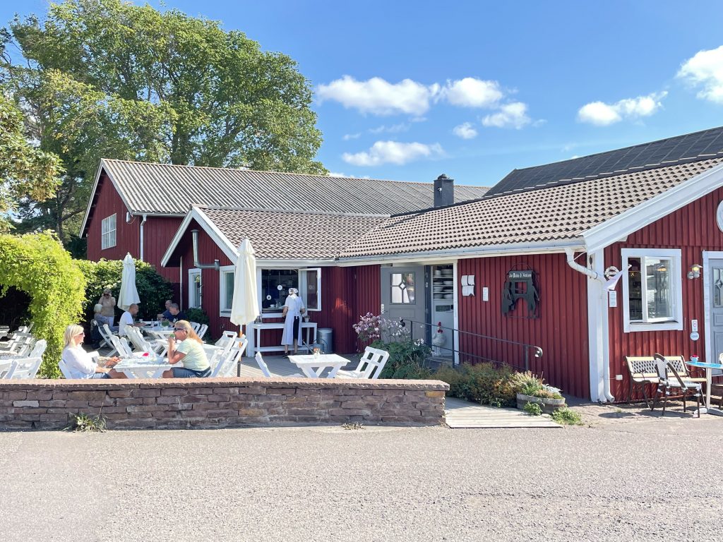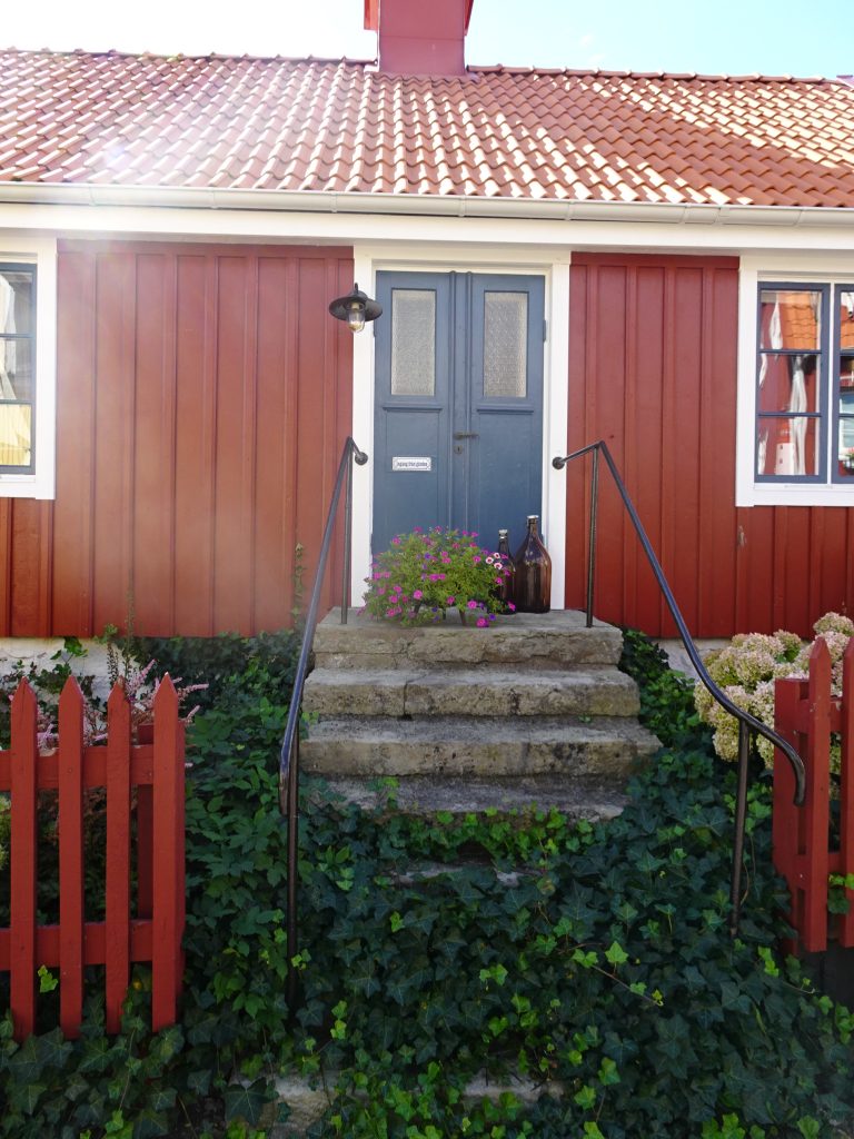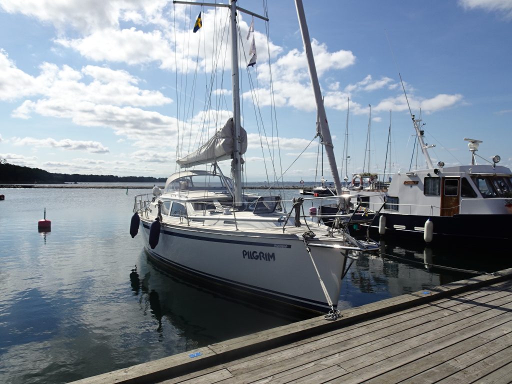 Die Sonne strahlt unterwegs zwischen einigen wenigen dekorativen Wolken hindurch und beschert uns einen richtig tollen Tag. Und dann erreichen wir einen mal wieder echt niedlichen Hafen. Bisher sind wir an ihm auf dem Weg von und nach Kalmar immer vorbeigesegelt. Beim Einlenken in die Hafeneinfahrt haben wir kurzzeitig 20kn (5Bft) Wind – tagsüber hatten wir immer 10-14kn (3-4 Bft) – aber kaum sind wir im Hafenbecken, ist der Wind wie ausgeknipst. Genial, wie geschützt dieser Hafen gegen nördliche Winde ist. Nach dem Anlegen bekommen wir von einem Urlauber gleich den Tipp, dass der hiesige Bäcker unbedingt einen Besuch wert ist. Also nichts wie hin und ausnahmsweise mal leckere Teilchen gekauft. Wir sind ja sonst nicht die Nachmittags-Kuchen-Esser, aber hier können wir nicht widerstehen. Dann noch schnell ein kleiner Rundgang durch die Umgebung, um dann pünktlich wieder am Hafen zu sein.