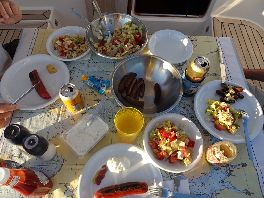 Wir genießen die Ruhe und die Sonne und knobeln aus, was uns denn die Tiefen des Kühlschranks heute abend wohl so offerieren. Ohne Restaurant sind wir selber Küchenchef.