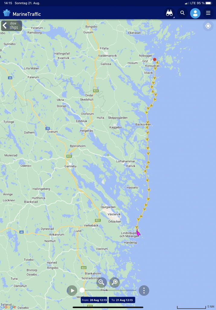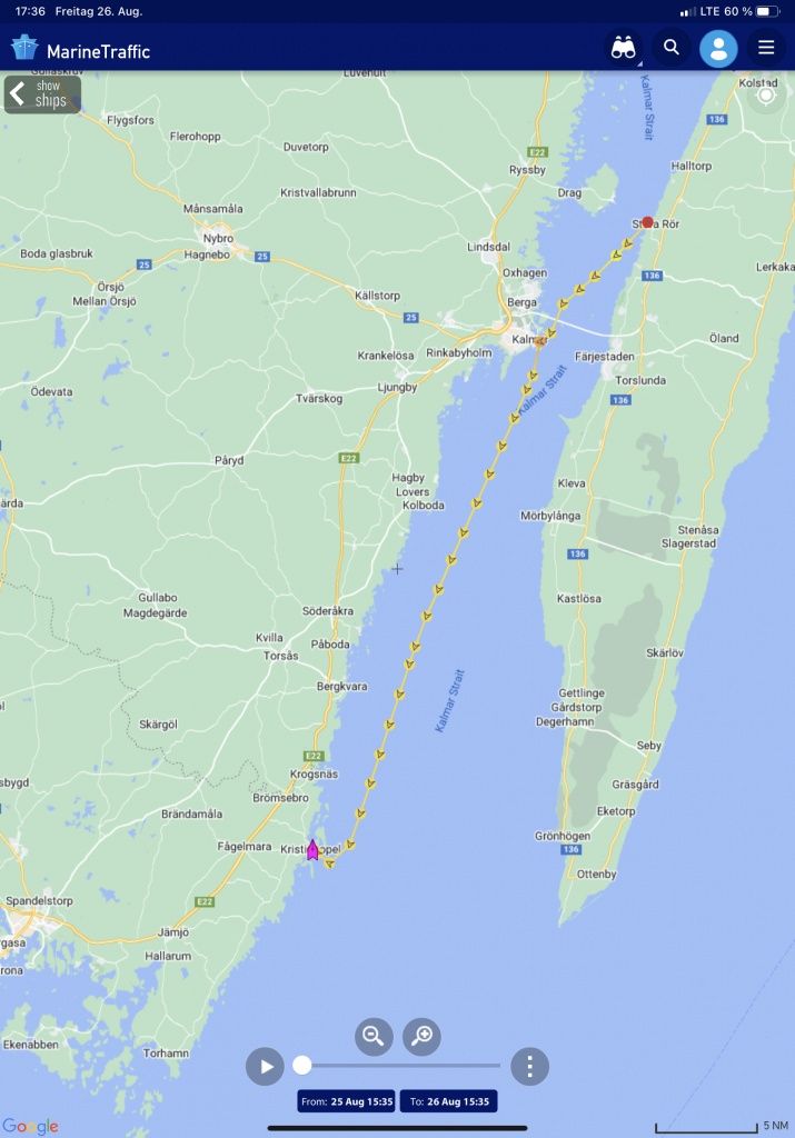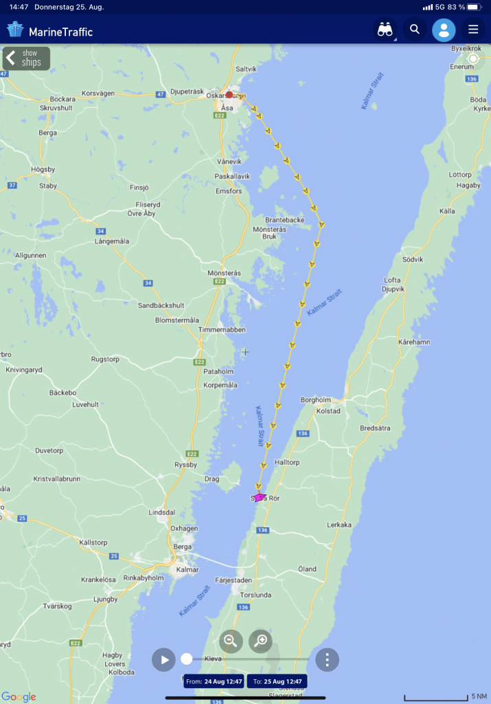 Und da ist schon wieder alles anders. Mittwoch (24.08.) ist ab Mittags kräftiger Wind aus NordNordOst – nicht zu verwechseln mit Nord Nord Mord oder Nord bei Nordwest 🥴📺 – im Kalmarsund angesagt. Bis dahin sind wir aber nicht an unserem nächsten Hafen angekommen. Die Windrichtung wäre ja soweit ok, wir hätten dann einen Vorm-Wind-Kurs, mit etwas Glück einen Raumschots-Kurs, aber wir kennen den Kalmarsund… da rauscht dann auch schnell eine ordentliche Welle mit dem Wind gen Süden und macht die Tour nicht unbedingt kommod. Da genießen wir doch lieber das wieder richtig sonnige Wetter im Hafen und schauen uns die hübschen Häuschen der Altstadt nochmal genauer an. Der Rest der Stadt… naja, eine Stadt halt. Und dann – große Freude – eine Nachricht von…? Wer errät es? 🫥🤔
