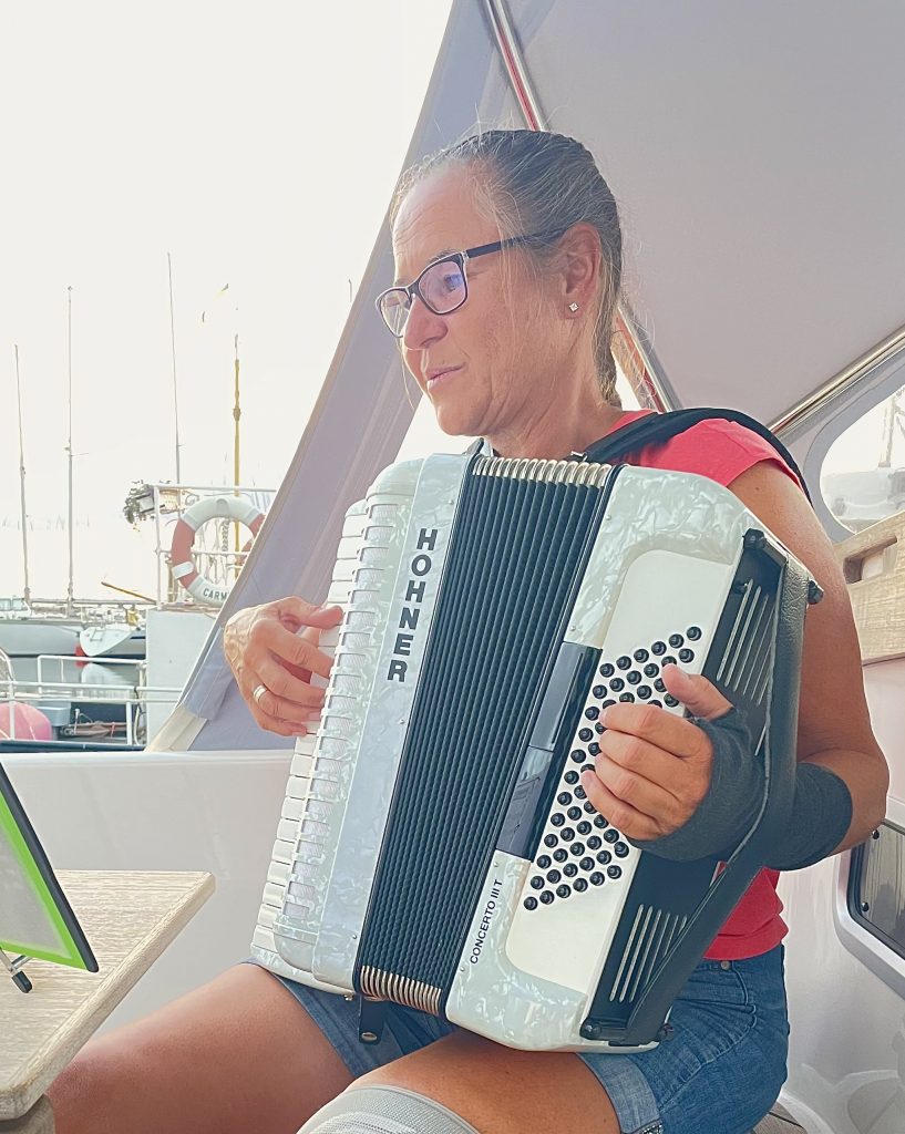 Am Abend versuchen wir uns mal wieder an etwas maritimer „Schiffs-Musik“ 🪗🎶 , die uns sogar zwei Kaltgetränke beschert. Zwei Campern – wie in fast jedem Hafen ist auch hier ein Wohnmobil-Stellplatz in der Nähe – hat Hans Albers zum Sonnenuntergang so gut gefallen, dass sie anschl. am Schiff klopfen und sich bedanken. Wie nett!